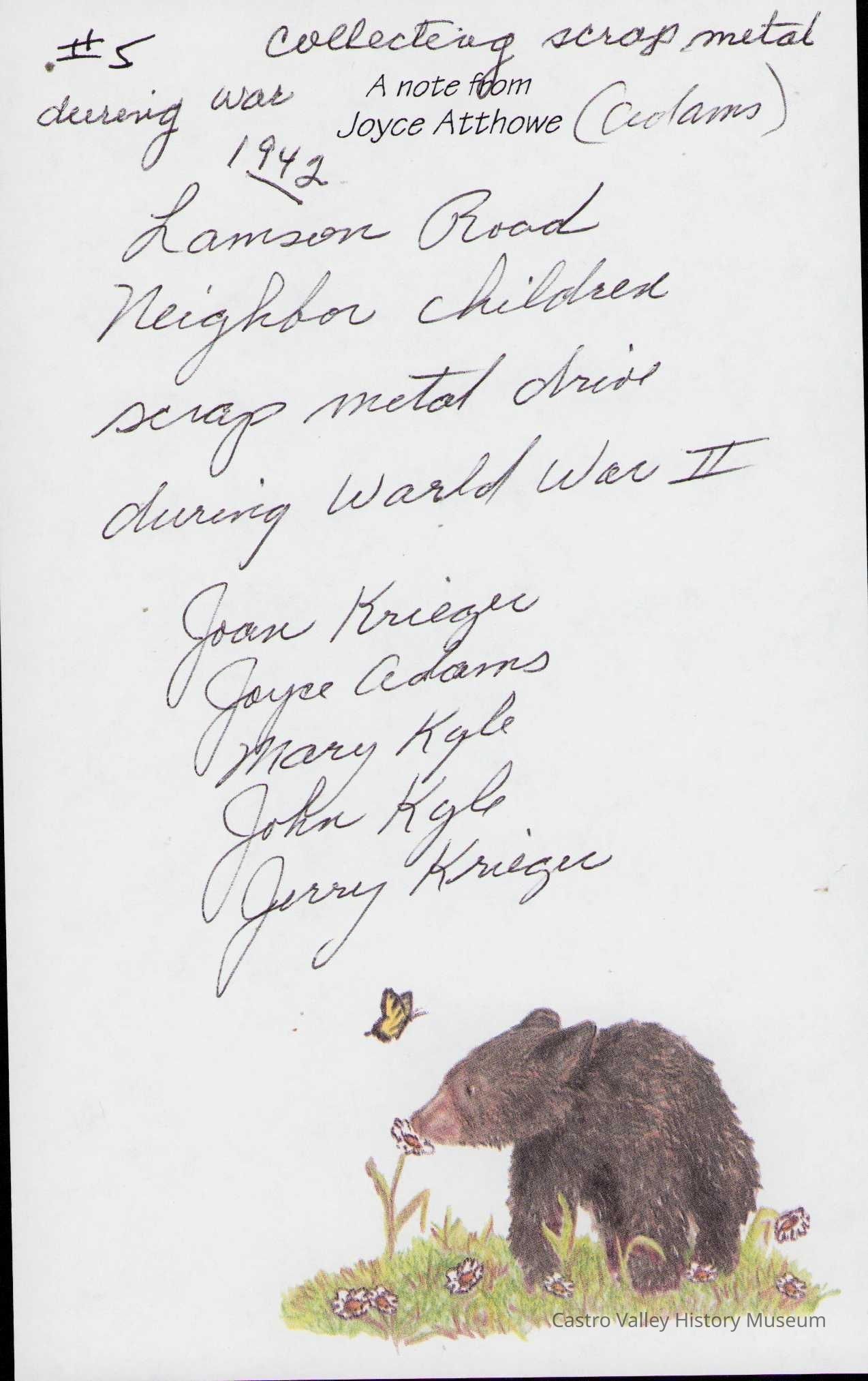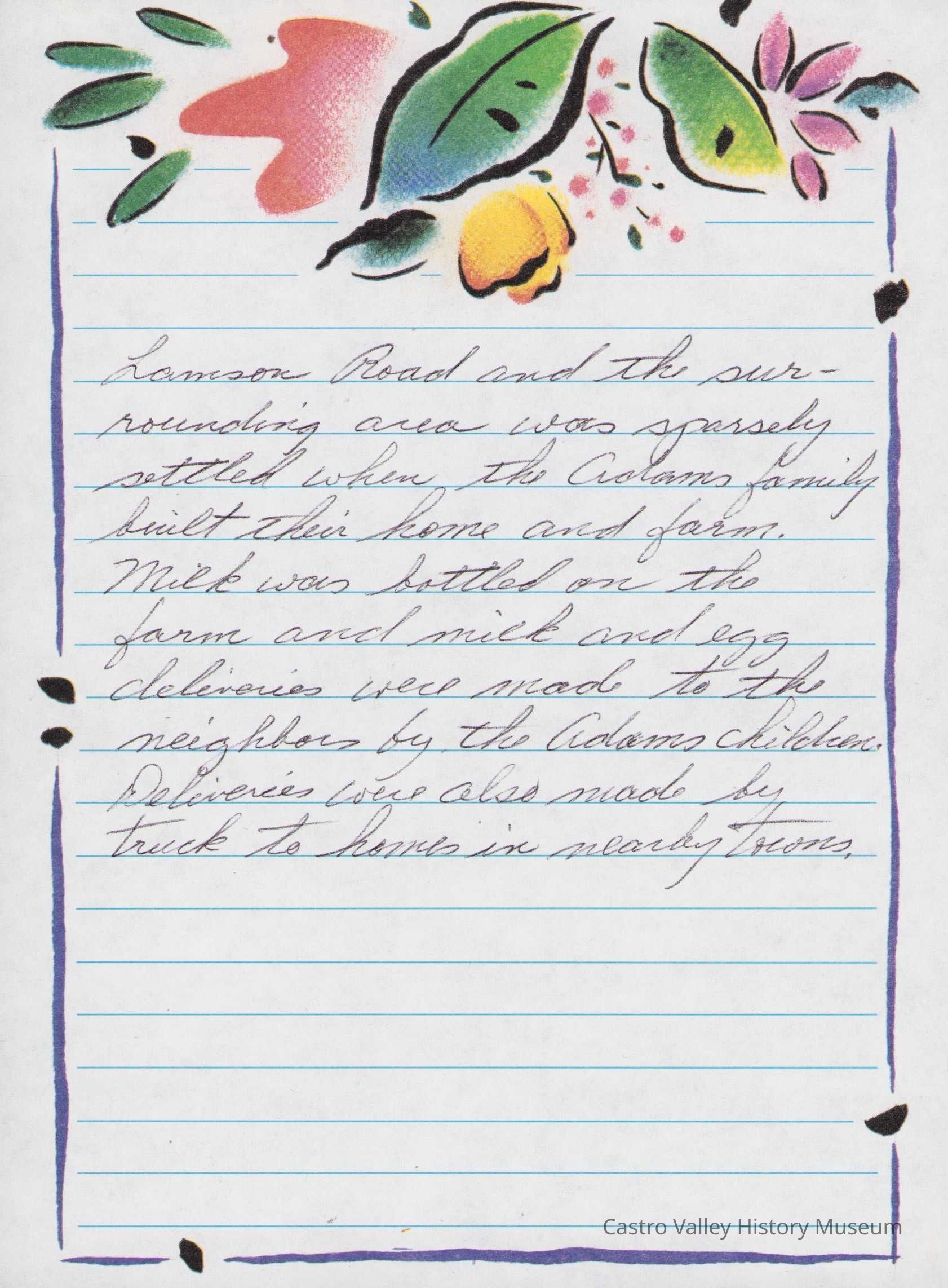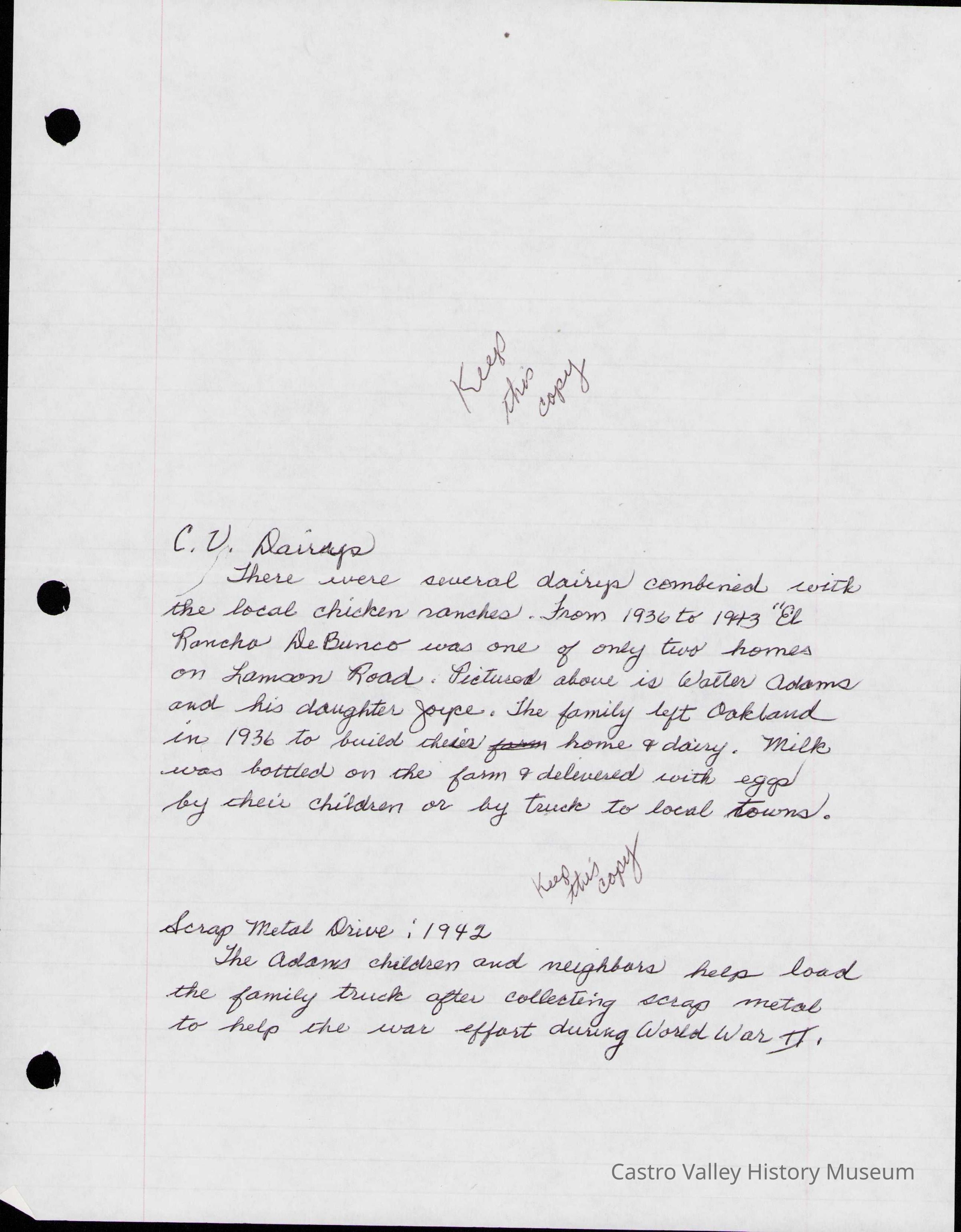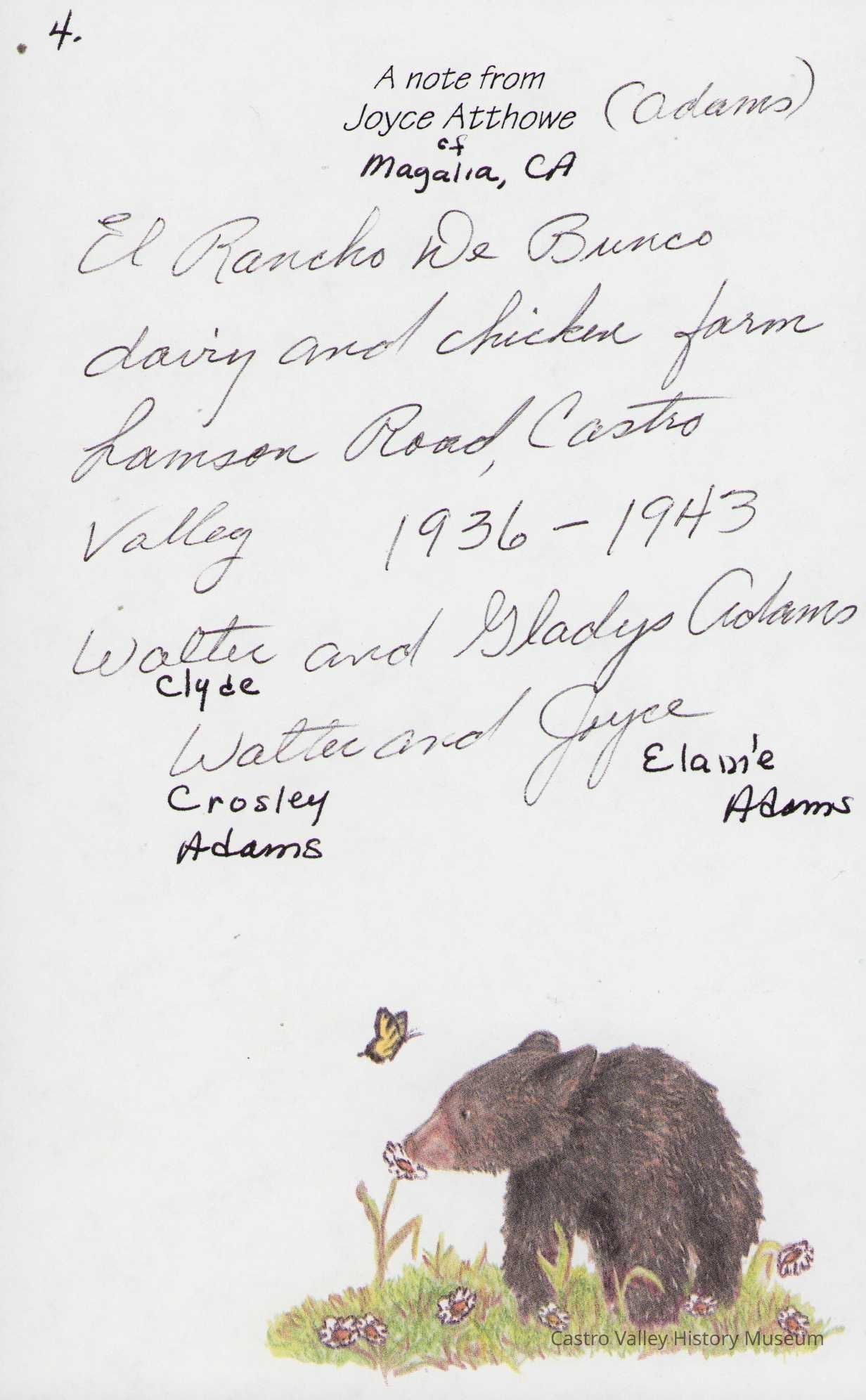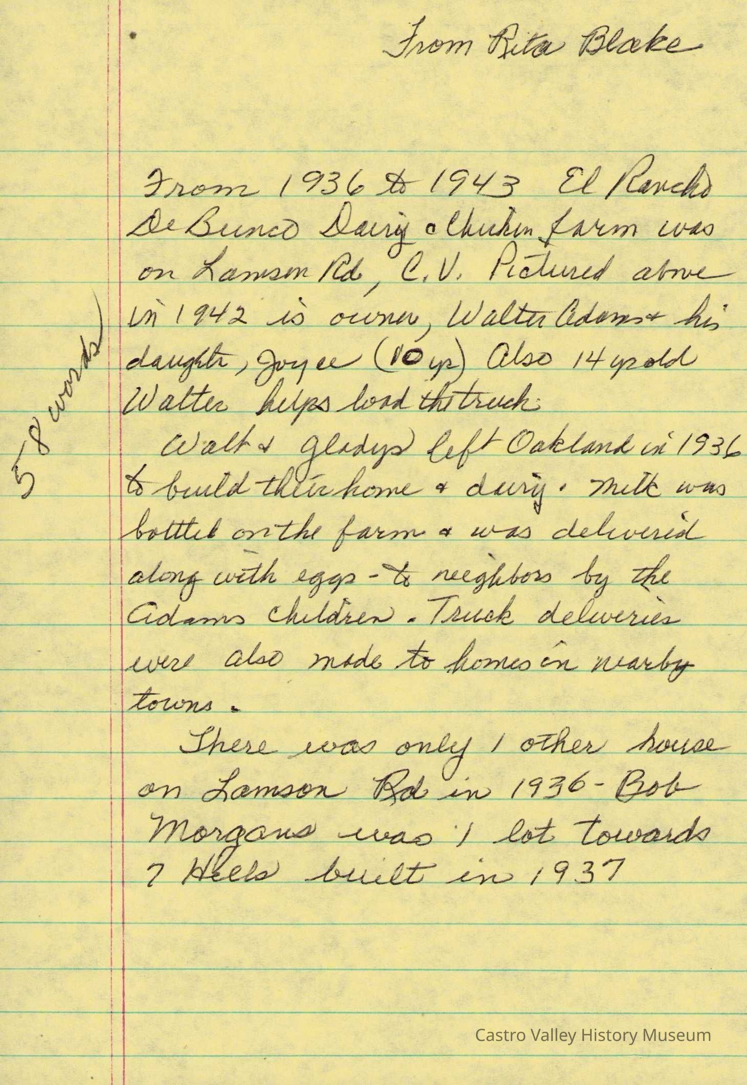 Photographs and handwritten notes related to the Adams family dairy on Lamson Road, also known as El Rancho deBunco. Descriptions of Walter and Gladys Adams, son Walter Jr and daughter Joyce.Collection