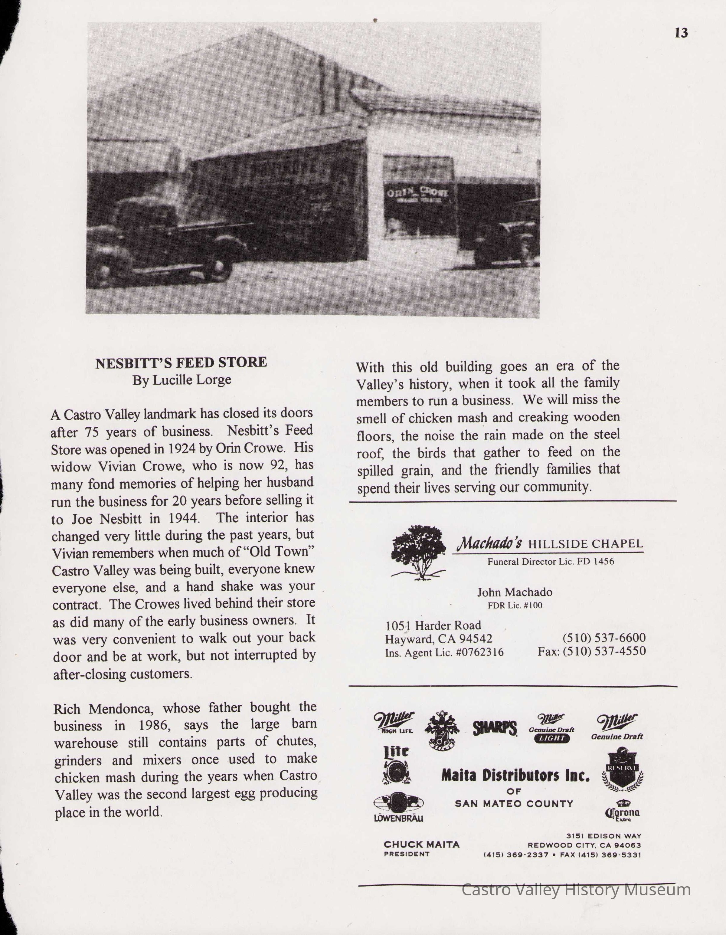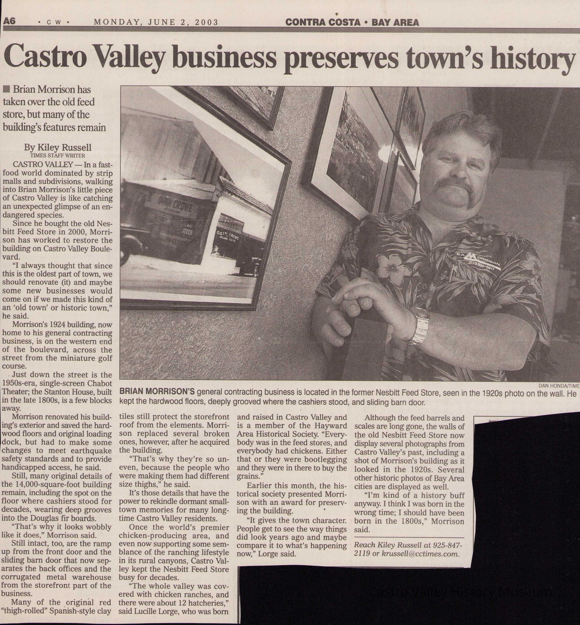 Photos and articles on B. A. Morrison, General Contractor's building. The site was formerly the location of Orin Crowe Feed Store followed by Nesbitt's Feed Store. Includes an article by Lucille Lorge on the history of the location as well as articles from the Castro Valley Forum and the Contra Costa Times.Collection