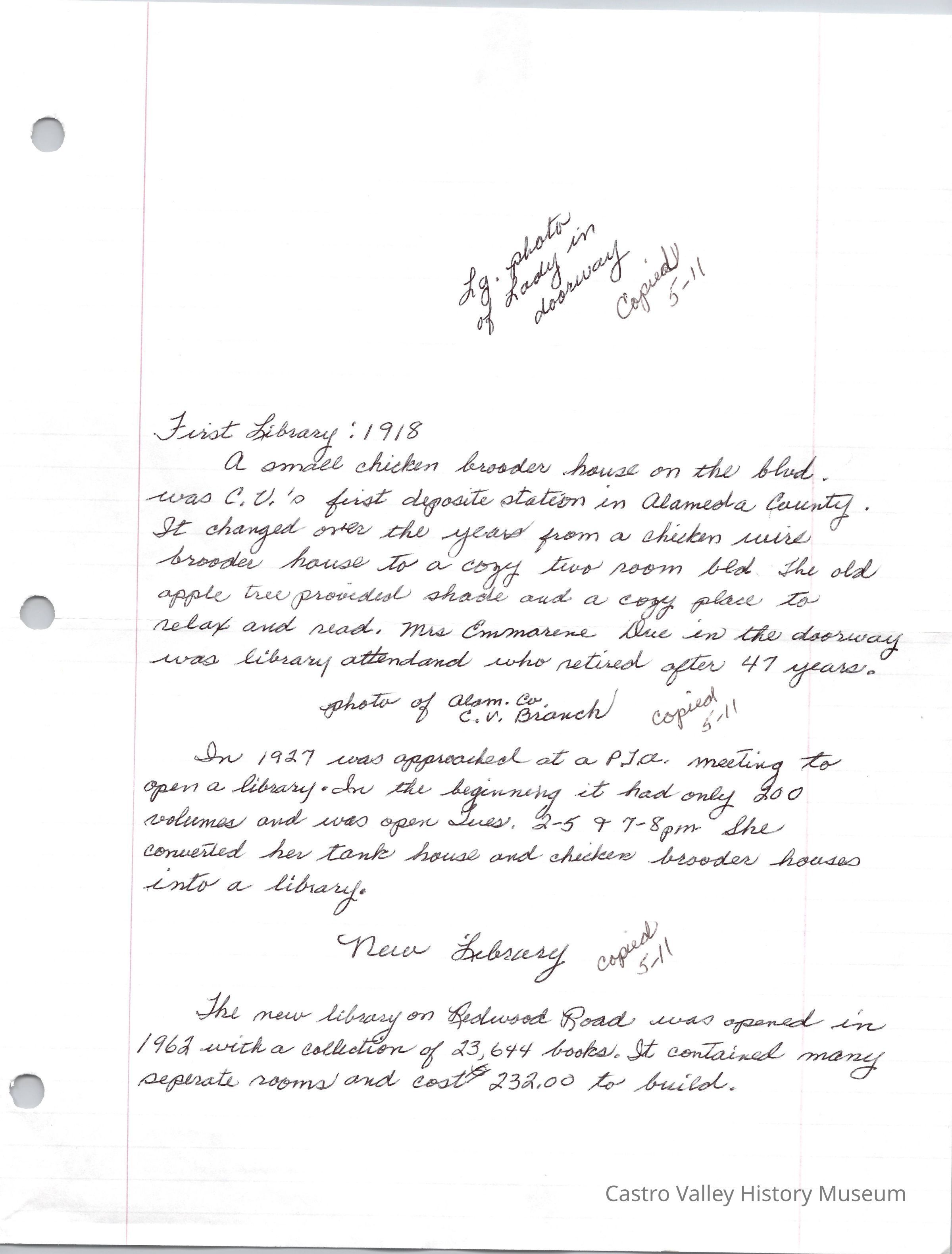 A handwritten brief history of the Castro Valley Library from the first building in 1918 to the library that opened in 1962.