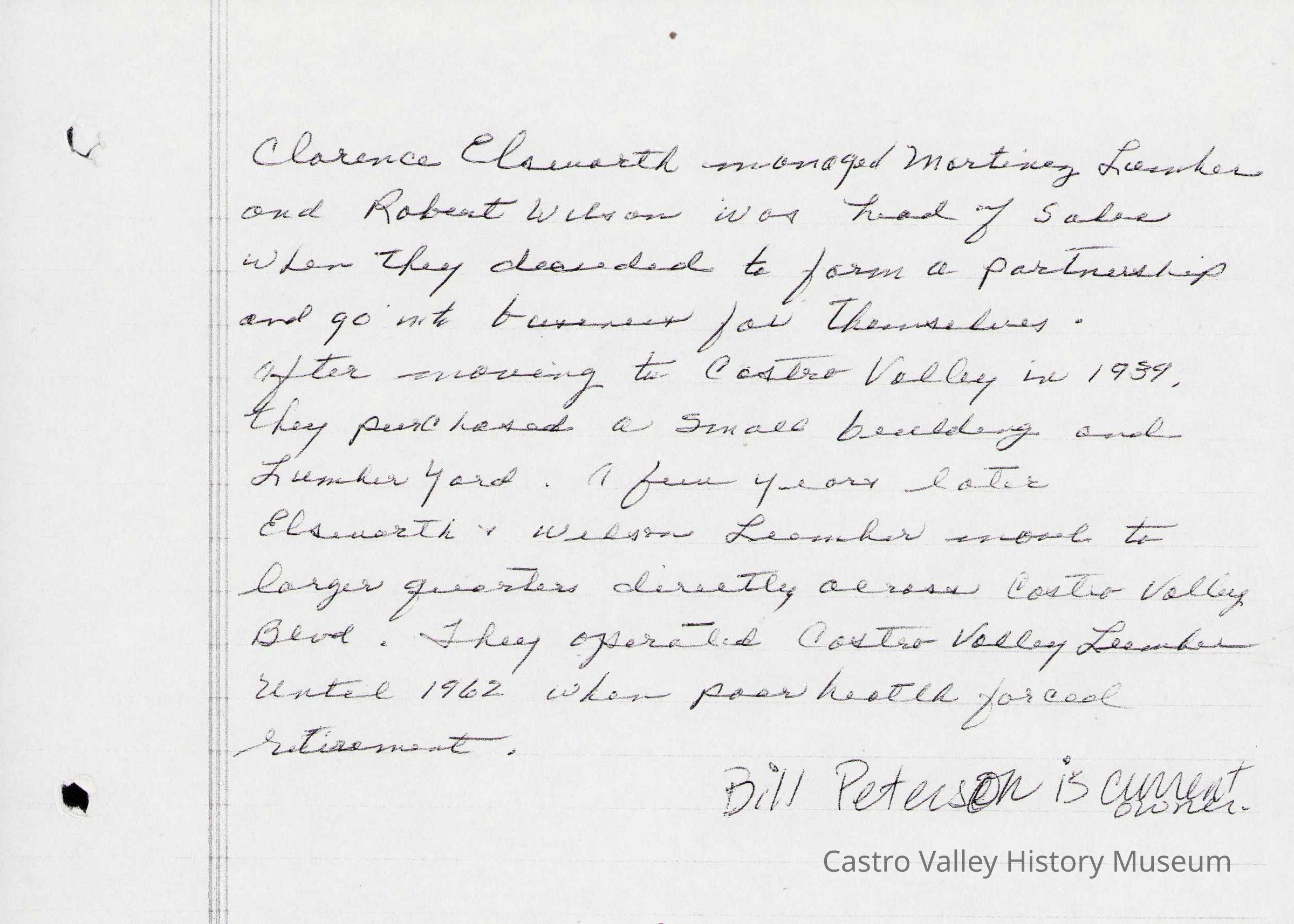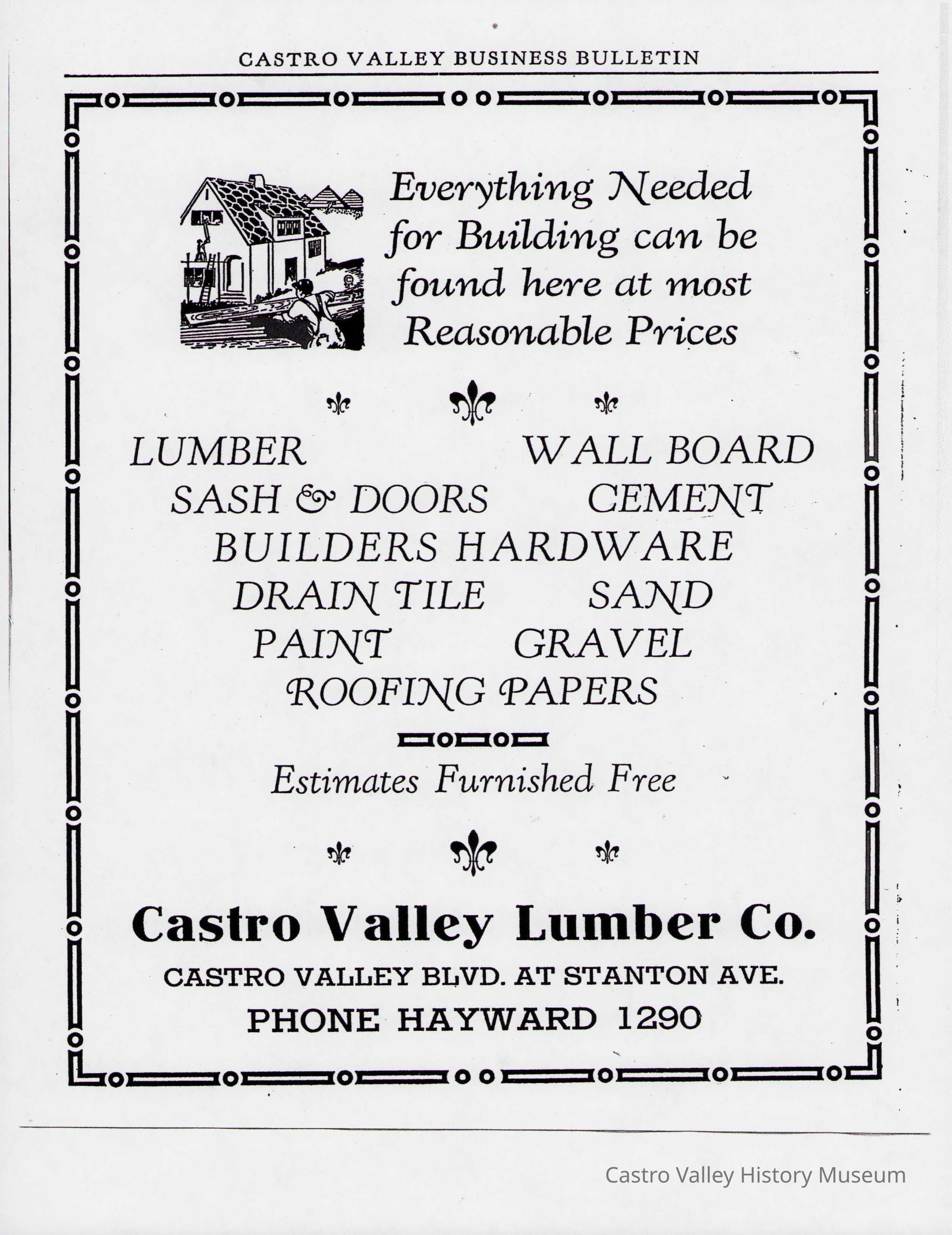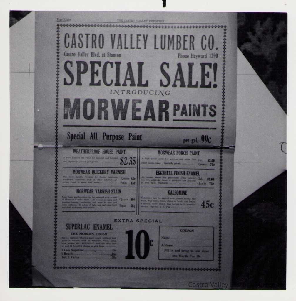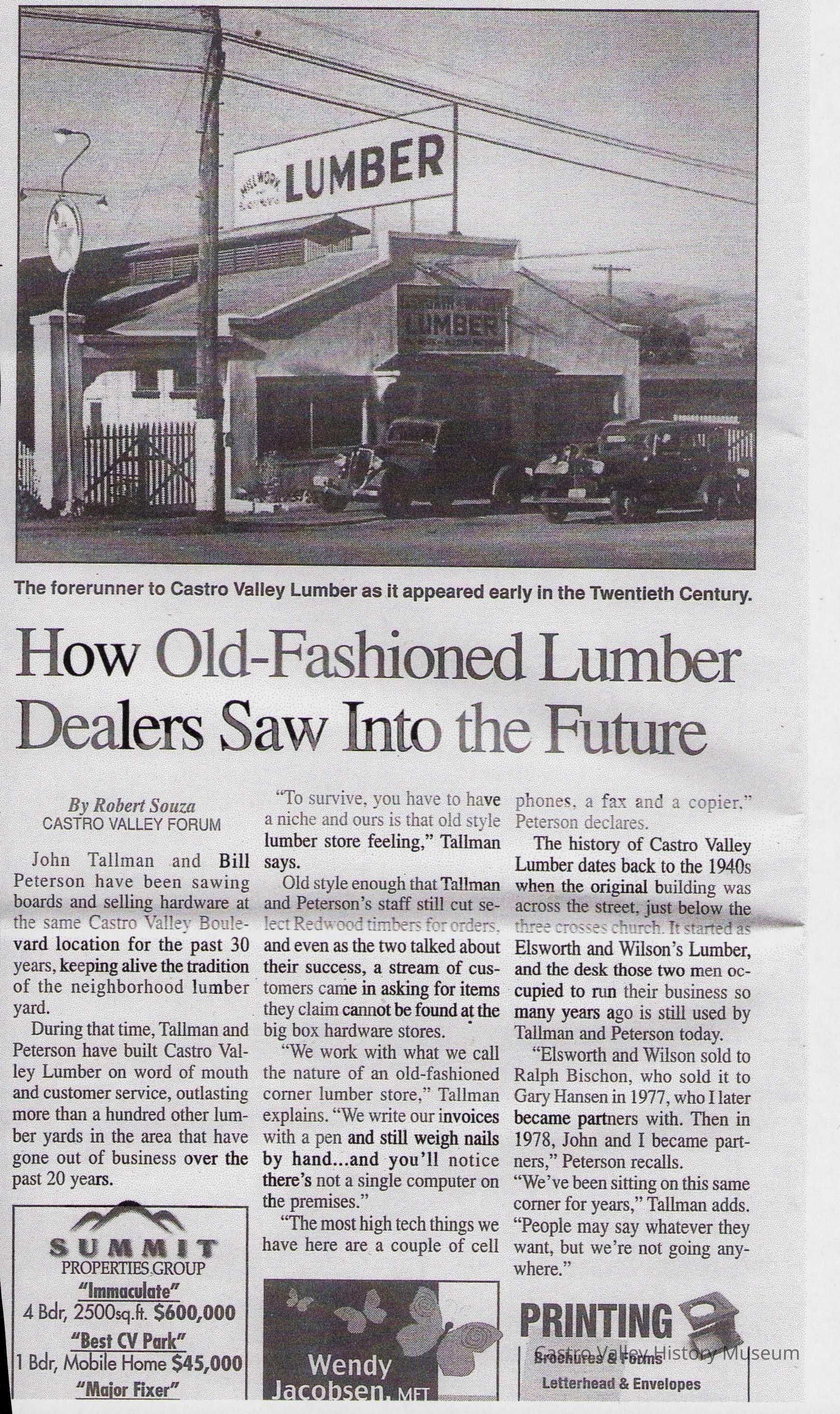 Newspaper articles, other documents and photos on the history of Castro Valley Lumber. Includes an article from the California Historical Society Quarterly from March 1951 and an advertisement from the Castro Valley Business Bulletin. Also includes a Castro Valley Forum article from circa 2005 about owners John Tallman and Bill Peterson.Collection