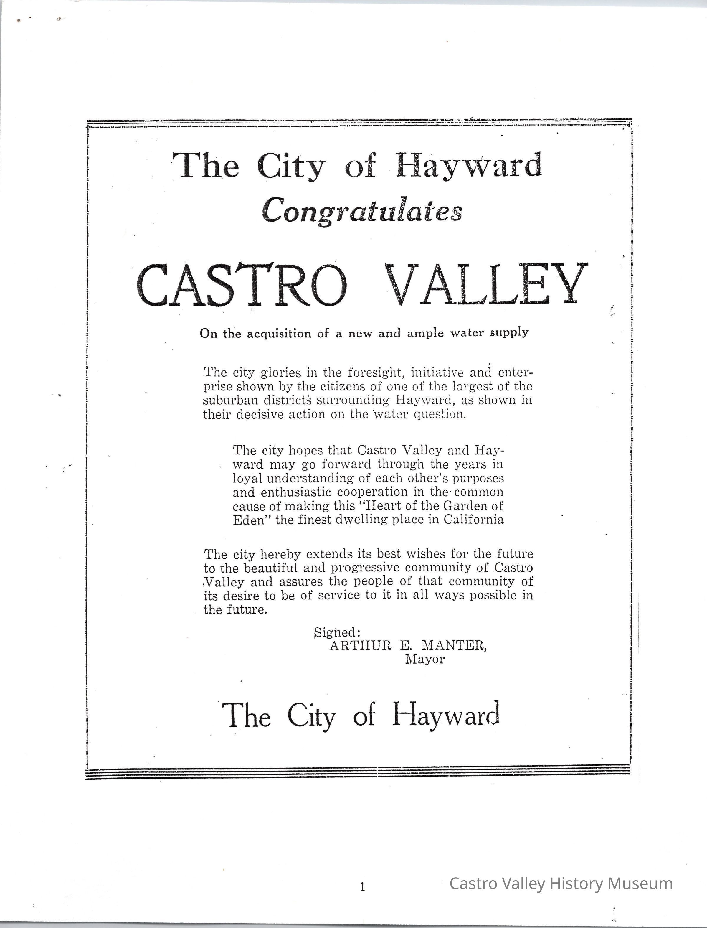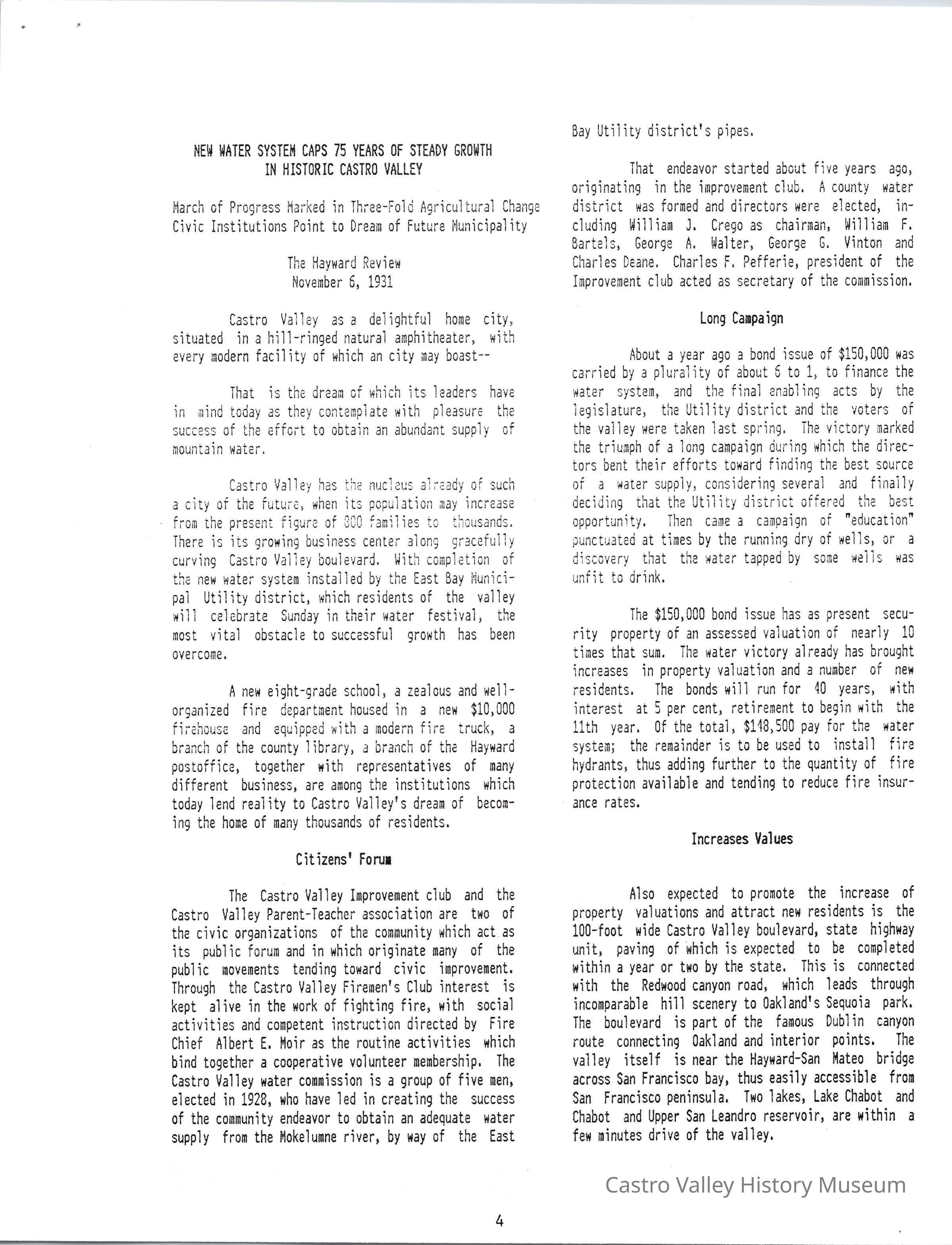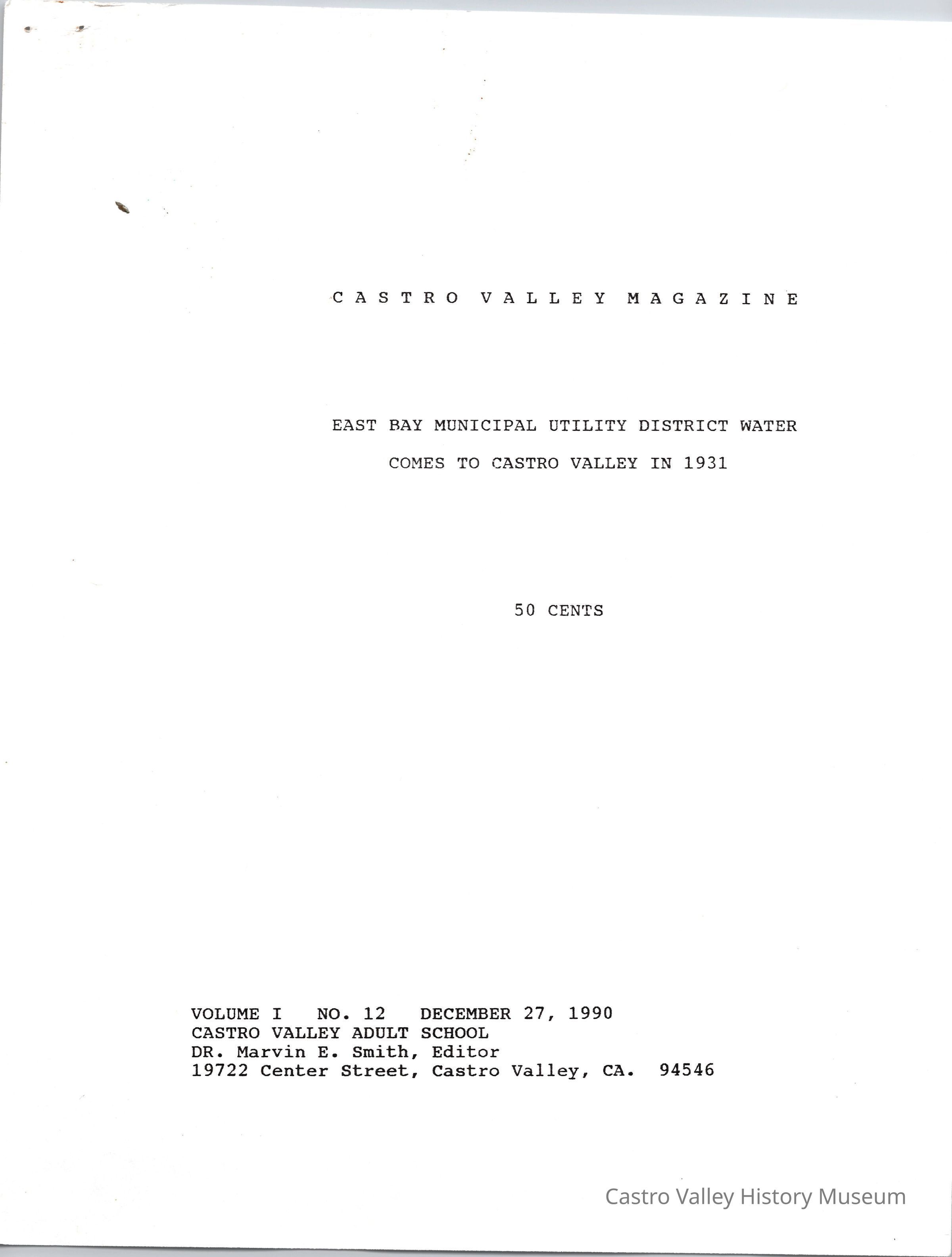 Volume 1 No. 12 of Castro Valley Magazine edited by Marvin E. Smith. Includes congratulations from Hayward mayor Arthur E. Manter on Castro Valley's annexation to the East Bay Municipal Utility District, and a Daily Review article on the annexation from November 6, 1931.Collection