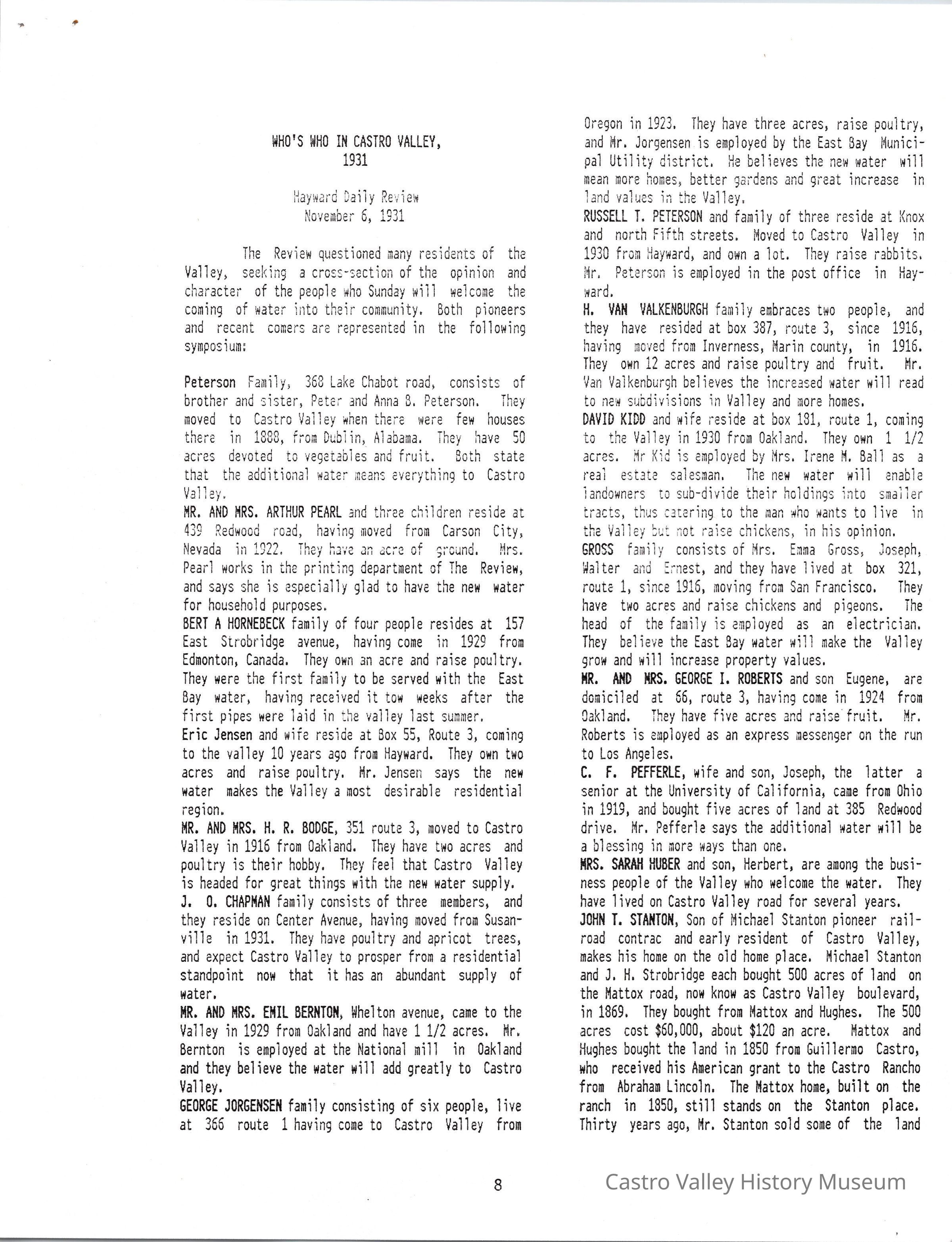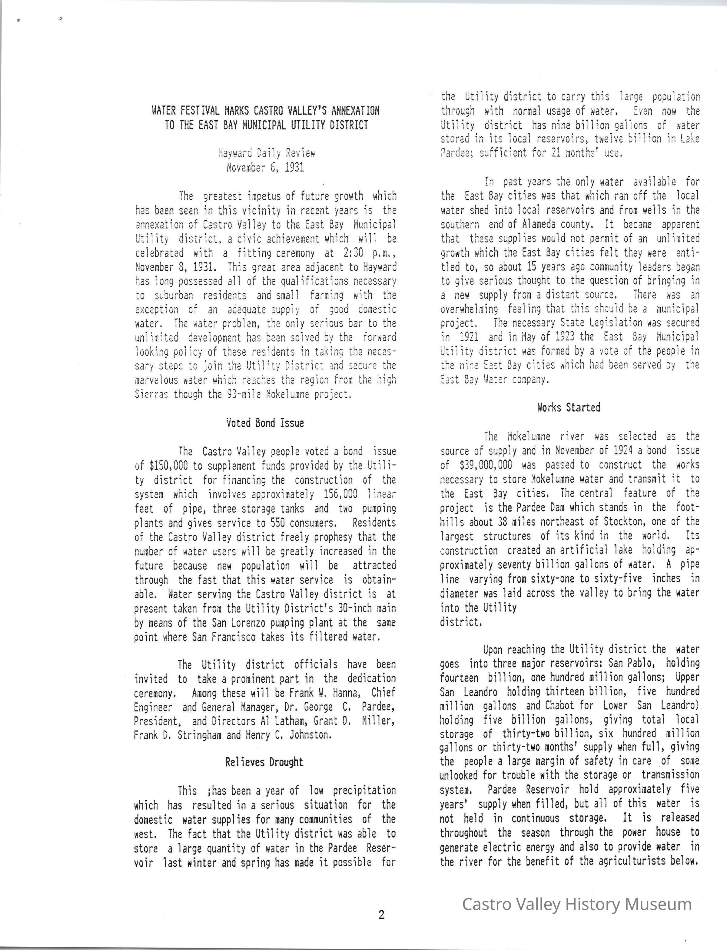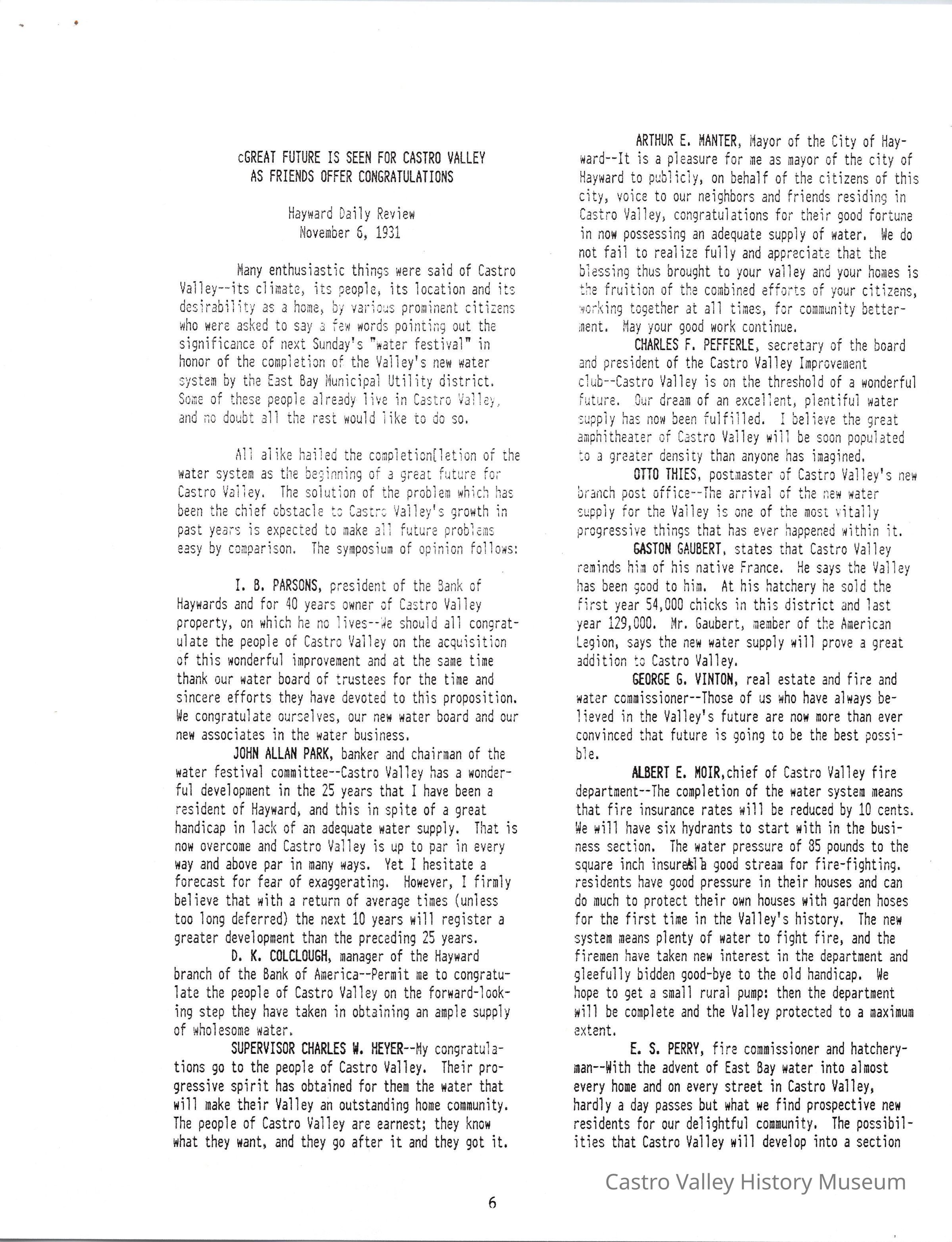 Volume 1 No. 12 of Castro Valley Magazine edited by Marvin E. Smith. Includes congratulations from Hayward mayor Arthur E. Manter on Castro Valley's annexation to the East Bay Municipal Utility District, and a Daily Review article on the annexation from November 6, 1931.Collection