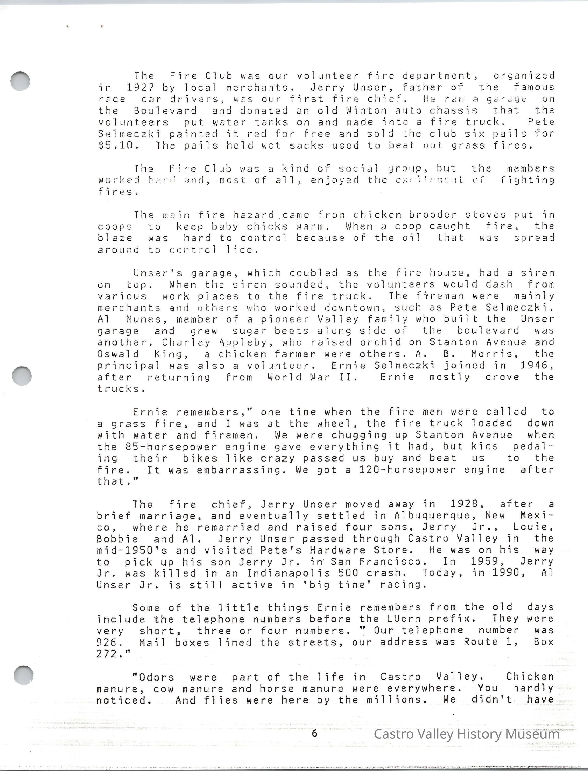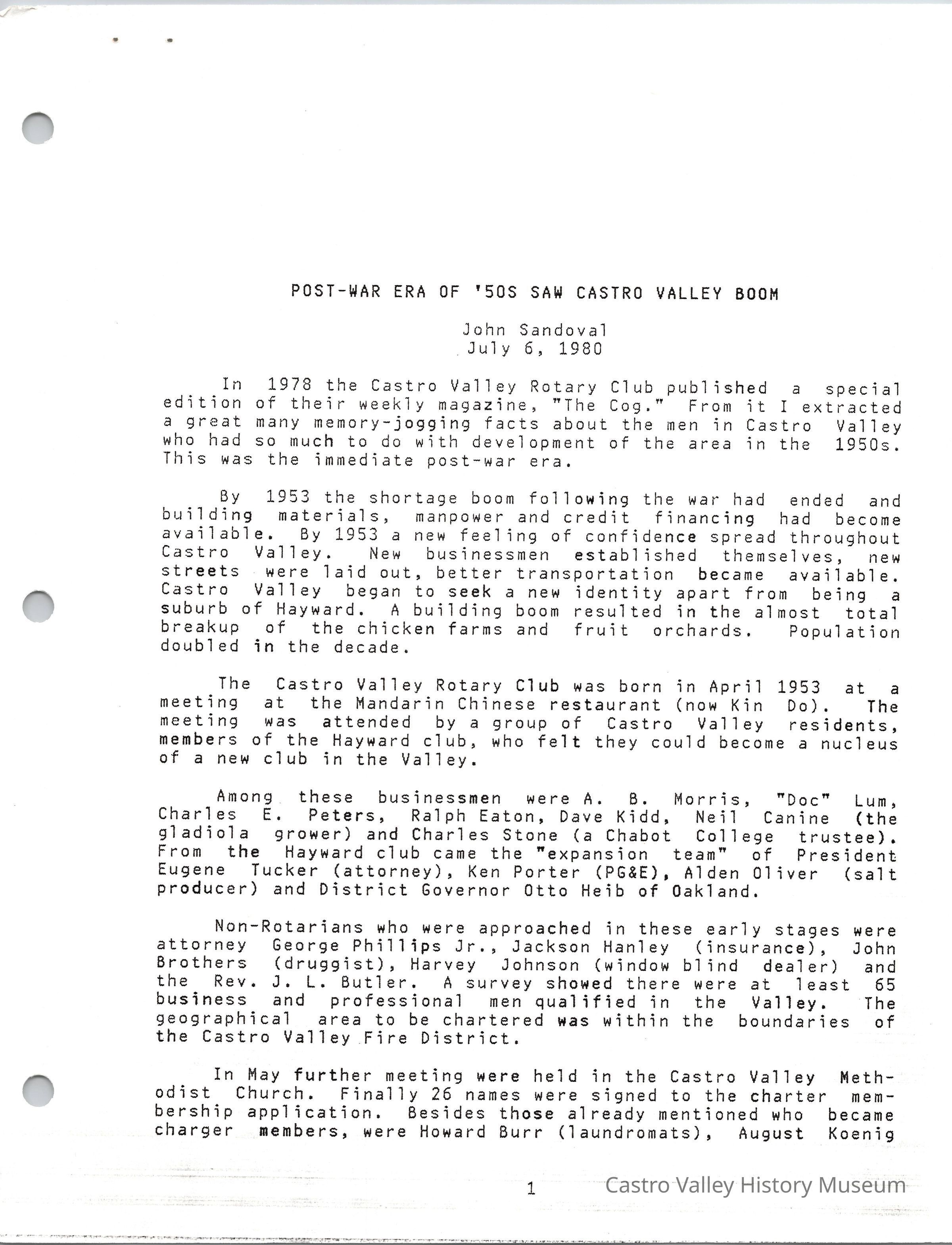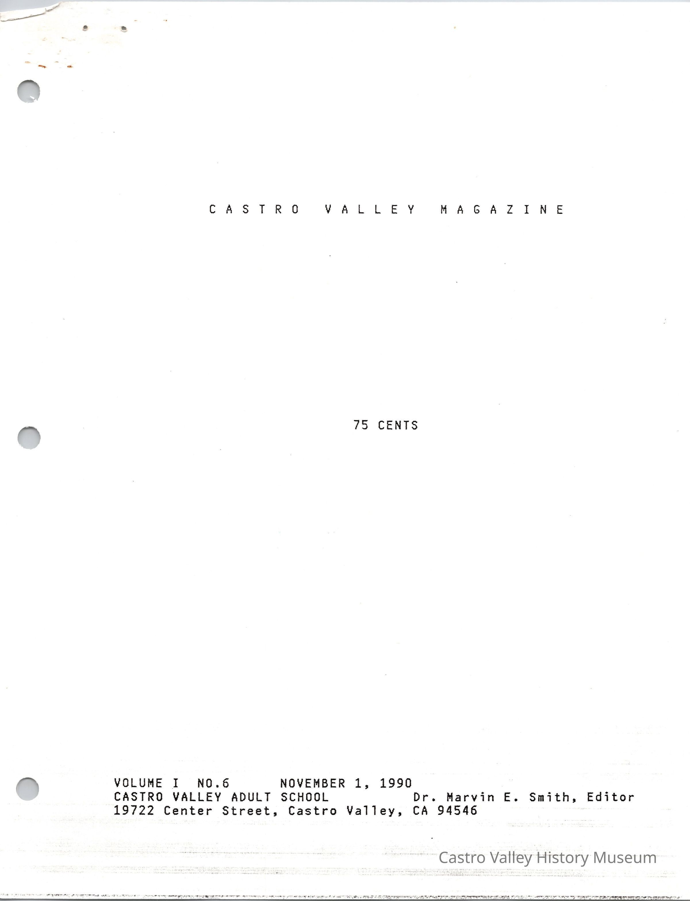 Volume 1 number 6 of Castro Valley Magazine, edited by Marvin E. Smith. Articles on several individuals - Ernest Selmeczki, Tom Bullock, George Alcorn, George Albert, and on post-war Castro Valley by John Sandoval.Collection
