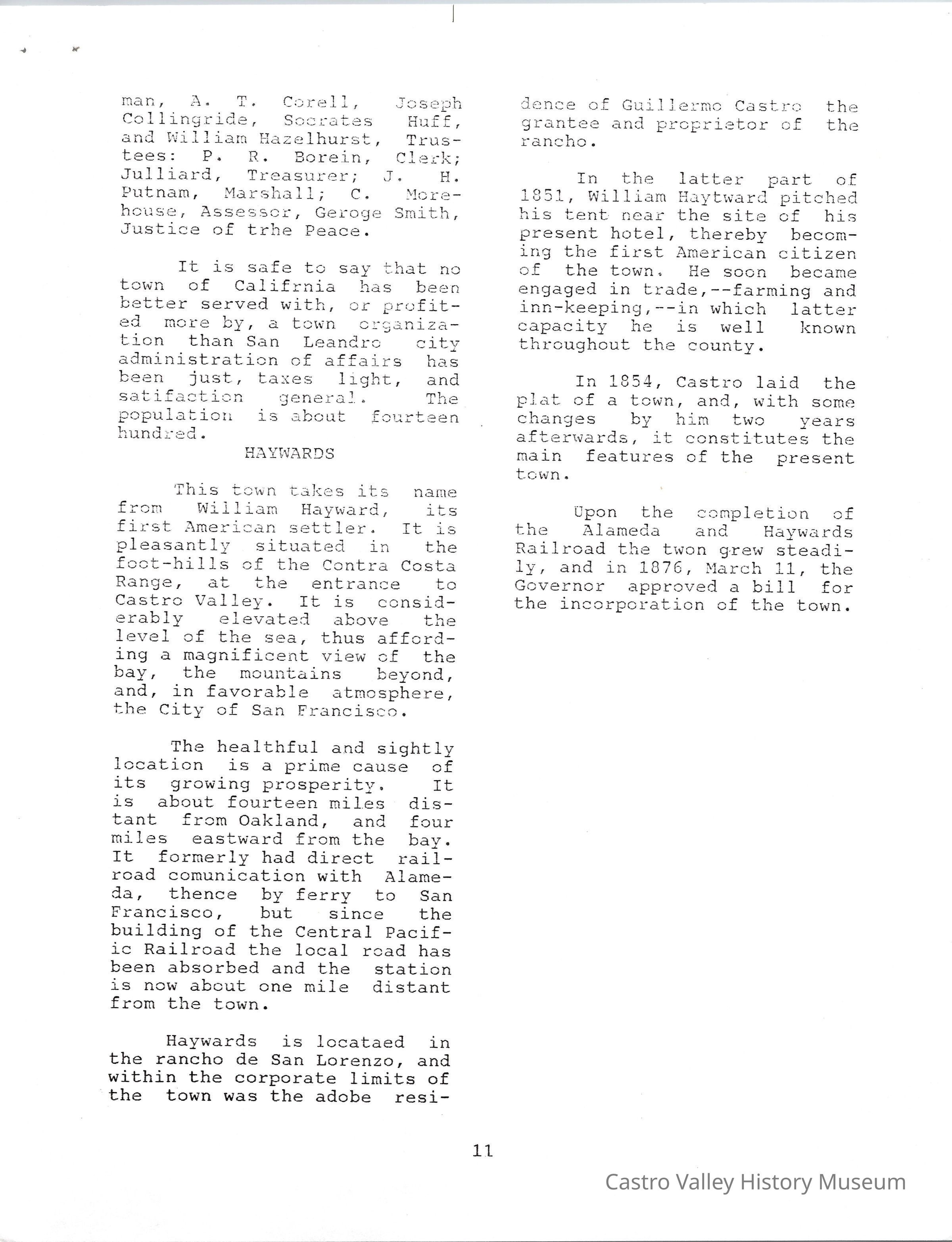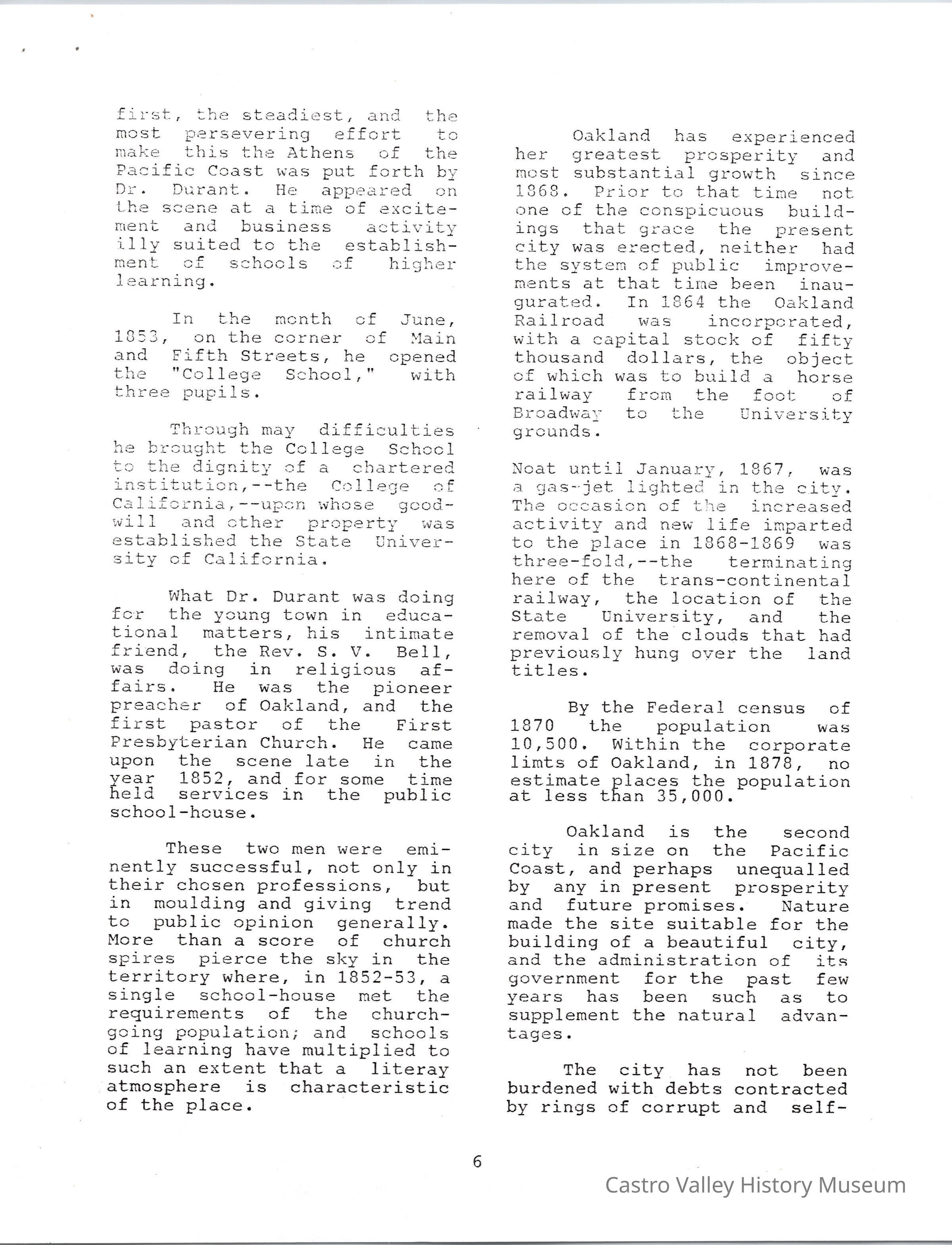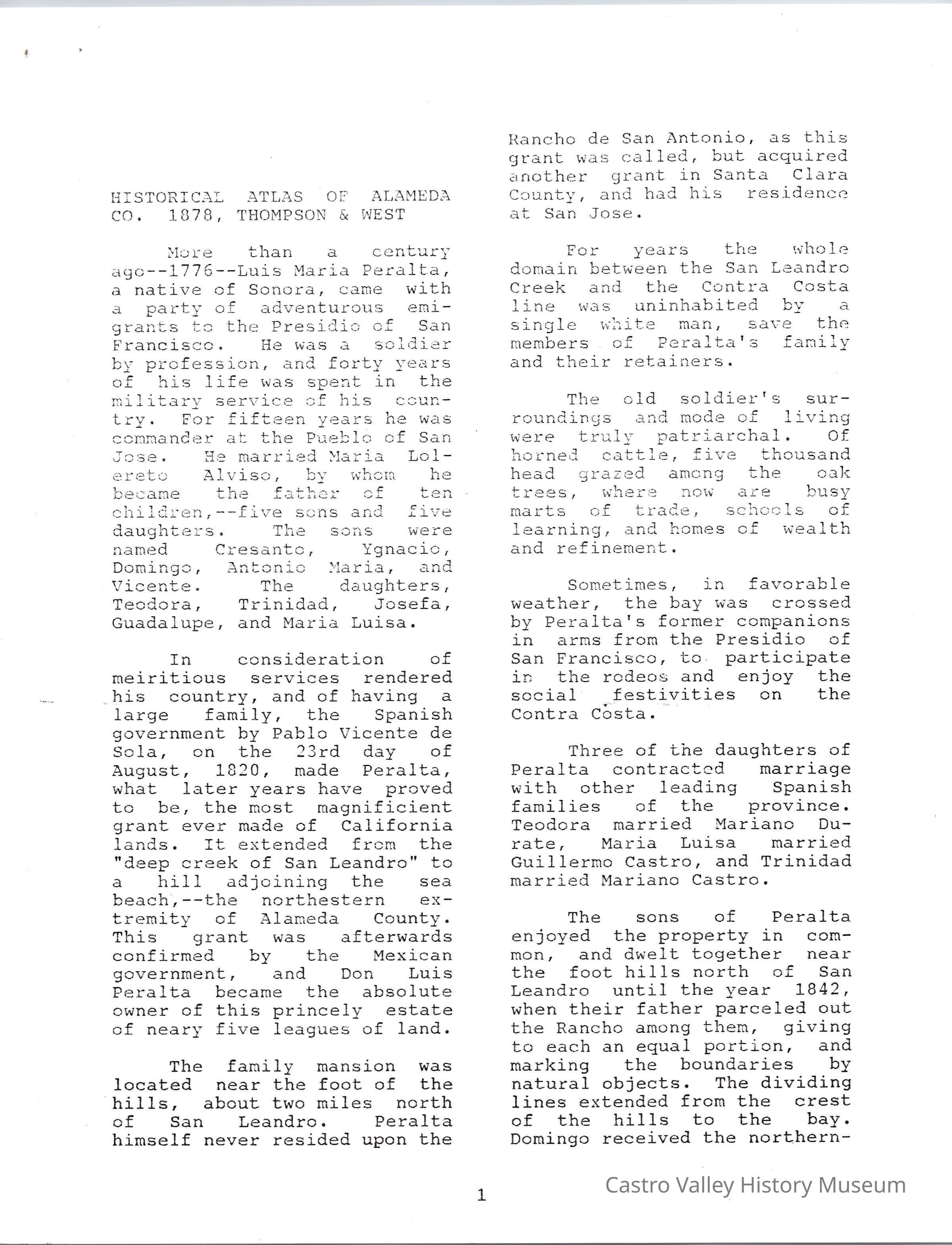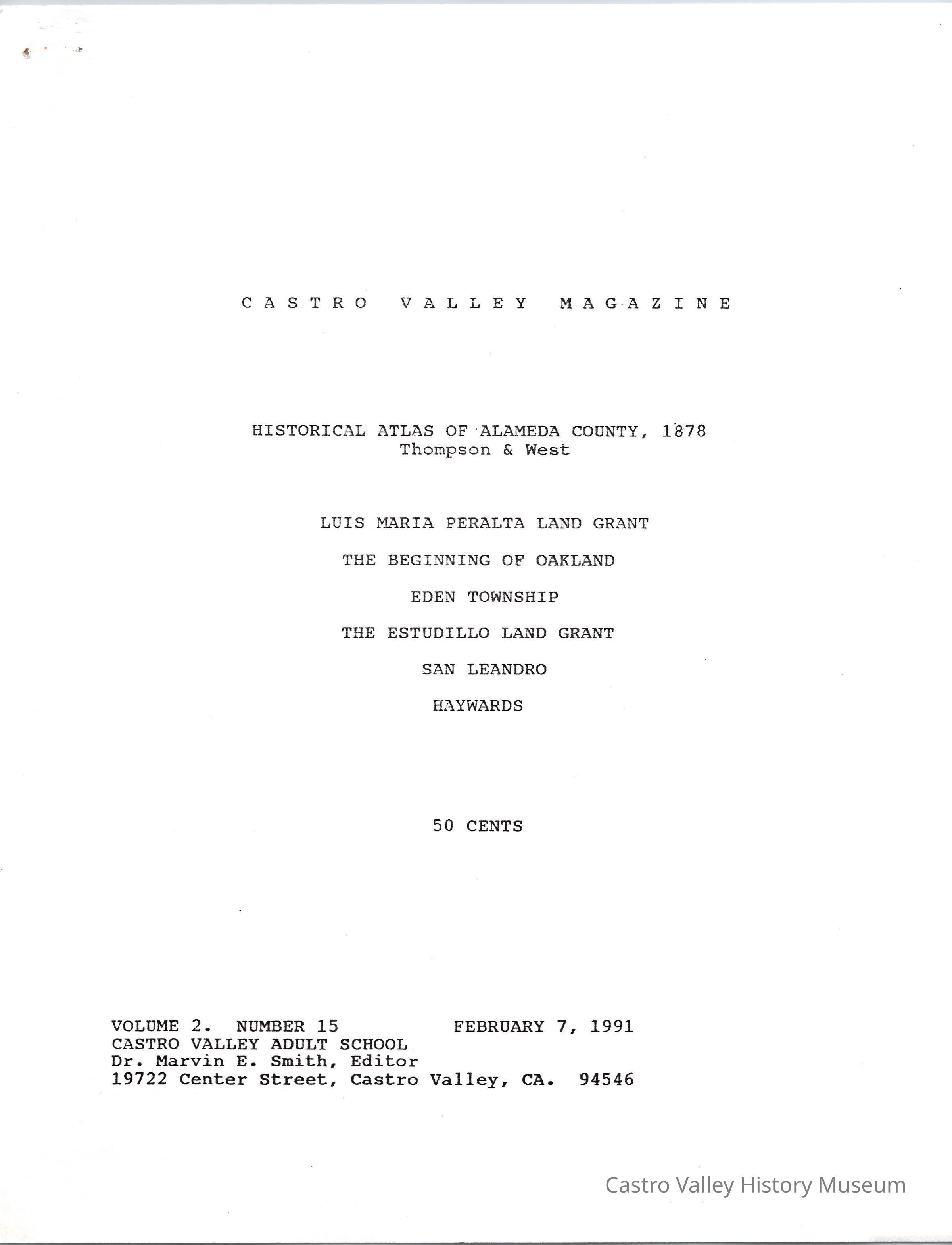 Volume 2 No. 15 of Castro Valley Magazine edited by Dr. Marvin E. Smith. Excerpts from Thompson & West Atlas of Alameda County, 1878. Subjects include Luis Maria Peralta Land Grant, The Beginning of Oakland, Eden Township, The Estudillo Land Grant, San Leandro, and Haywards.Collection