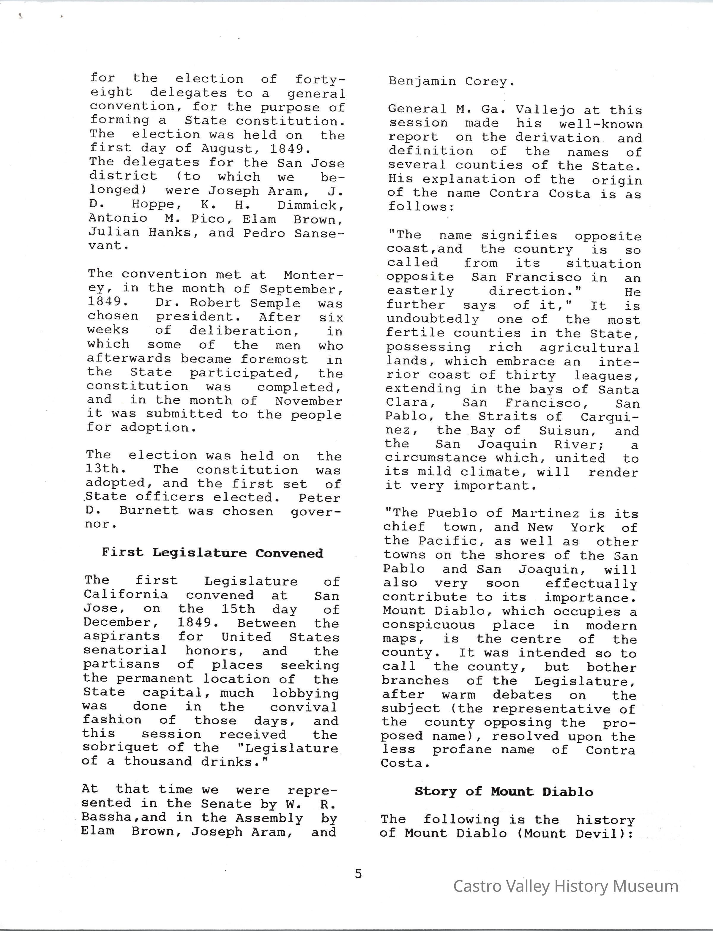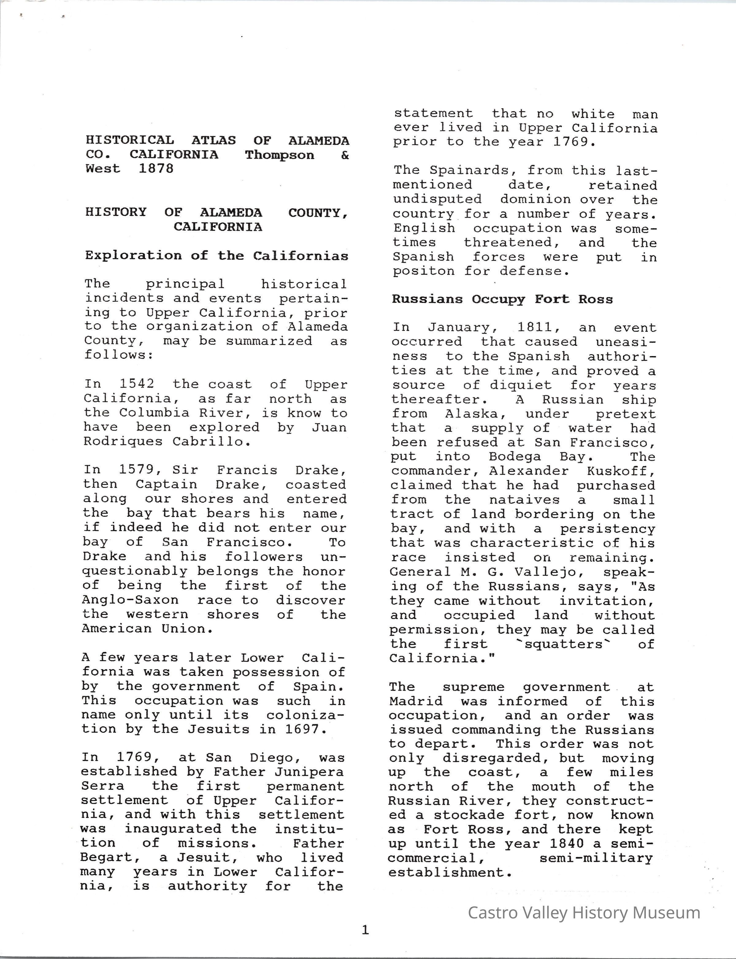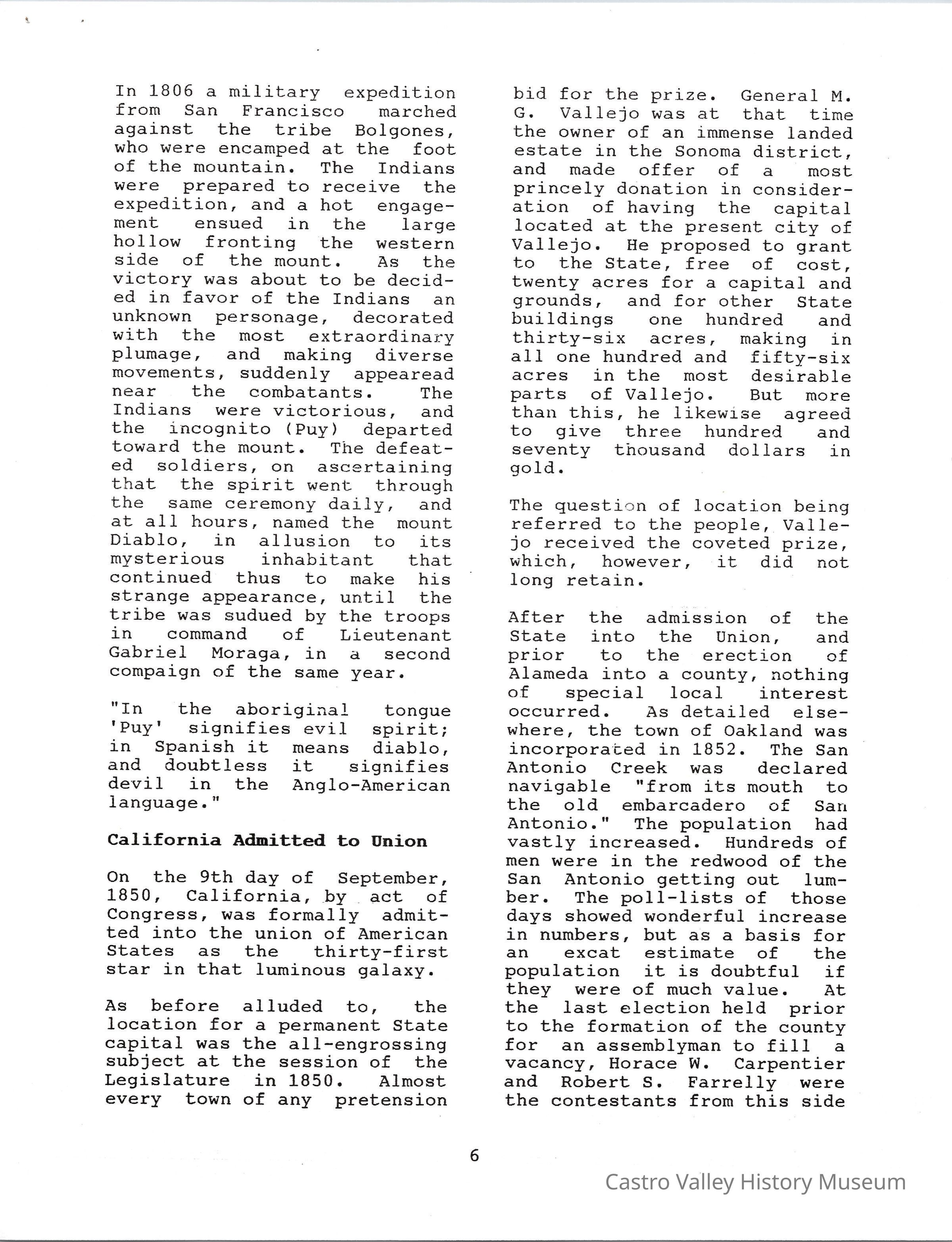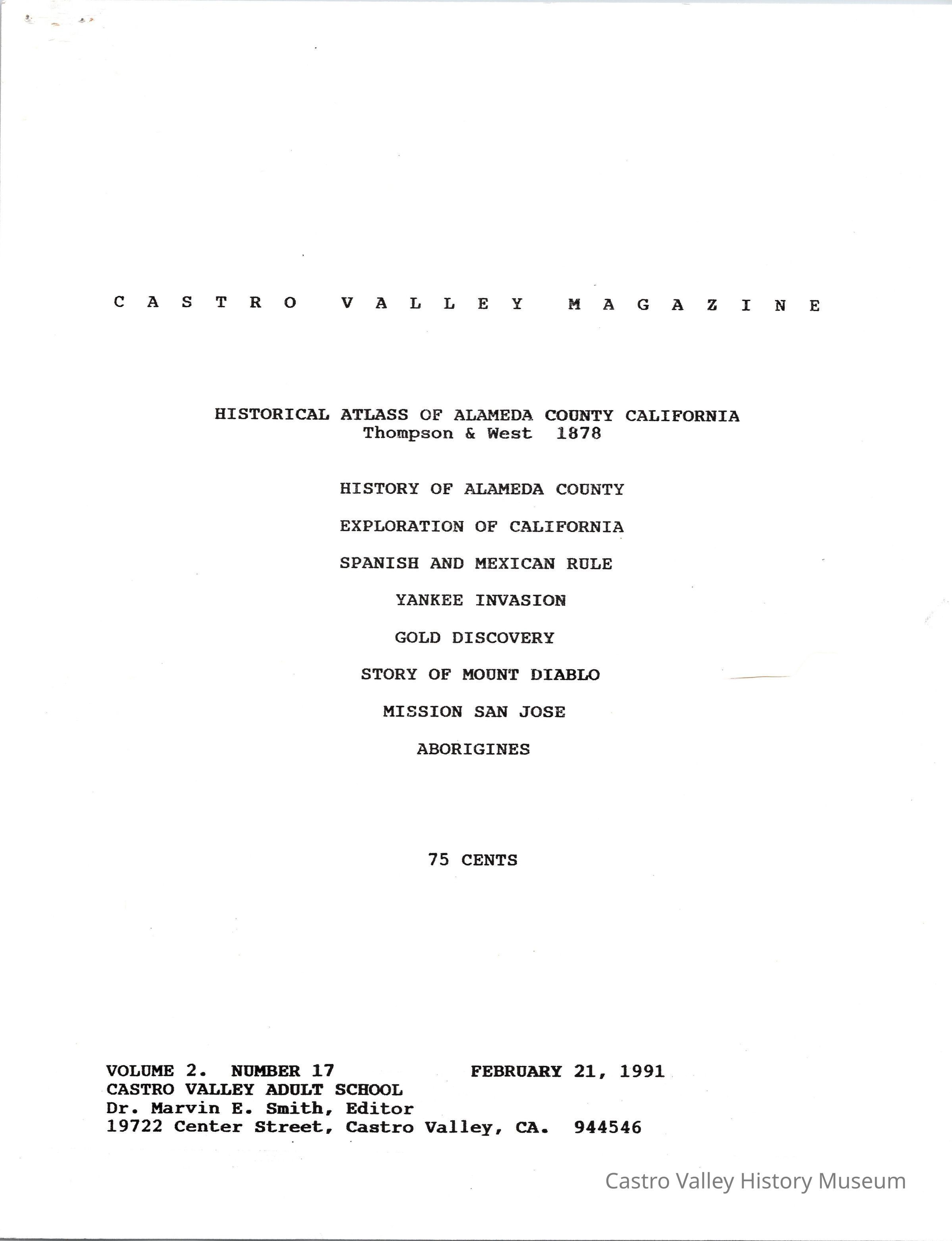 Volume 2 No. 17 of Castro Valley Magazine edited by Dr. Marvin E, Smith. Includes excerpts from Historical Atlas of Alameda County California, Thompson & West 1878. Segments include history of Alameda County, Exploration of California, Spanish and Mexican Rule, Yankee Invasion, Gold Discovery, Story of Mount Diablo, Mission San Jose, and Aborigines.Collection