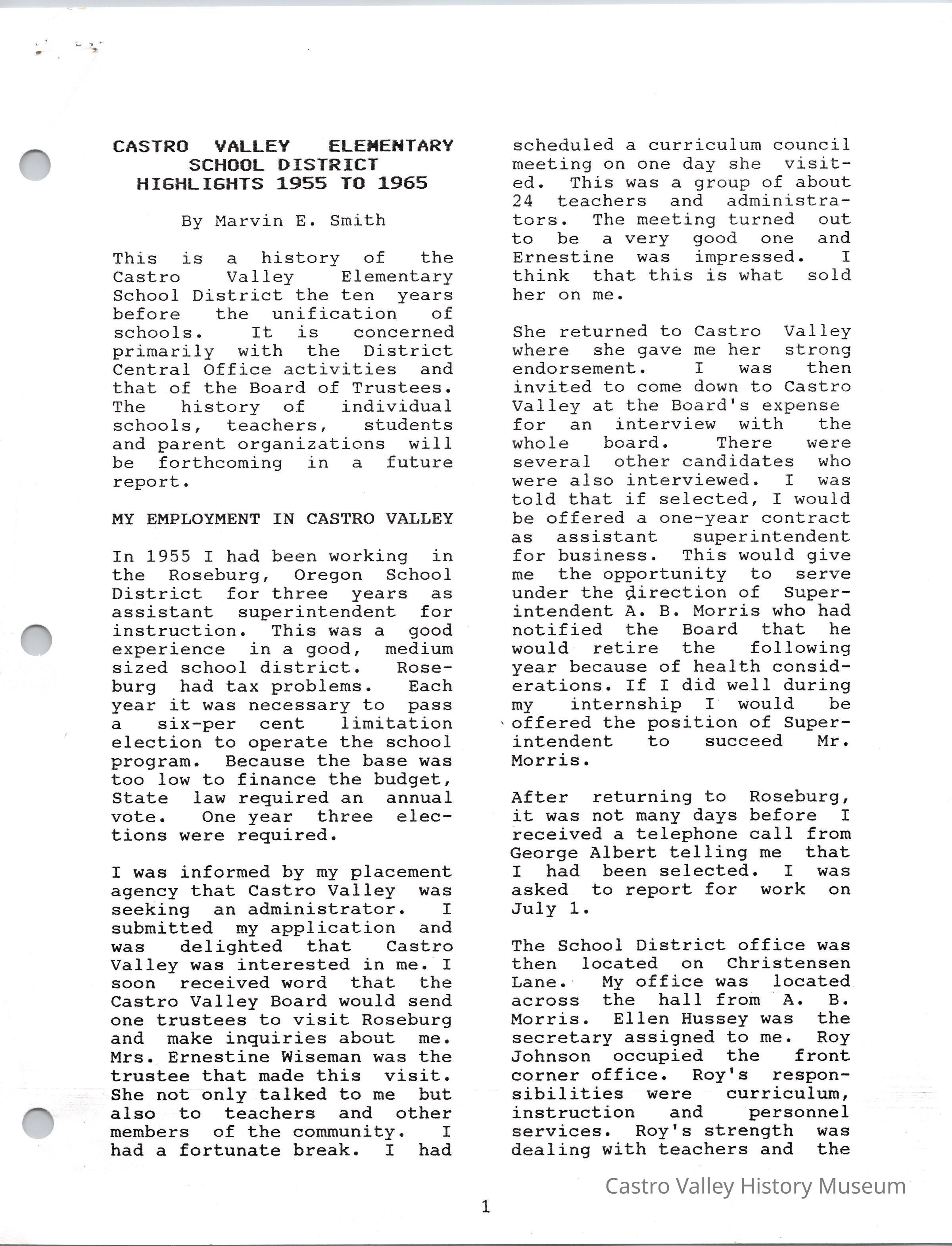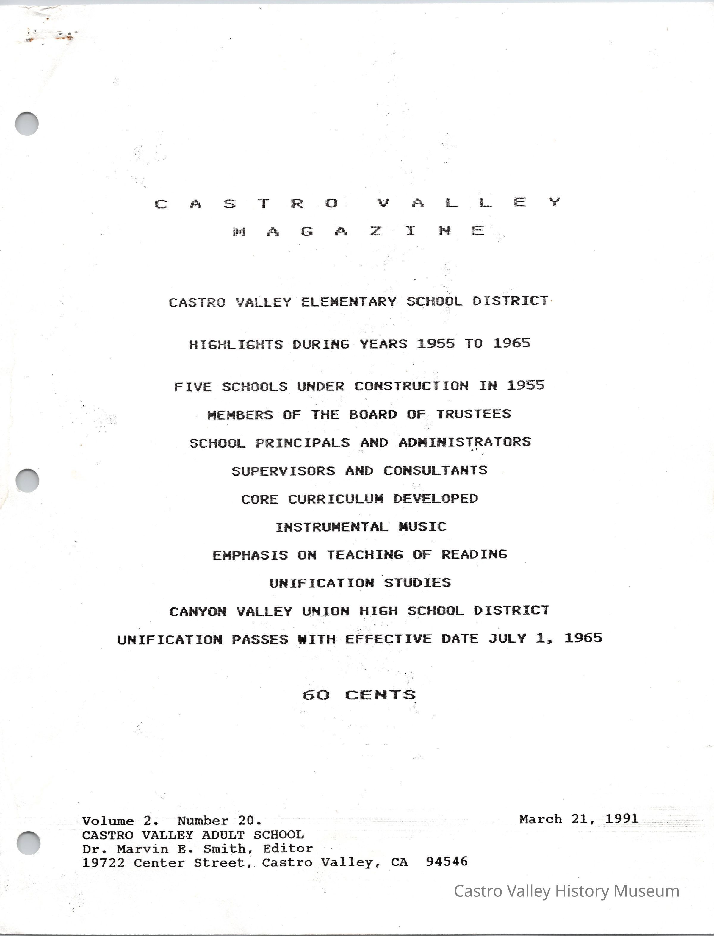 Volume 2 number 20 of Castro Valley Magazine edited by Dr. Marvin E. Smith. The issue covers highlights of the Castro Valley Elementary School District for years 1955 to 1965.Collection