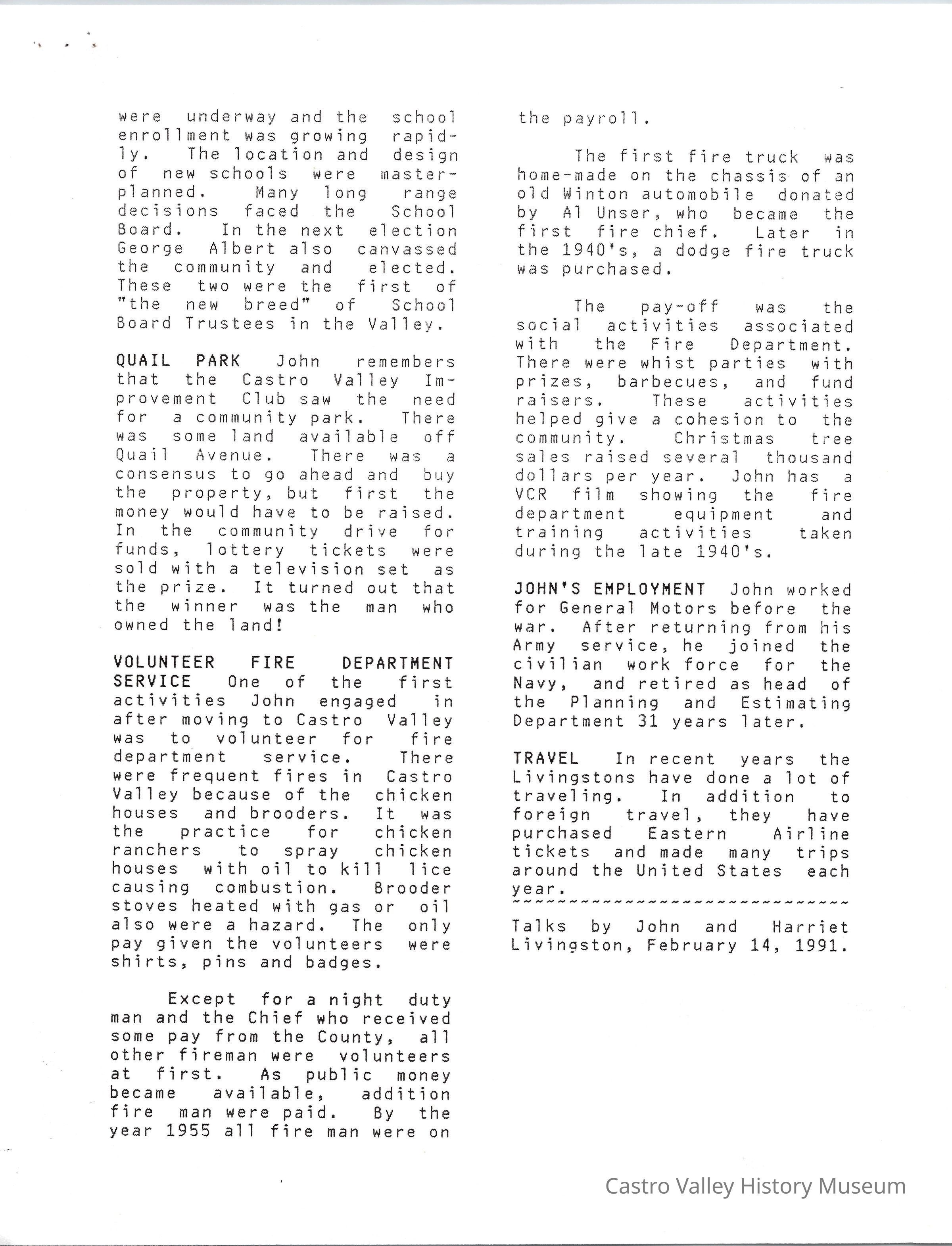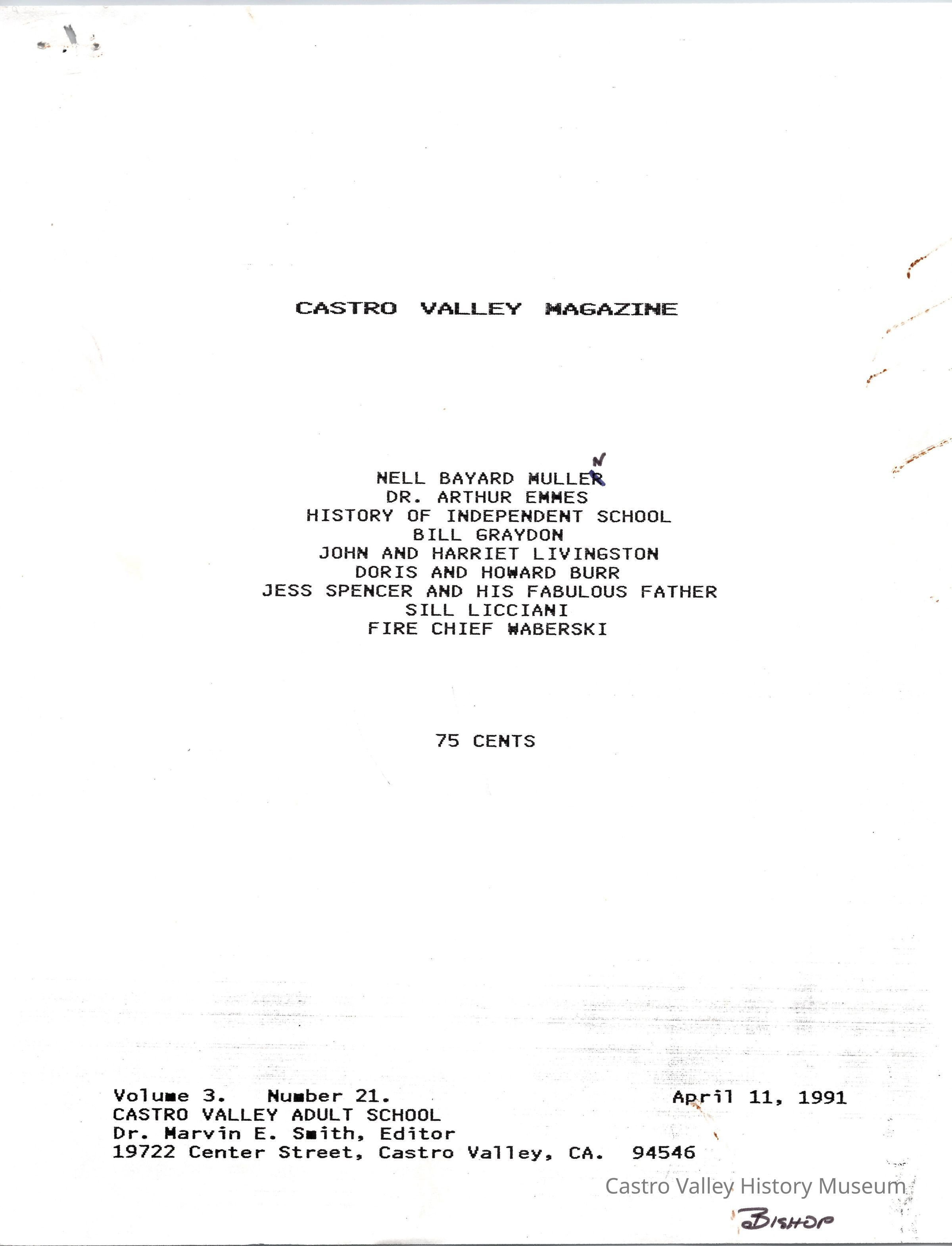 Volume 2 number 21 of Castro Valley Magazine edited by Marvin E. Smith. Articles by Nell Mullen, Karen Holzmeister,Bill Graydon, John and Harriet Livingston, Doris Burr, Jess Spencer, Sill Licciani, and Fire Chief Waberski about their respective families.Collection