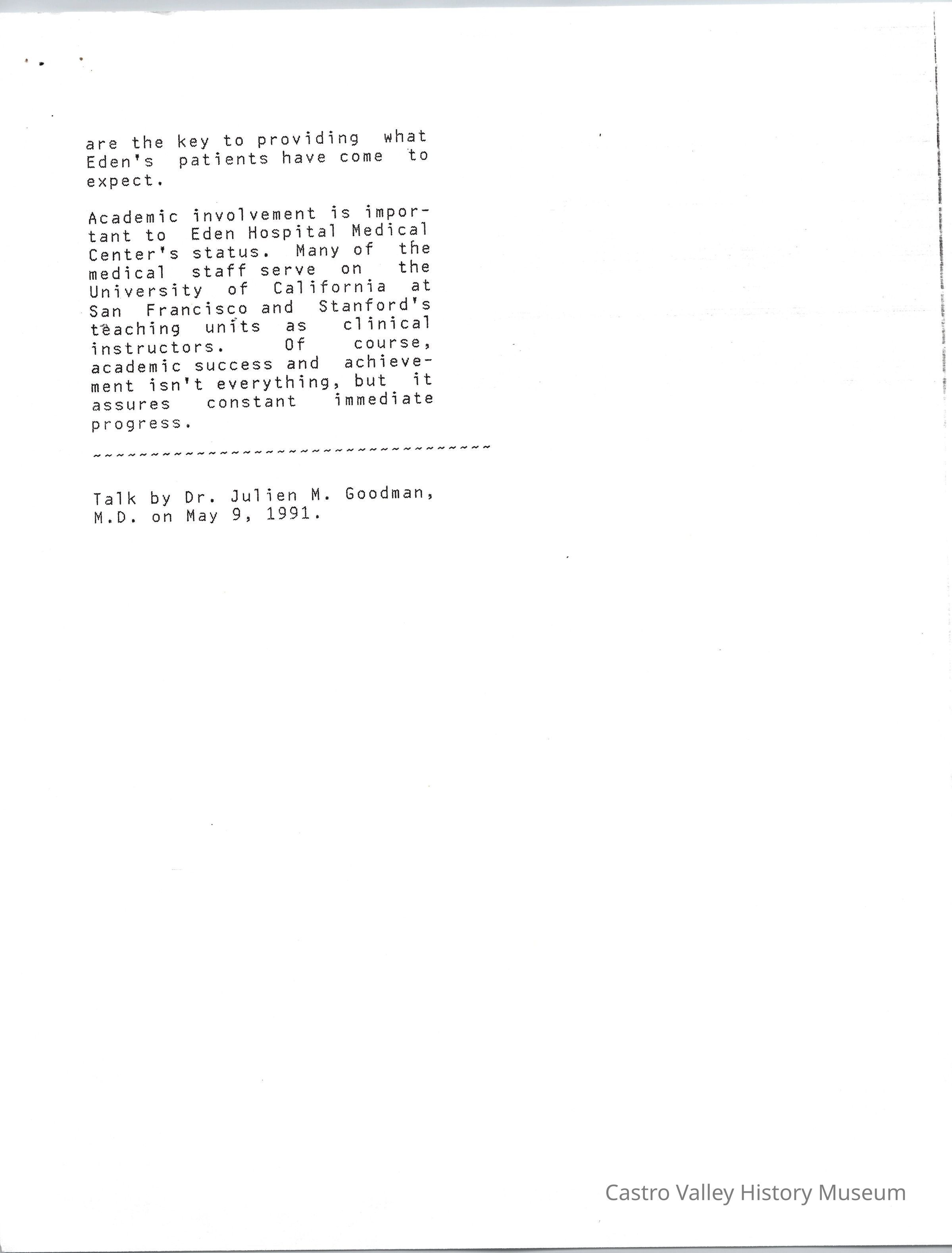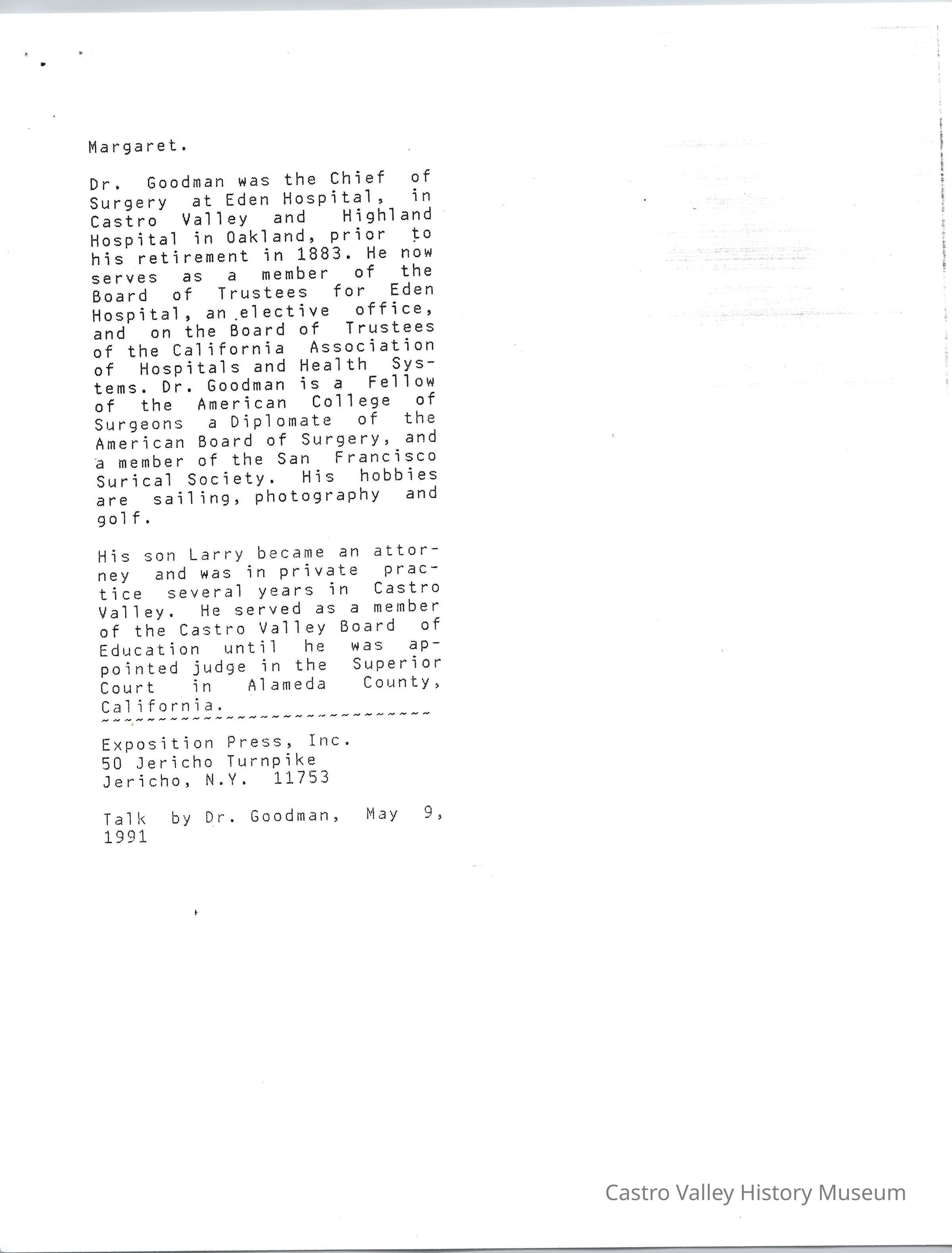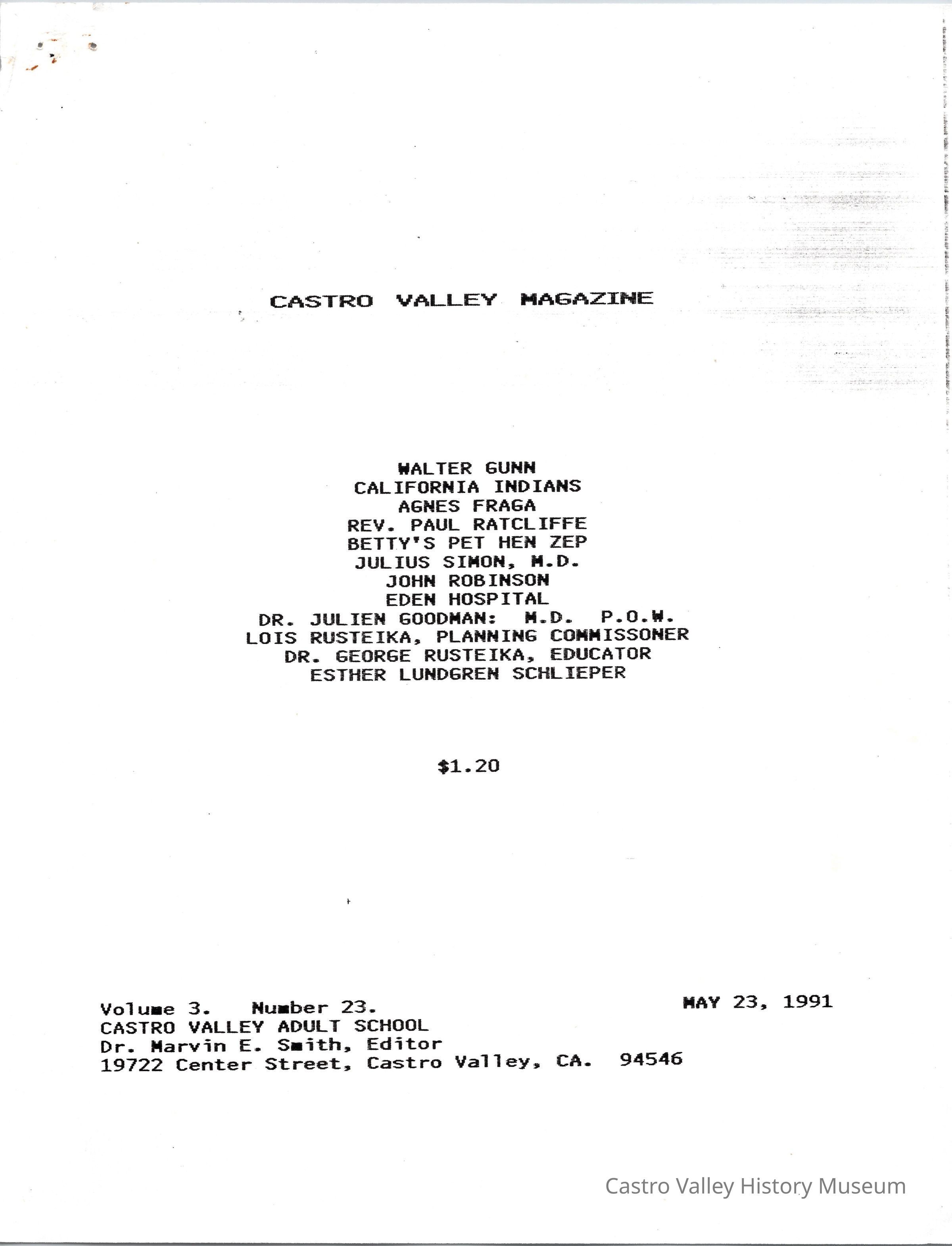 Volume 3 number 23 of Castro Valley Magazine edited by Dr. Marvin E. Smith. Articles on Walter Gunn, California Indians, Agnes Fraga, Rev. Paul Ratcliffe, Betty's pet hen Zep, Julius Simon, M.D., John Robinson, Eden Hospital, Dr. Julien Goodman: M.D. P.O.W., Louis Rusteika, Planning Commissioner, Dr. George Rusteika, Educator, and Esther Lundgren Schlieper. Articles written by Edith Gunn Jensen, Eugene G. Hirtle, Jr., Agnes Fraga, Betty Perry Allen, Julien M. Goodman, and Marvin E. Smith,Collection