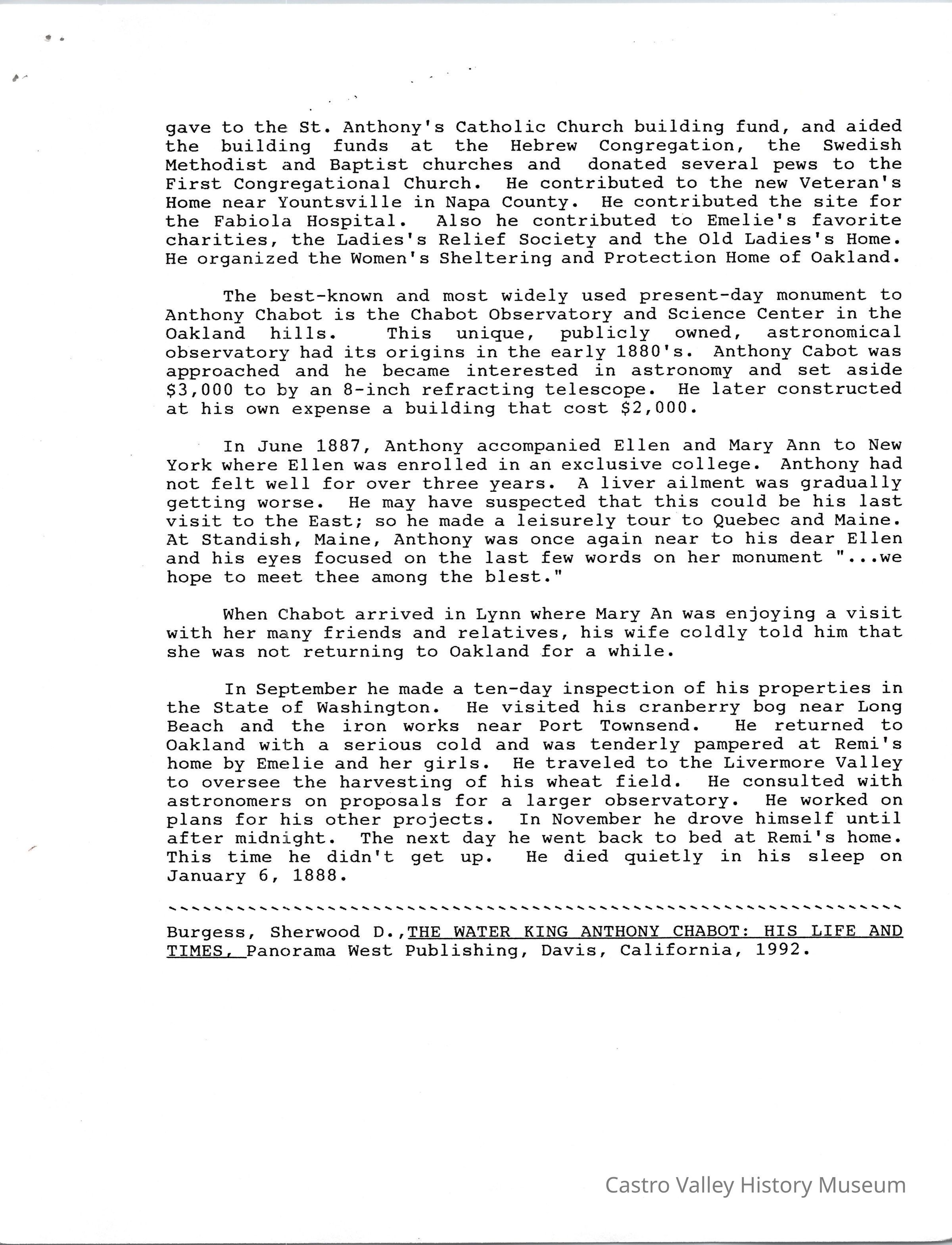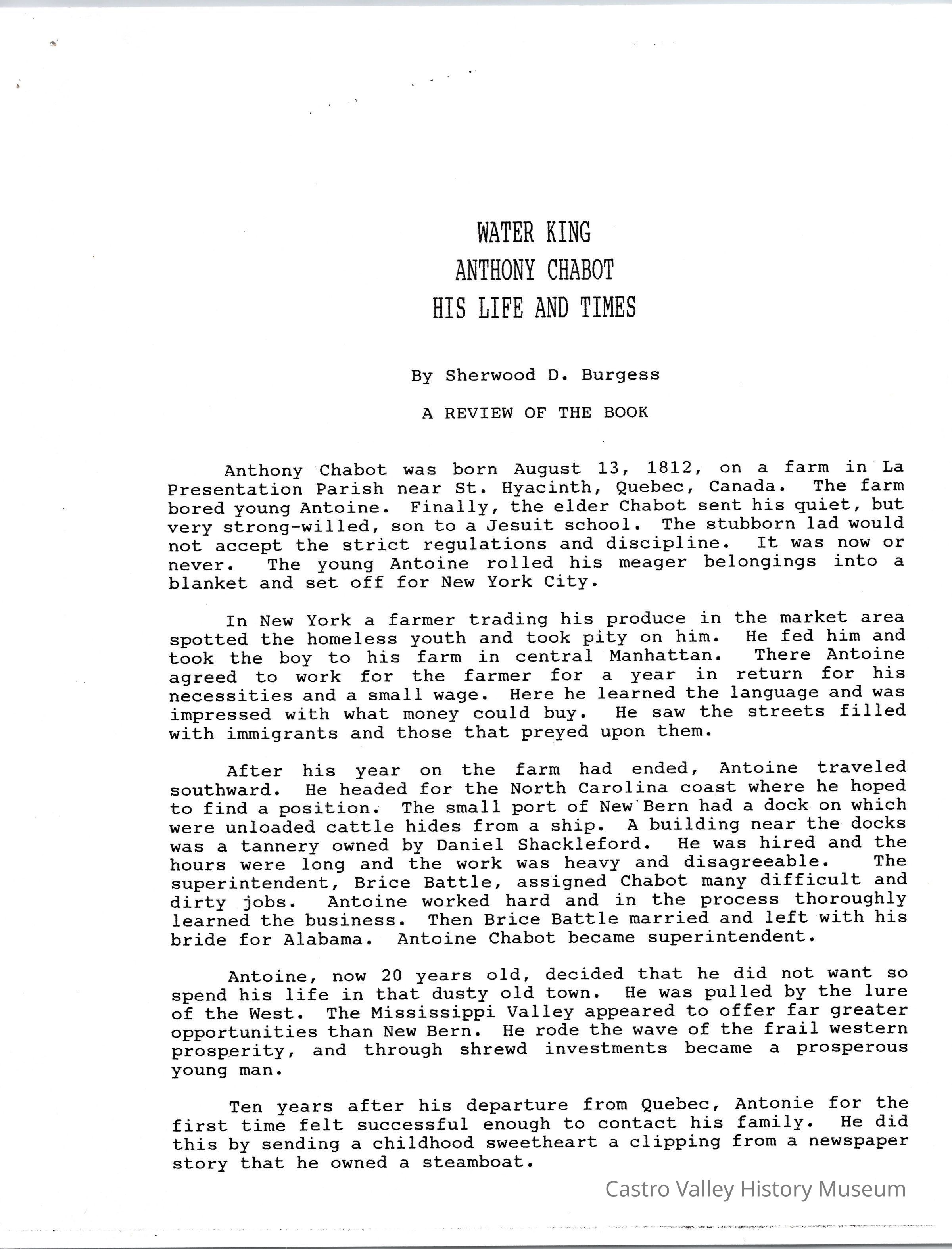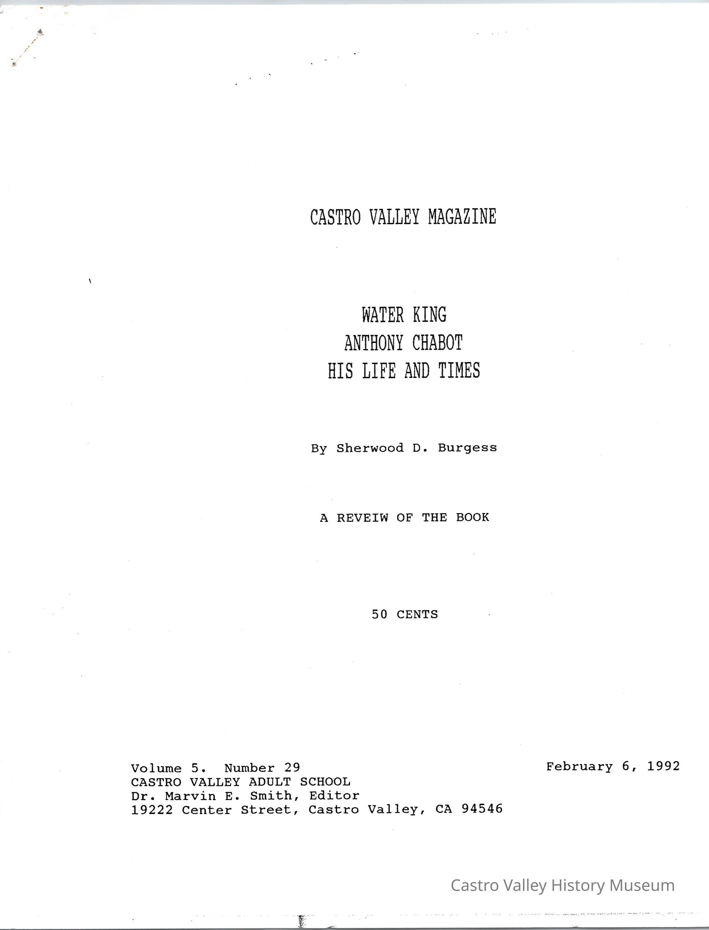 Volume 5 number 29 of Castro Valley Magazine edited by Dr. Marvin E. Smith. Review of Walter King's book on Anthony Chabot by Sherwood D. Burgess.Collection