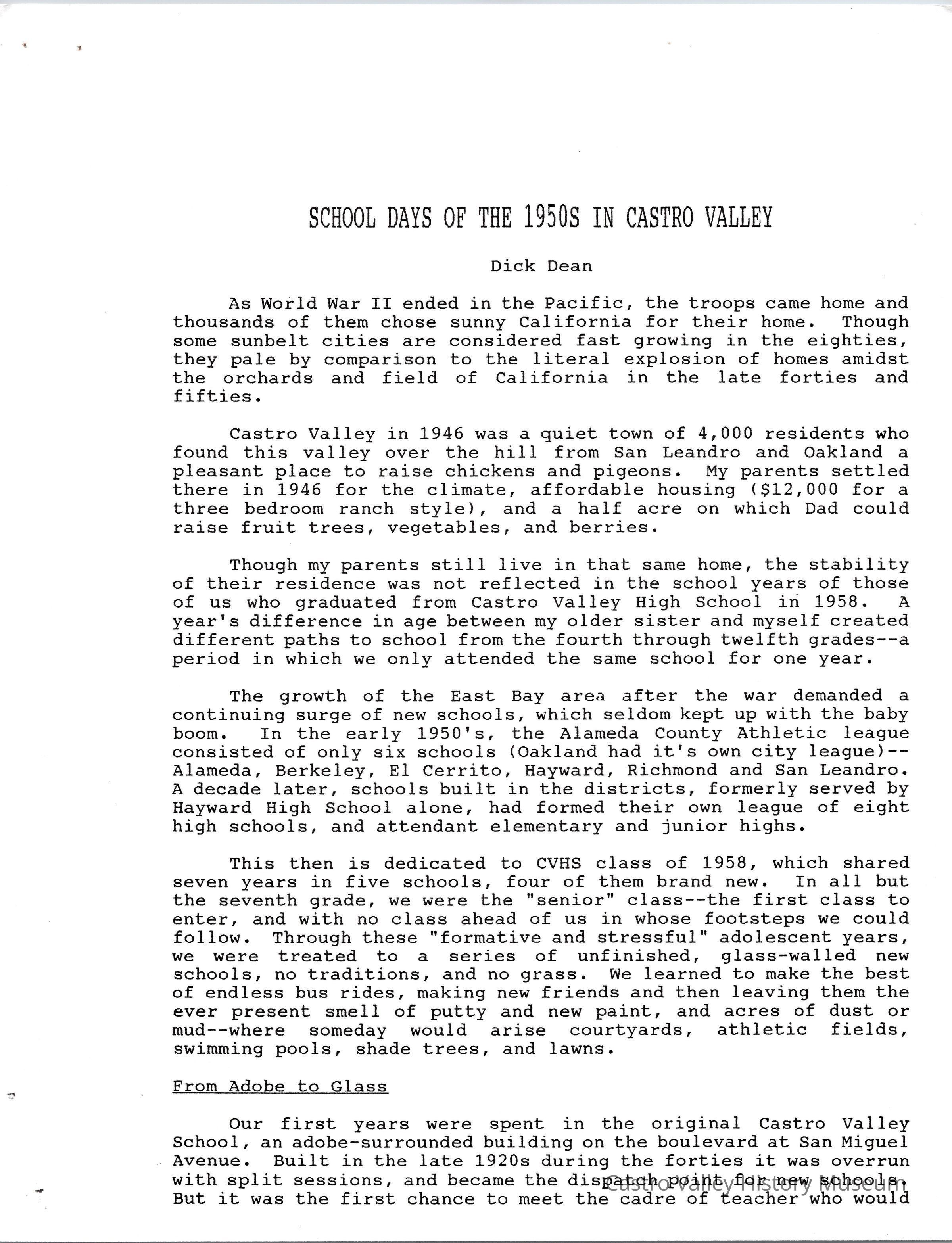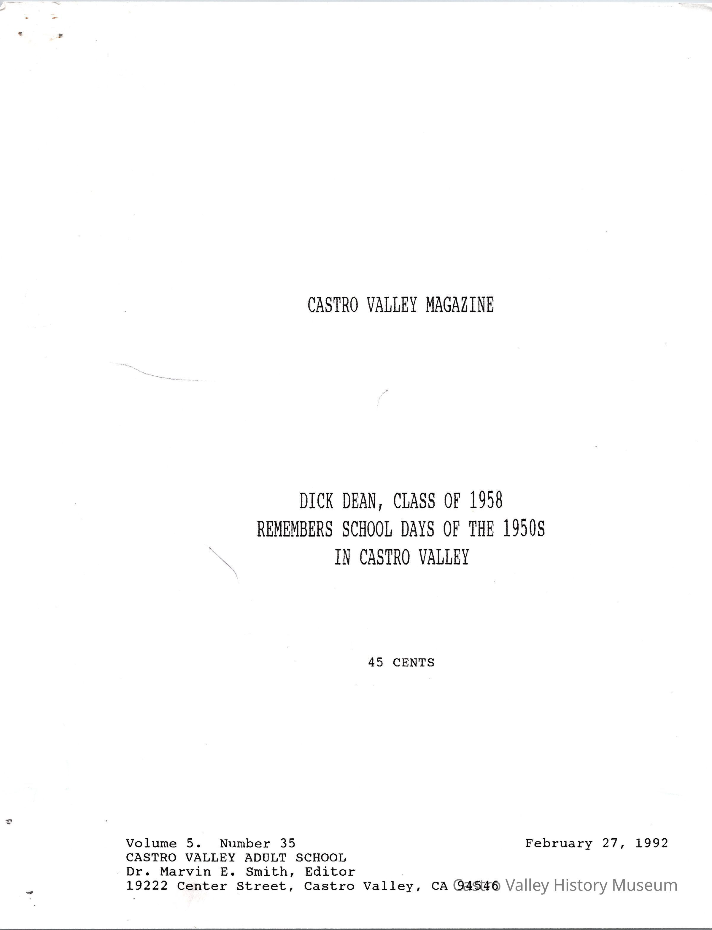 Volume 5 numer 35 of Castro Valley Magazine edited by Dr. Marvin E. Smith. Dick Dean remembers school days of the 1950's in Castro Valley.Collection