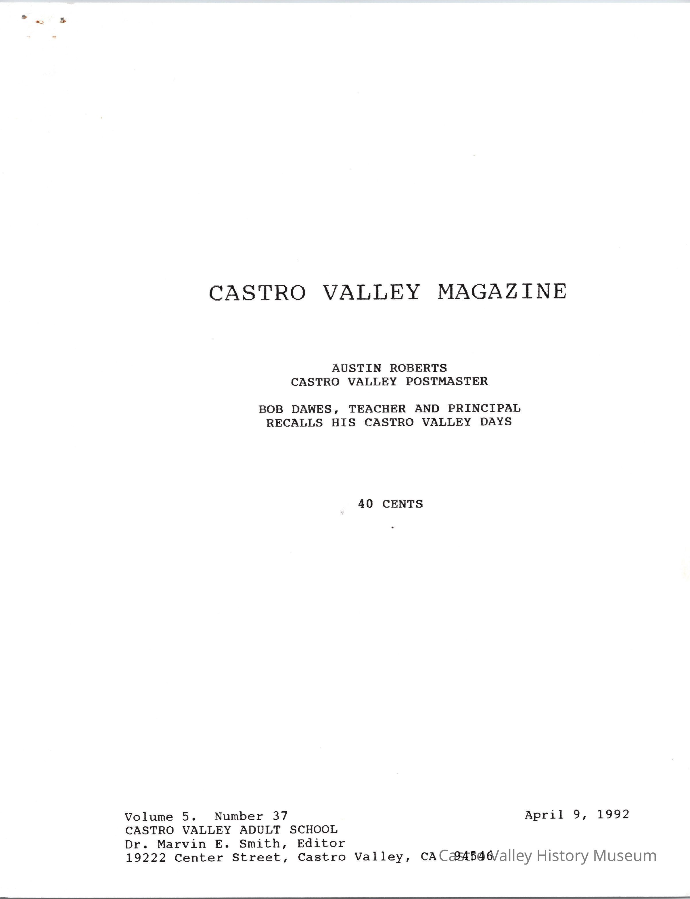 Volume 5 number 37 of Castro Valley Magazine edited by Dr. Marvin E. Smith. Articles on Austin Roberts and Bob Dawes by Austin Roberts and Bob Dawes.Collection