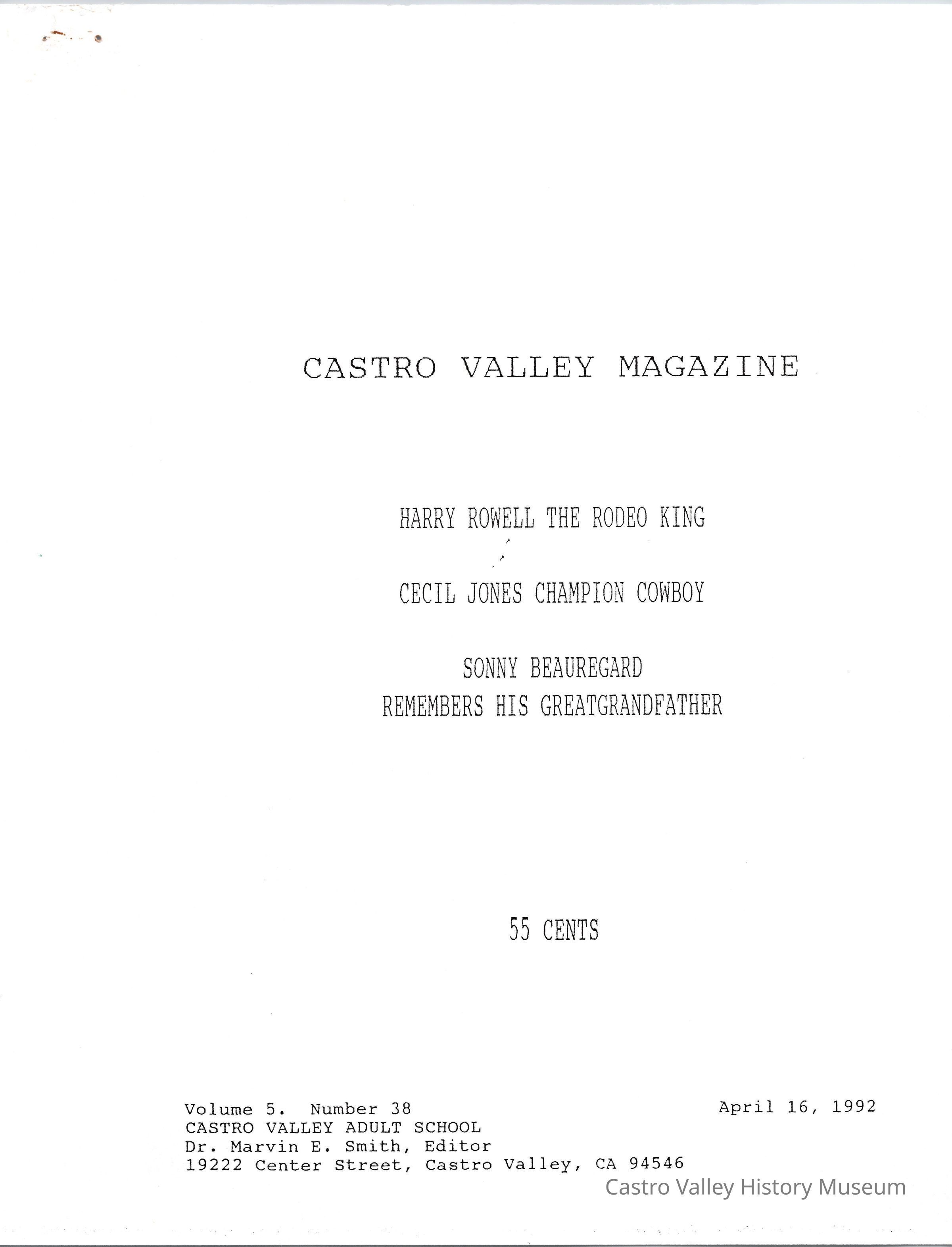 Volume 5 number 38 of Castro Valley Magazine edited by Dr. Marvin E. Smith. Articles on Harry Rowell and Cecil Jones. Written by Cecil Jones and L. G. "Sonny" Beauregard.Collection