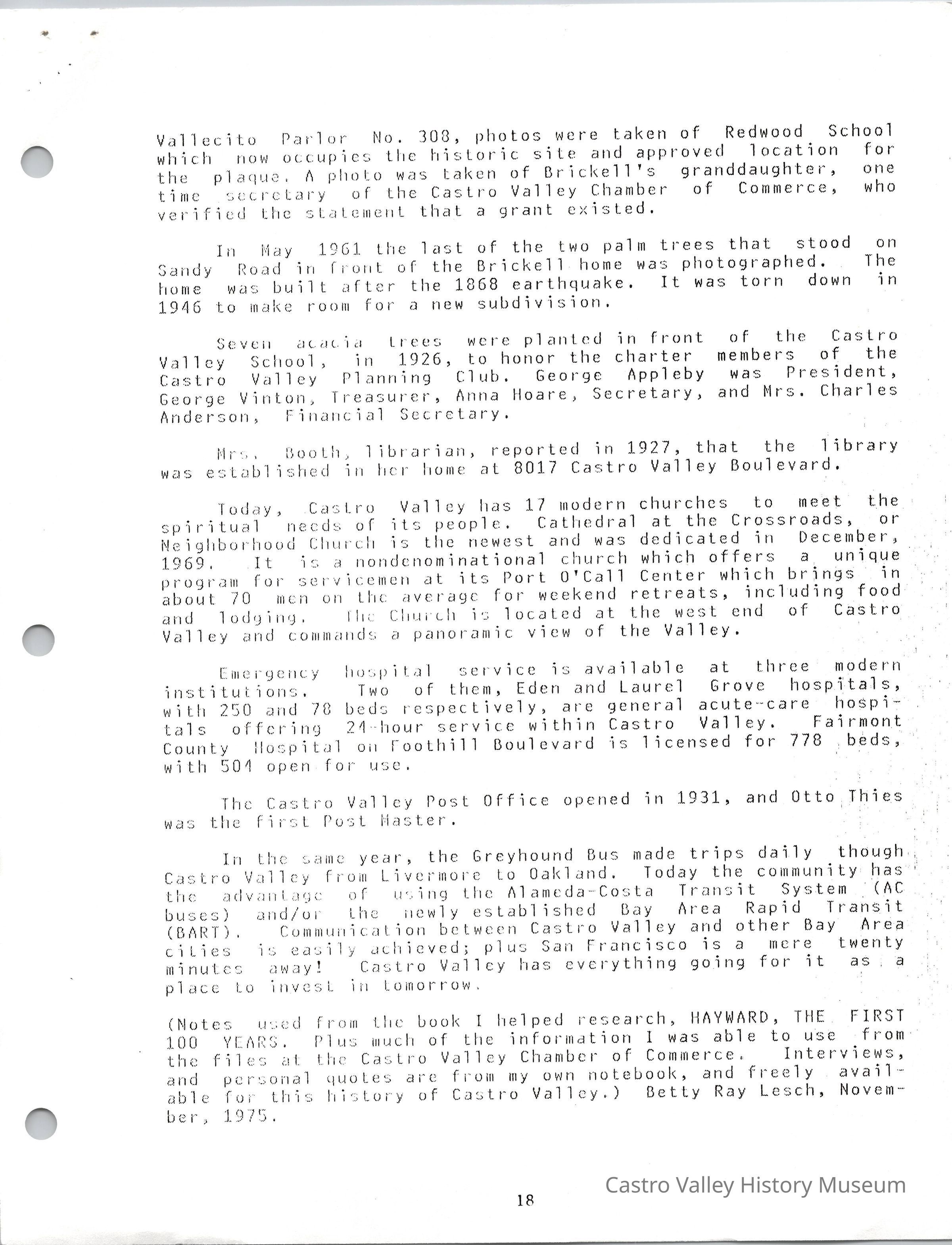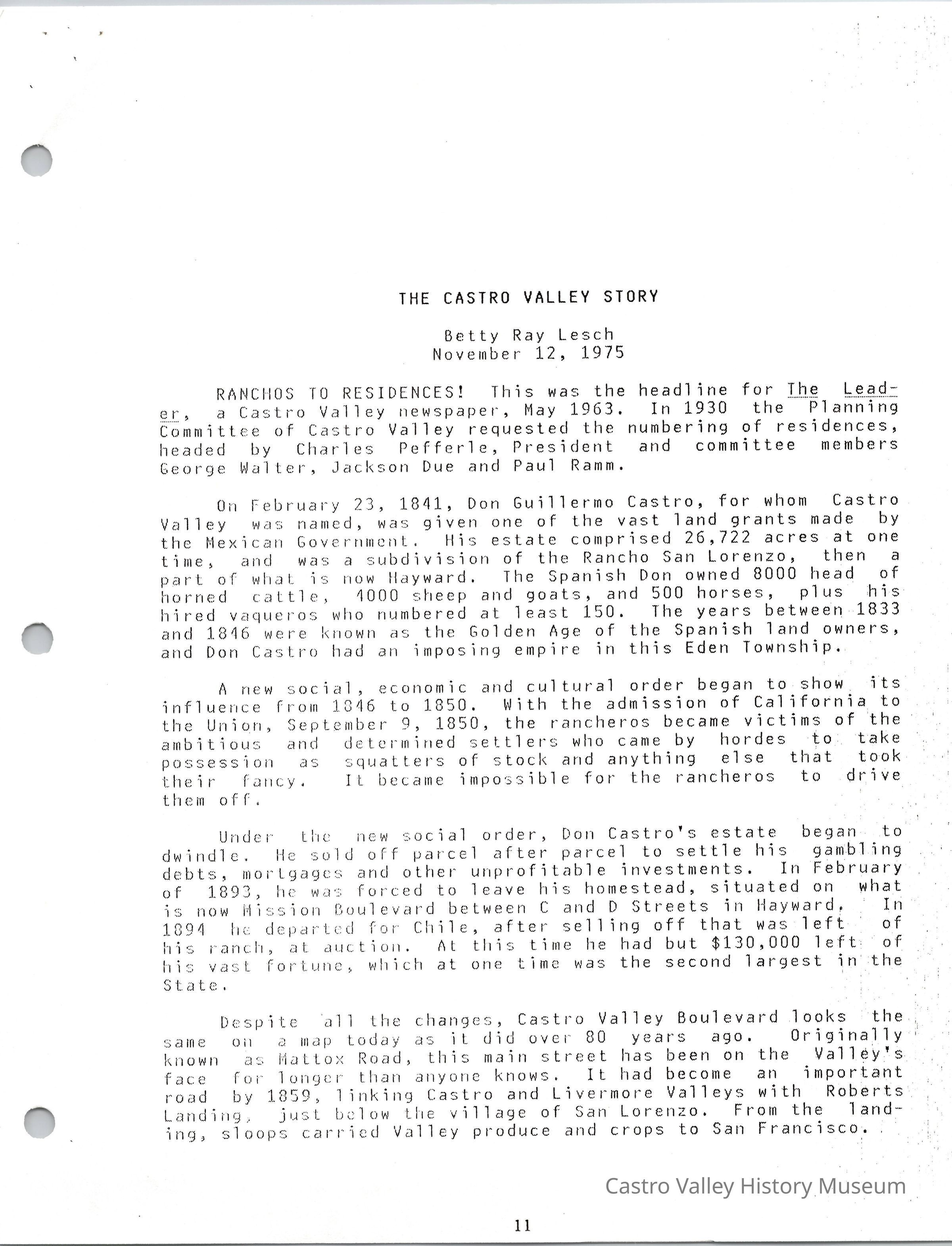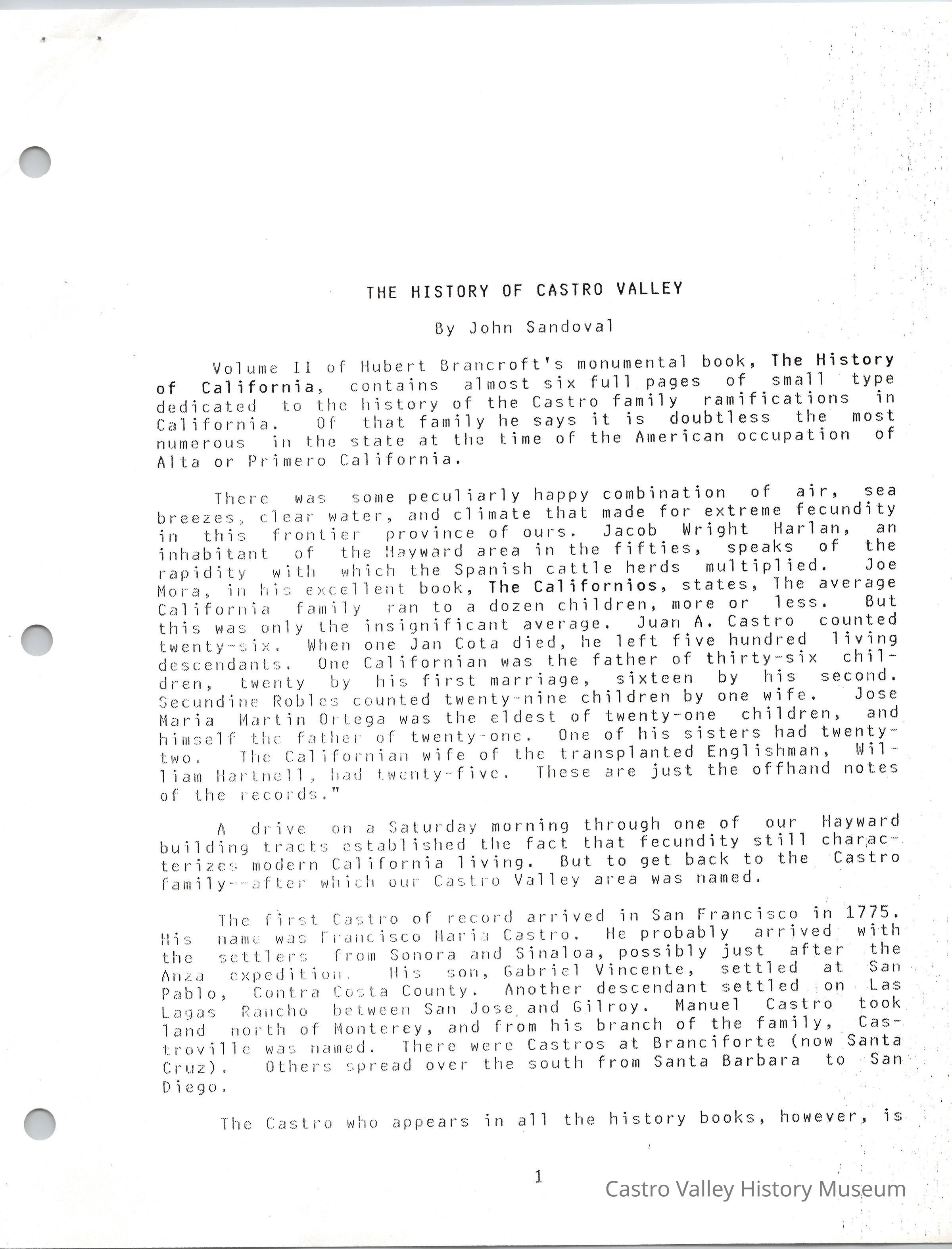 Volume 1 Number 3 of Castro Valley Magazine edited by Dr. Marvin E. Smith. John Sandoval tells the history of Castro Valley beginning in the 1700's. Includes a map and "The Castro Valley Story" by Betty Ray Lesch from Nov 12, 1975.Collection