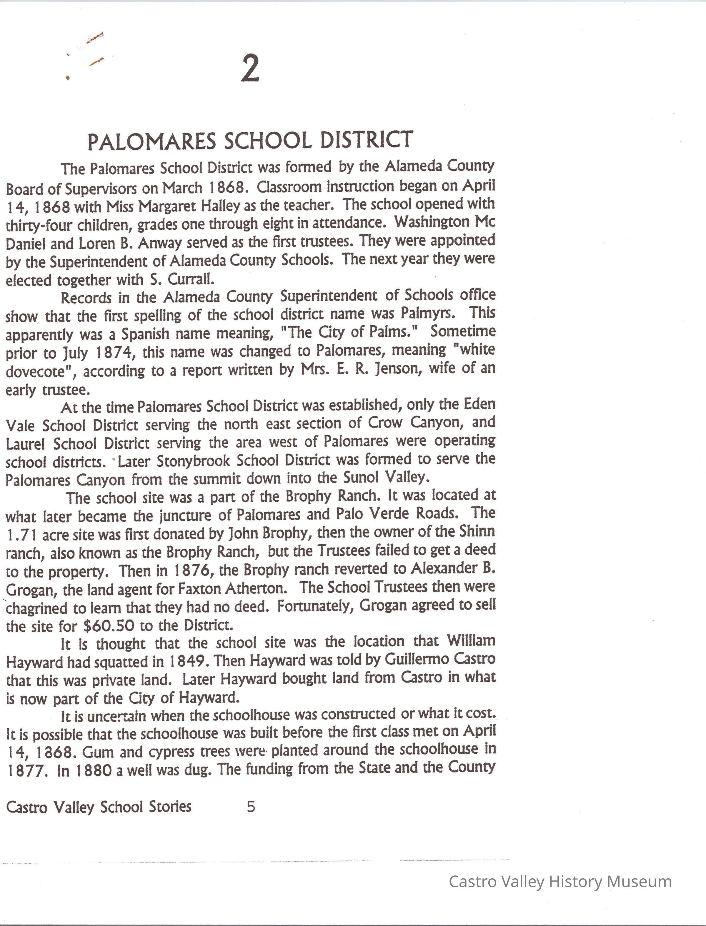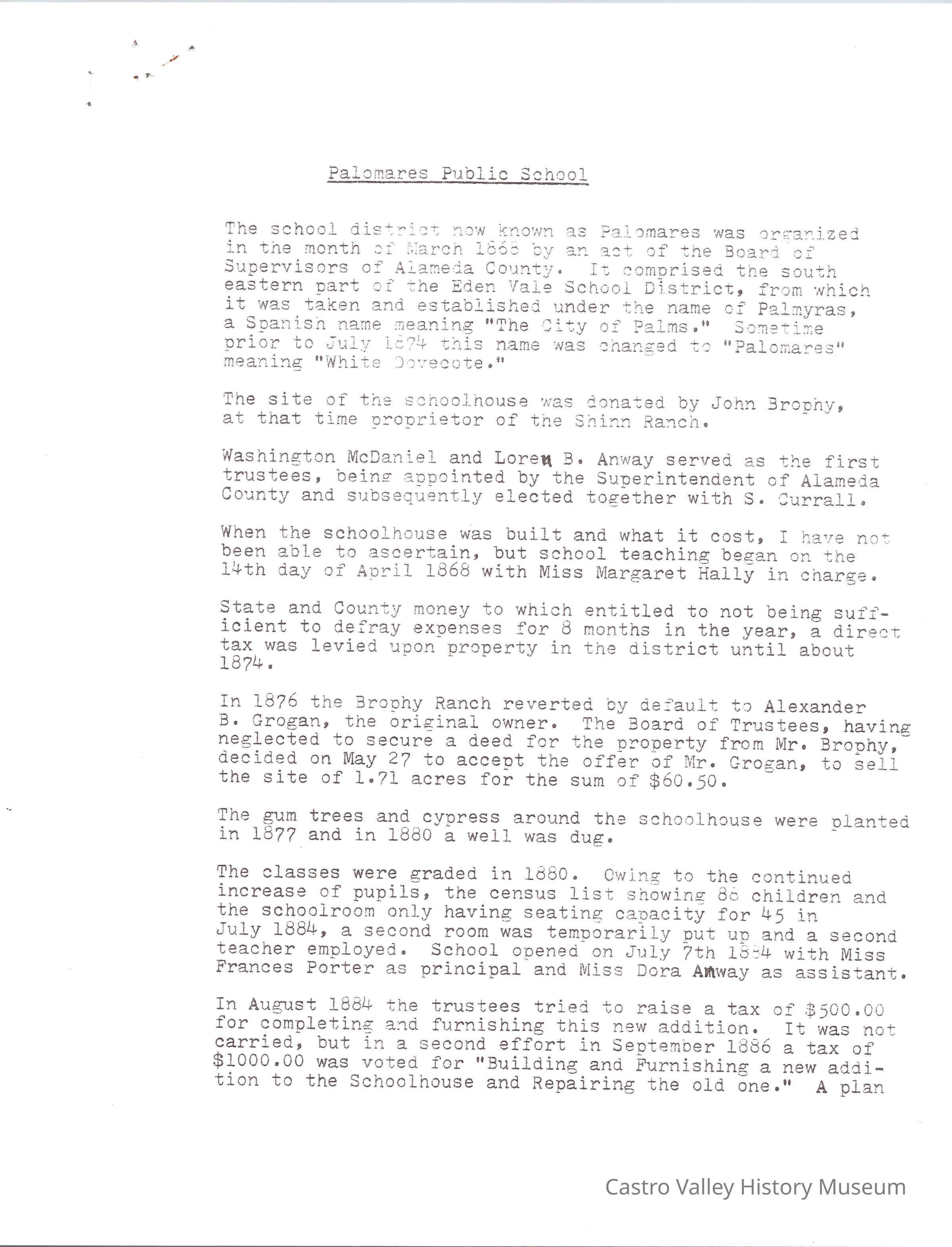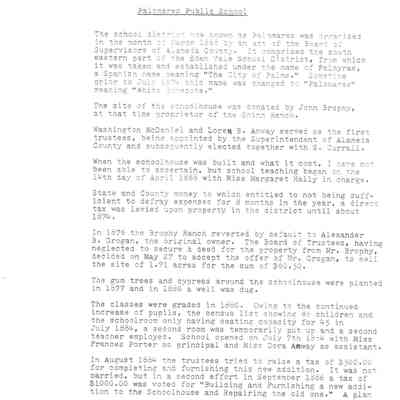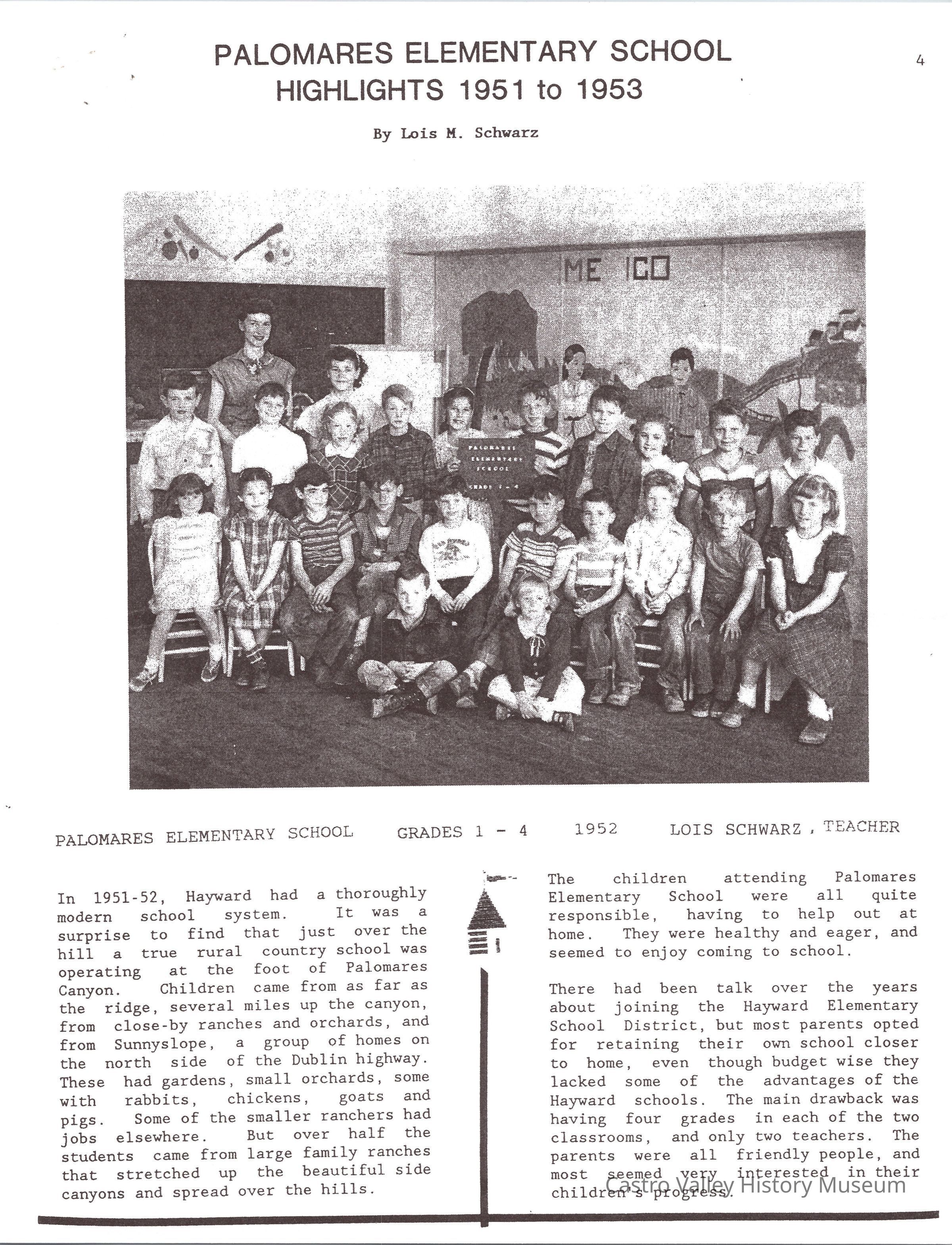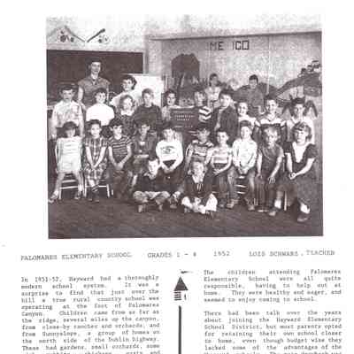 Castro Valley School Stories - Palomares School District; Palomares Public School; Independent for 100 Years 189201992 by Jerry Bishop; Palomares Elementary School Highlights 1951-1953 by Lois M. Schwarz (includes an image - Palomares Elementary School Grades 1-4 1952 Lois Schwarz, Teacher)Collection
