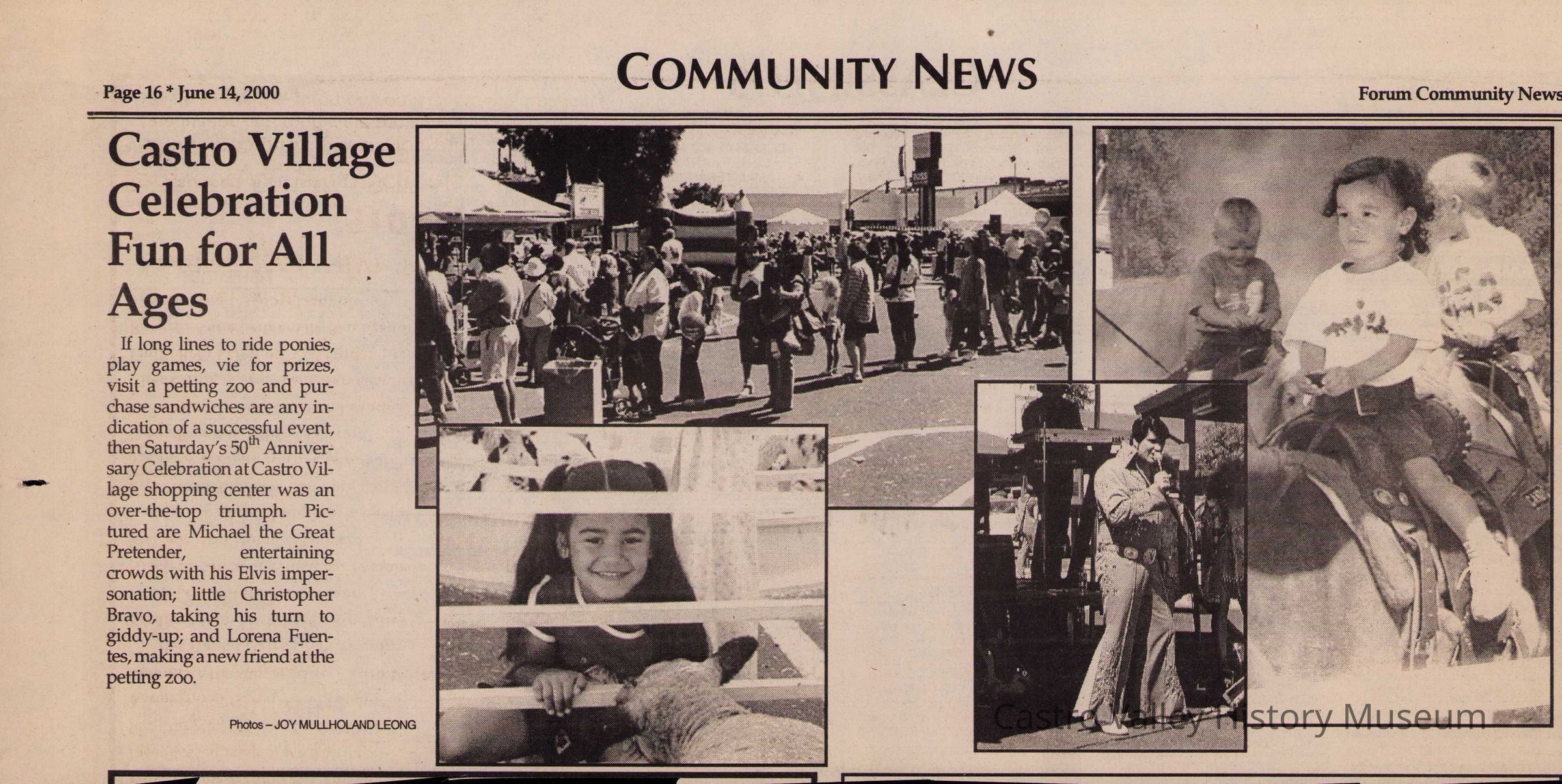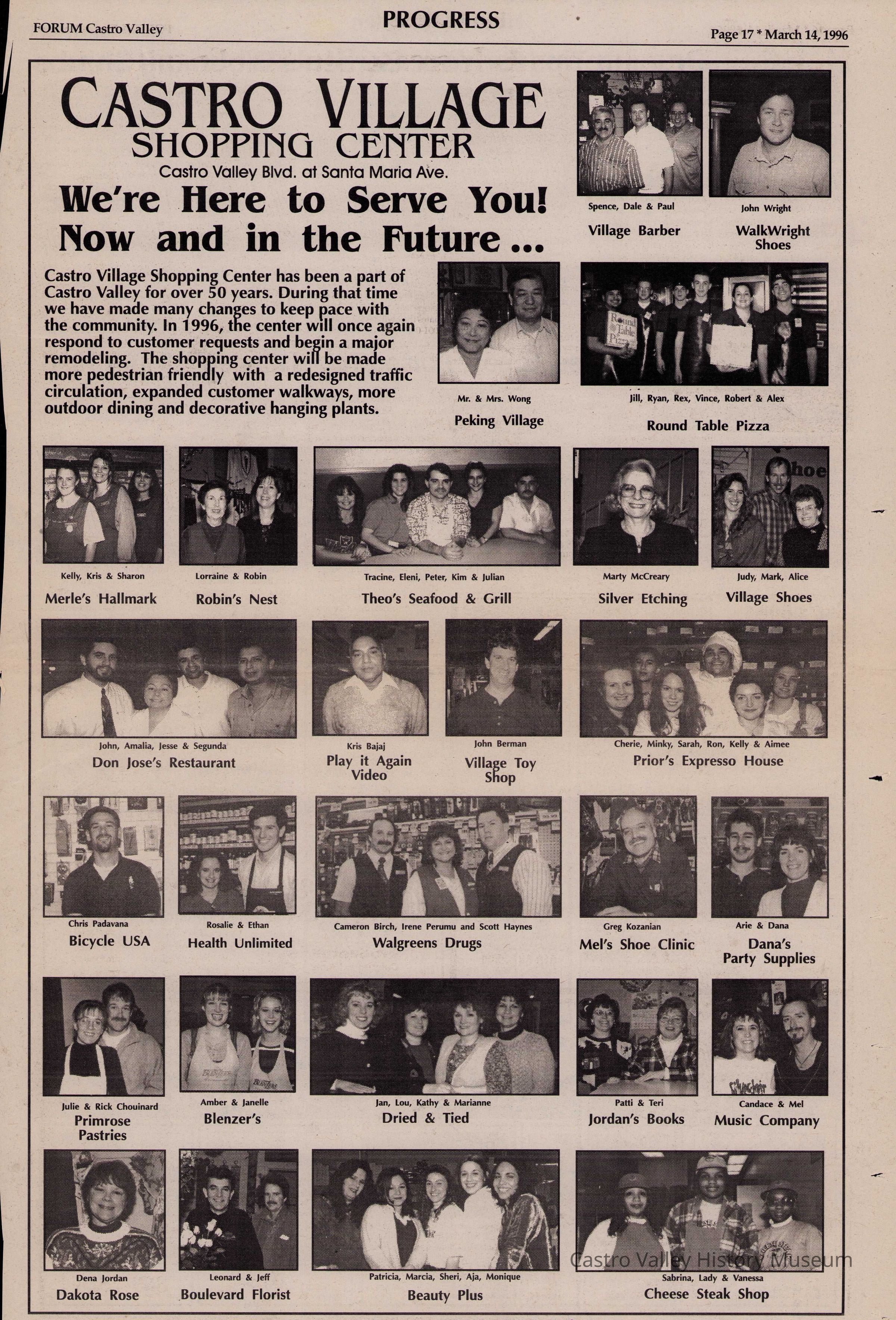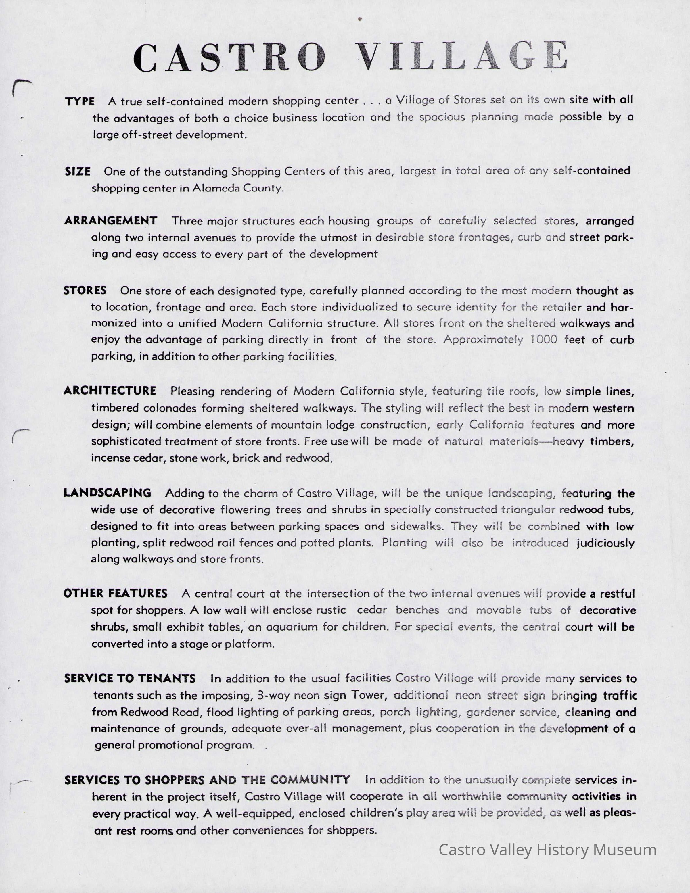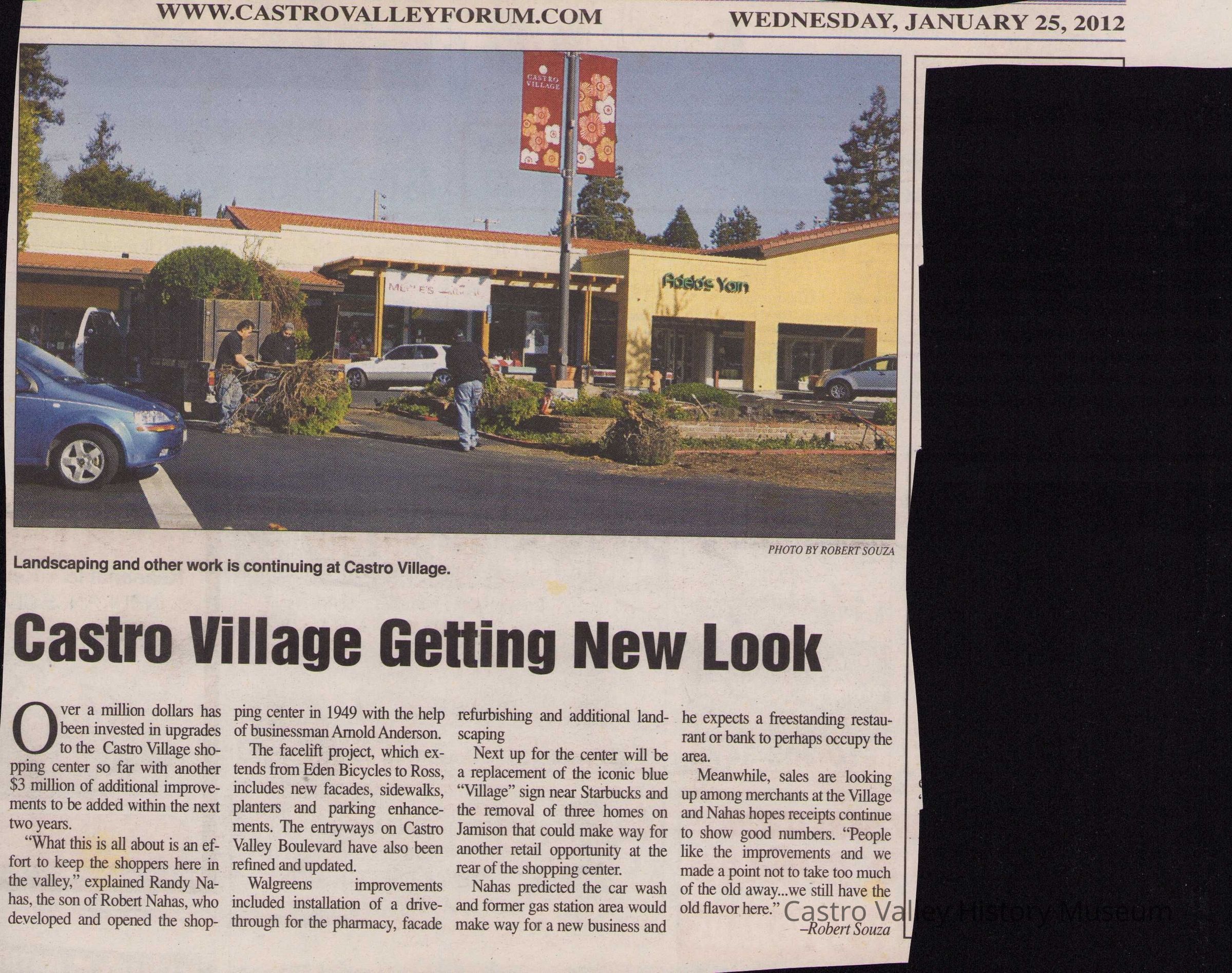 Several Castro Valley Forum articles and an advertisement, and a flyer describing the benefits of Castro Village to businesses. Includes a photo of a groundbreaking ceremony.Collection