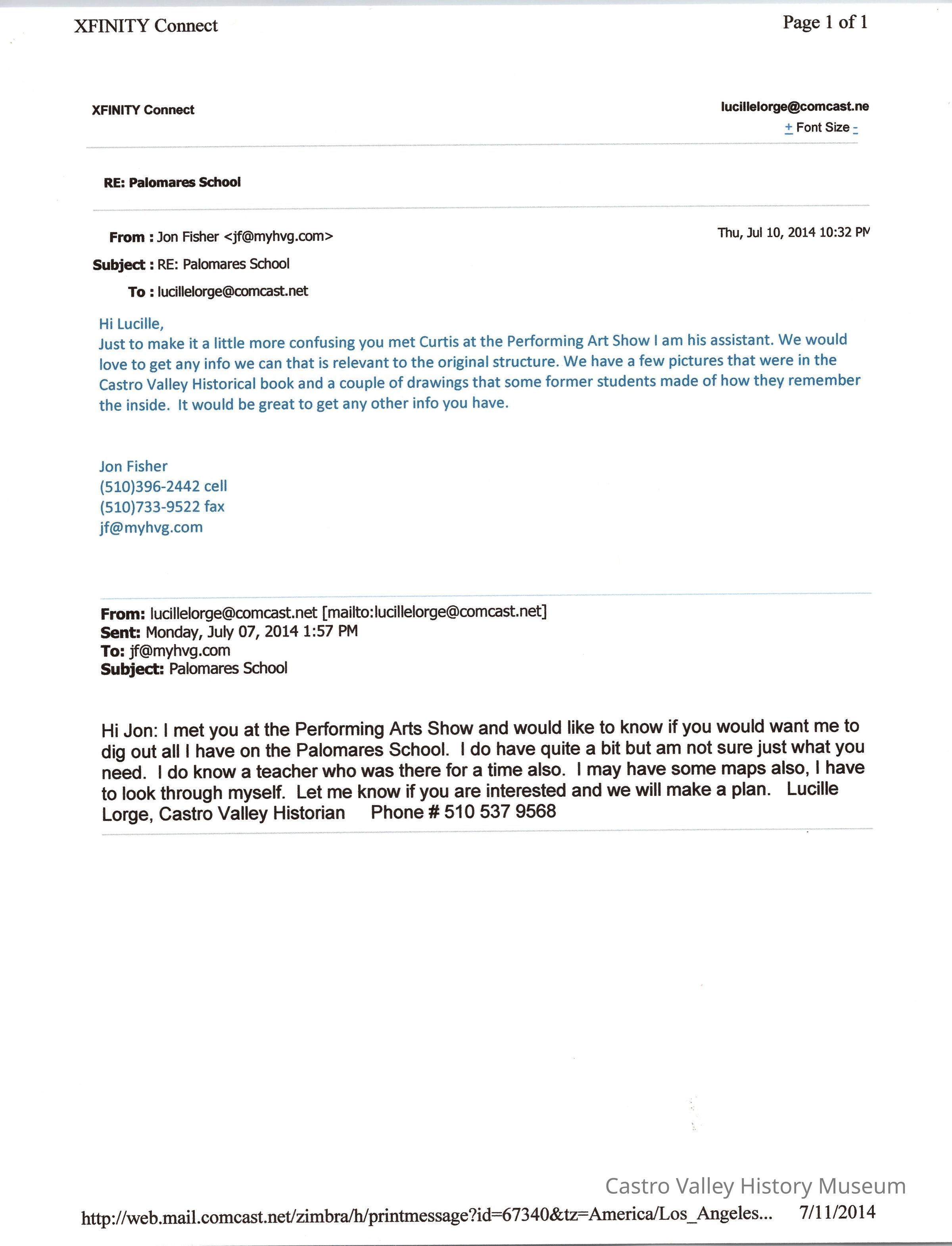 Emails to and from Lucille Lorge and Jon Fisher, July 2014 about information on Palomares School.Collection