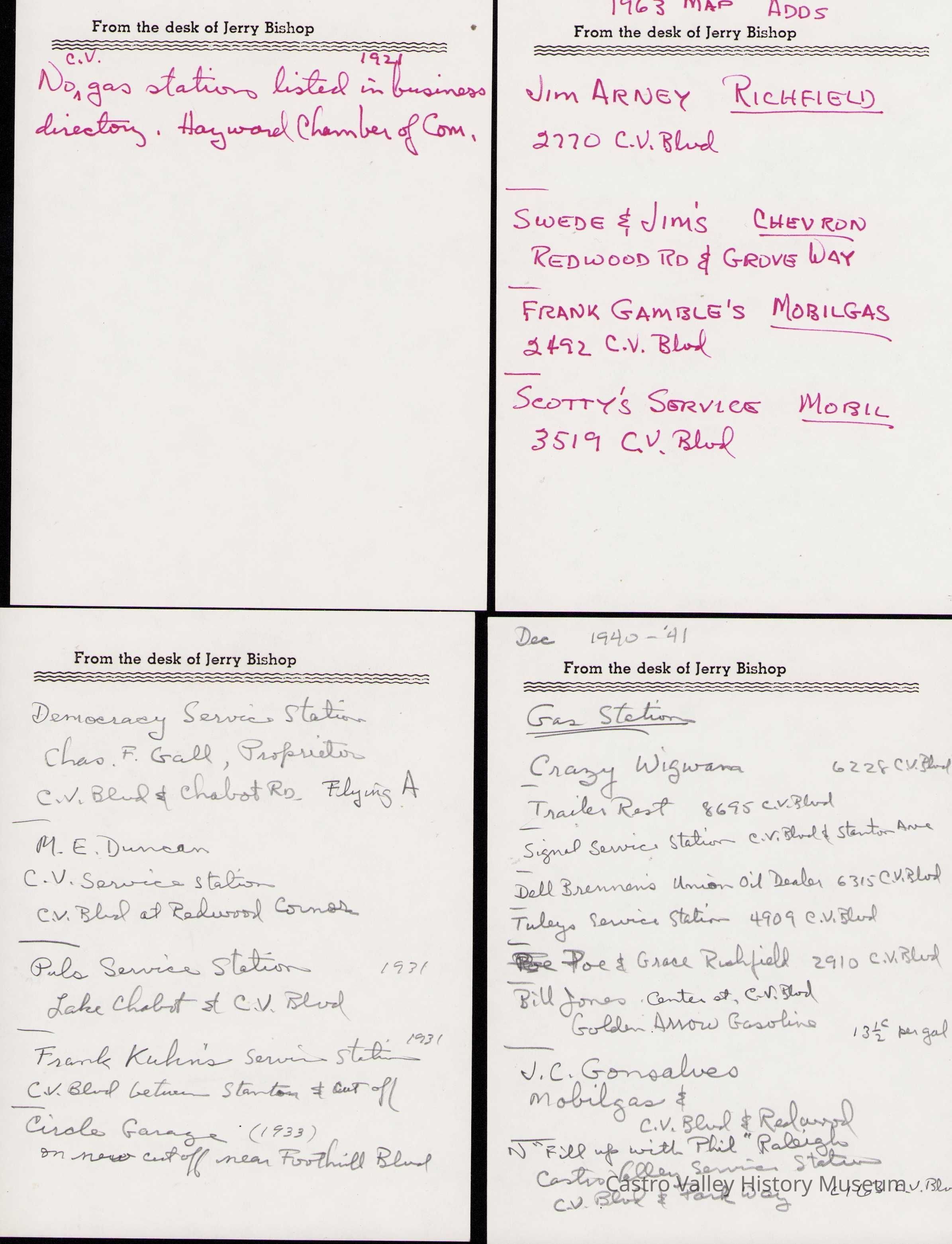 Notes from Jerry Bishop on the gas stations in Castro Valley in various years.