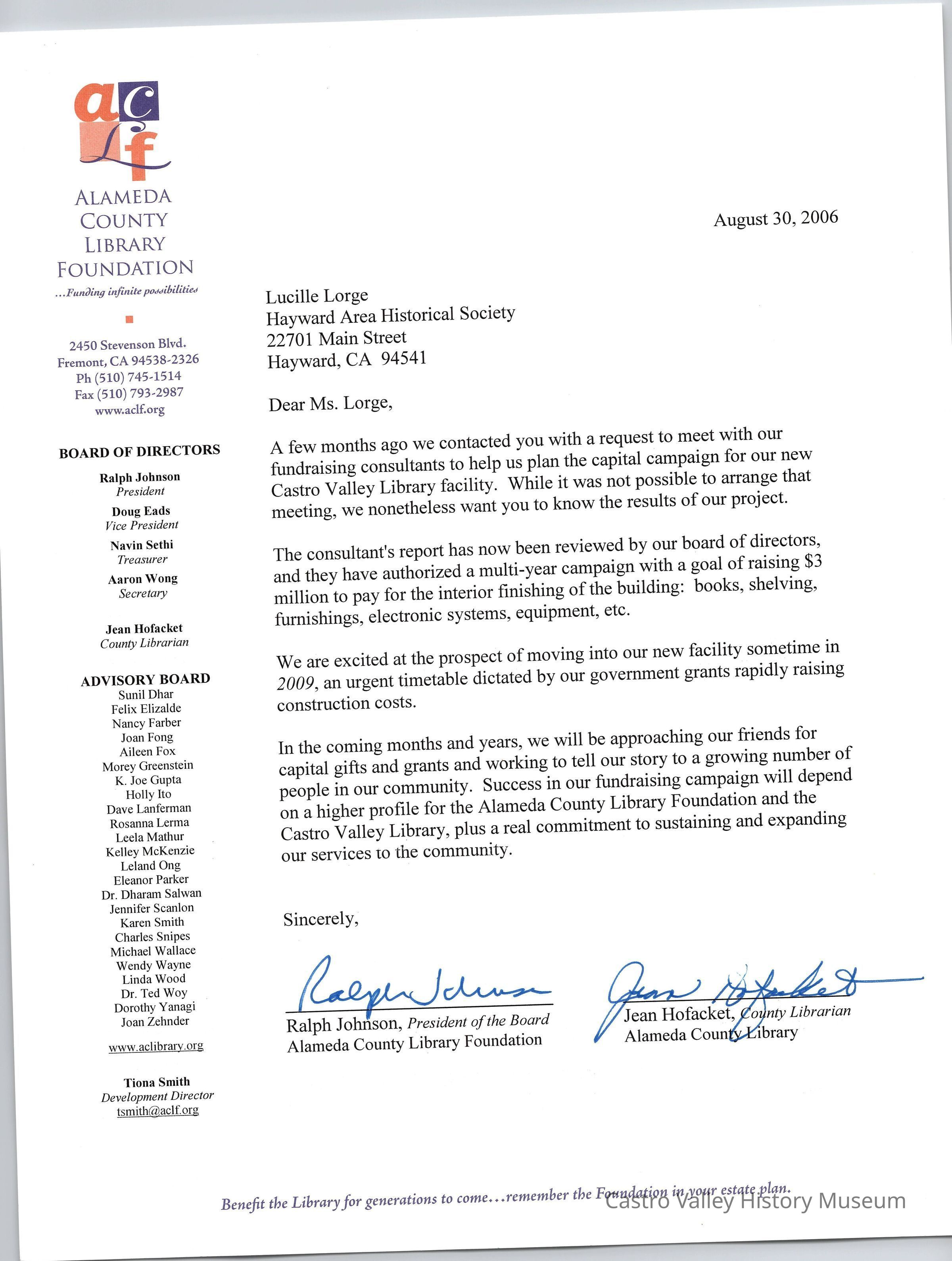 Letter from Alameda Country Library Foundation to Lucille Lorge about fundraising campaign for new library building dated August 30, 2006.Collection