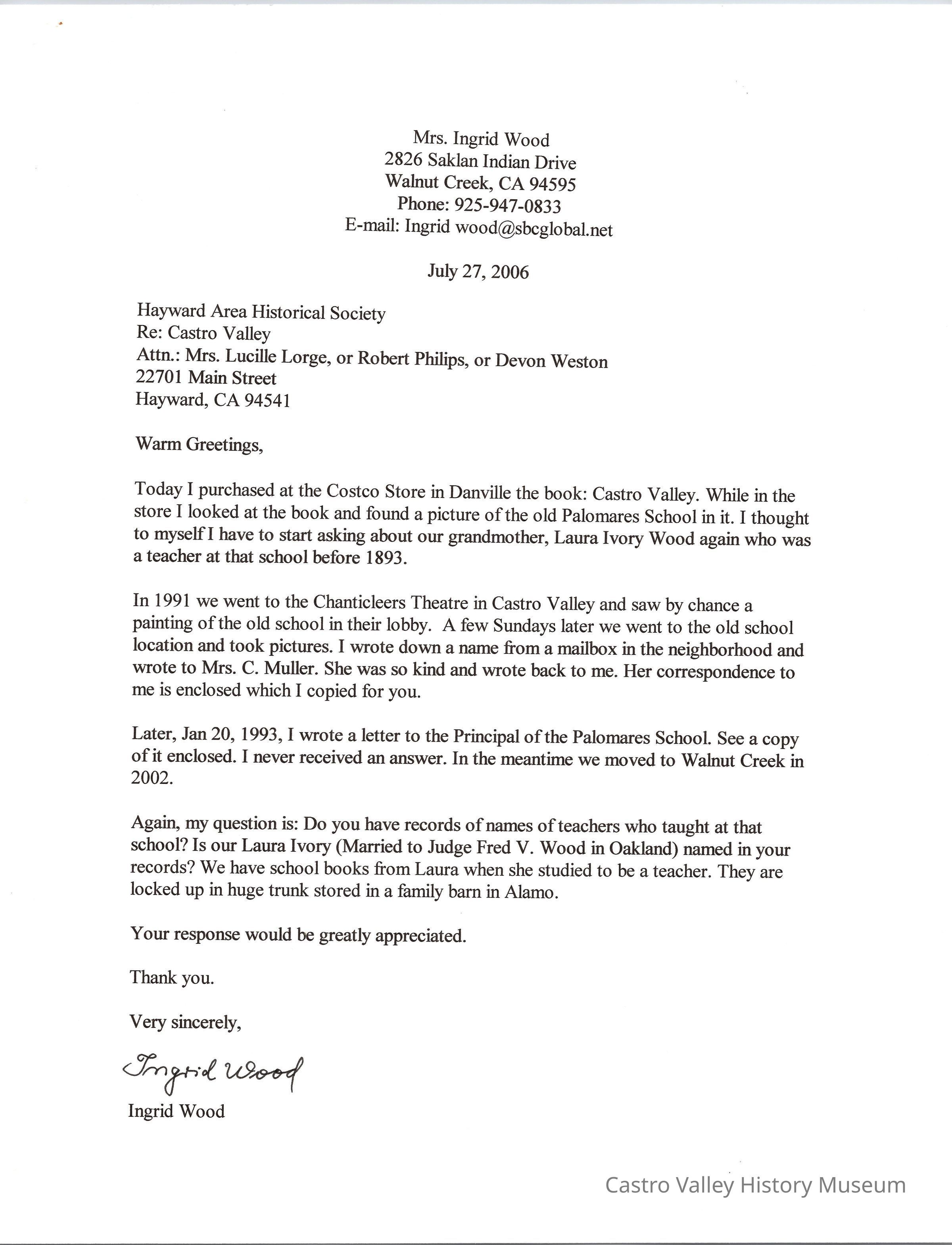 Letter from Mrs. Ingrid Wood to the Hayward Area Historical Society, July 27, 2006, attn: Mrs. Lucille Lorge, or Robert Philips, or Devon Weston referencing the book, Castro Valley and a picture in it of the old Palomares School and her grandmother, Laura Ivory Wood who was a teacher there before 1893.Collection