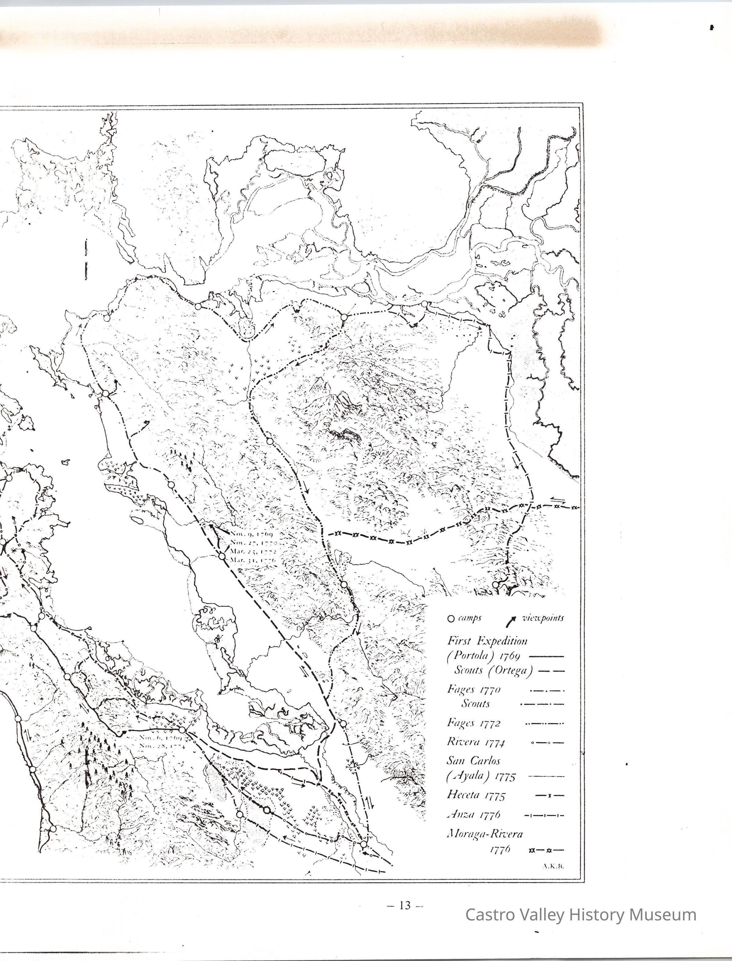 Map of the East Bay that includes Expeditions with camps and viewpoints marked. Listed are First Expedition (Portola) 1769, Scouts (Ortega), Fages (1770) Scouts, Fages 1772, Rivera 1774, San Carlos (Ayala) 1775, Heceta 1775, Anza 1776, Moraga-Rivera 1776Collection