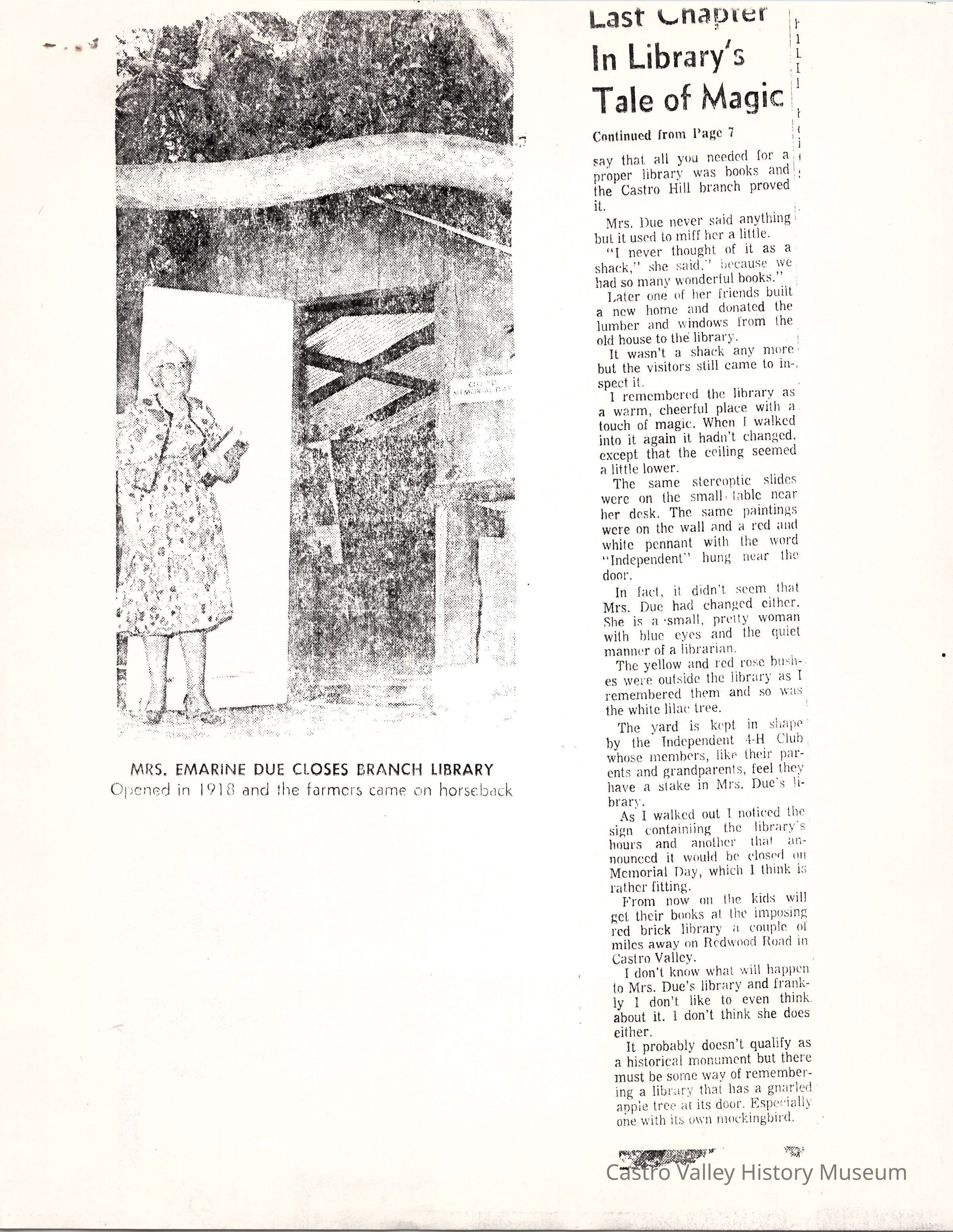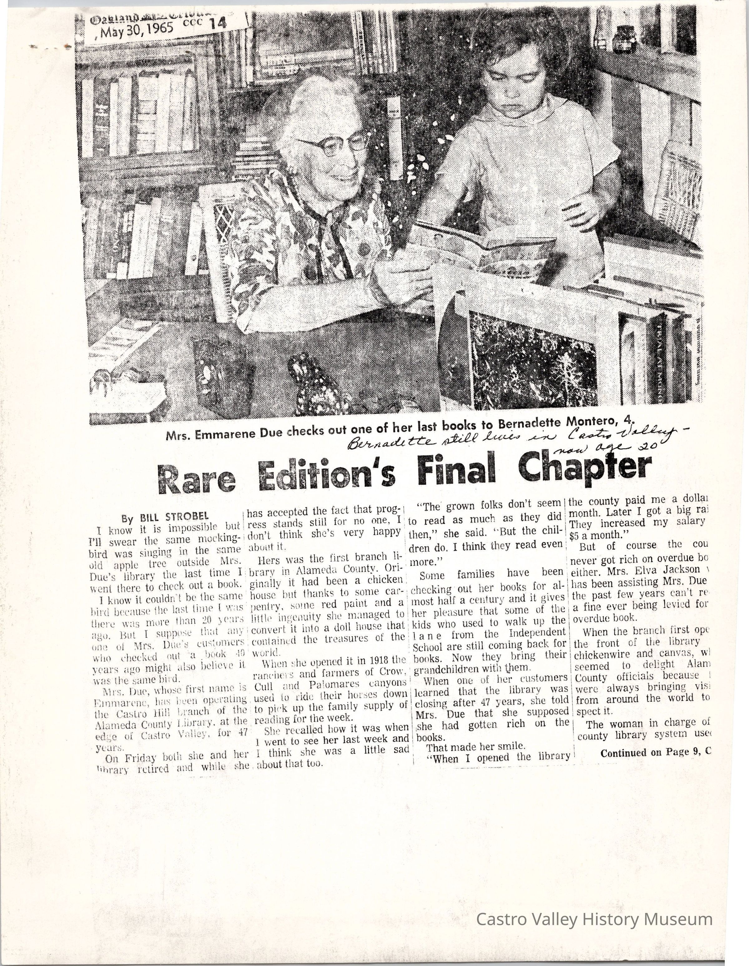 Newspaper article from the Oakland Tribune, May 30, 1965 titled Rare Edition's Final Chapter. Image of Emmarene Due and Bernadette Montero.Collection