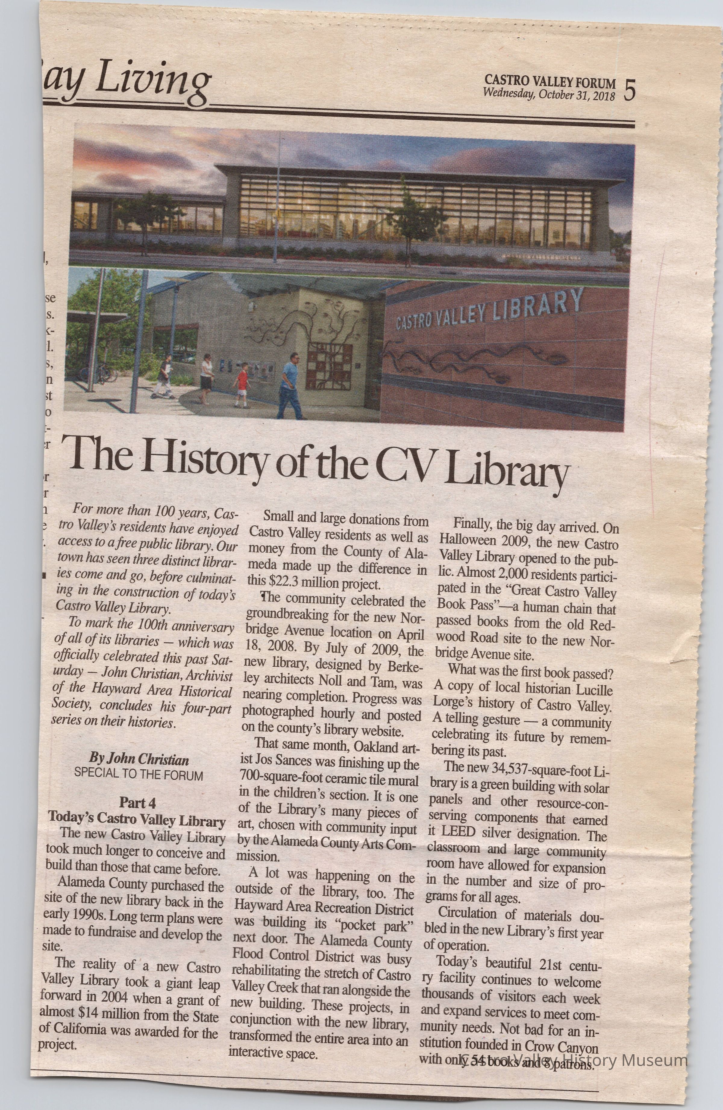 Newspaper article titled The History of the CV Library written by John Christian from the Castro Valley Forum, Wednesday, October 31 2018. Focused on the history of the Castro Valley Library.Collection