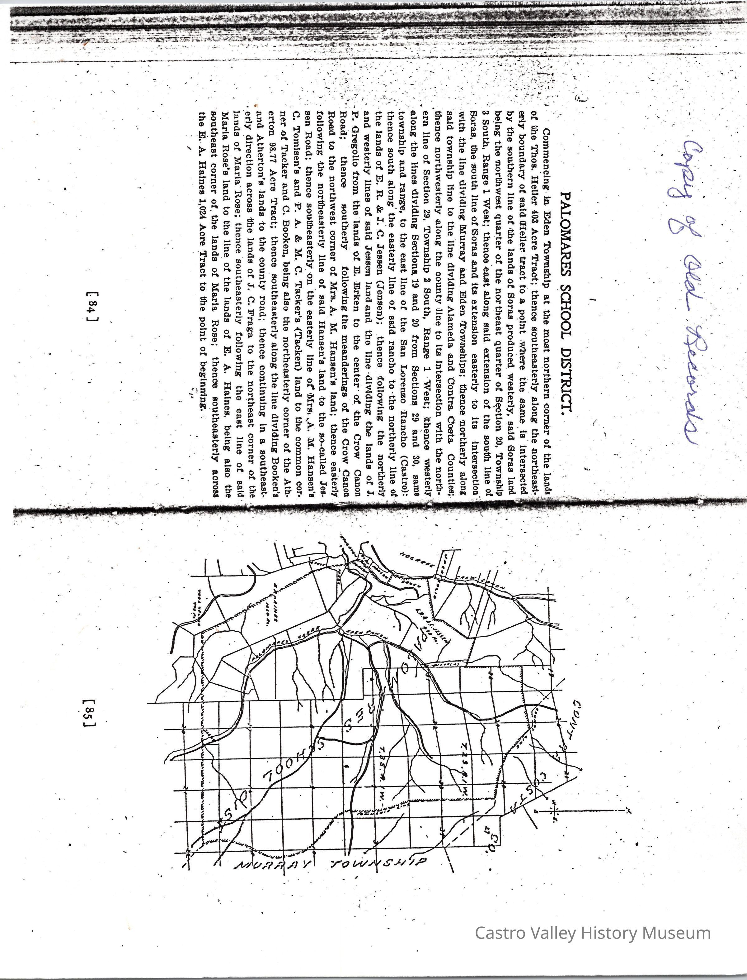 Palomares School District description and map. "Commencing in Eden Township at the most northern corner of the lands of the Thos. Heller 403 Acre Tract; thence southeasterly along the northeasternly boundary of said Heller tract..."Collection