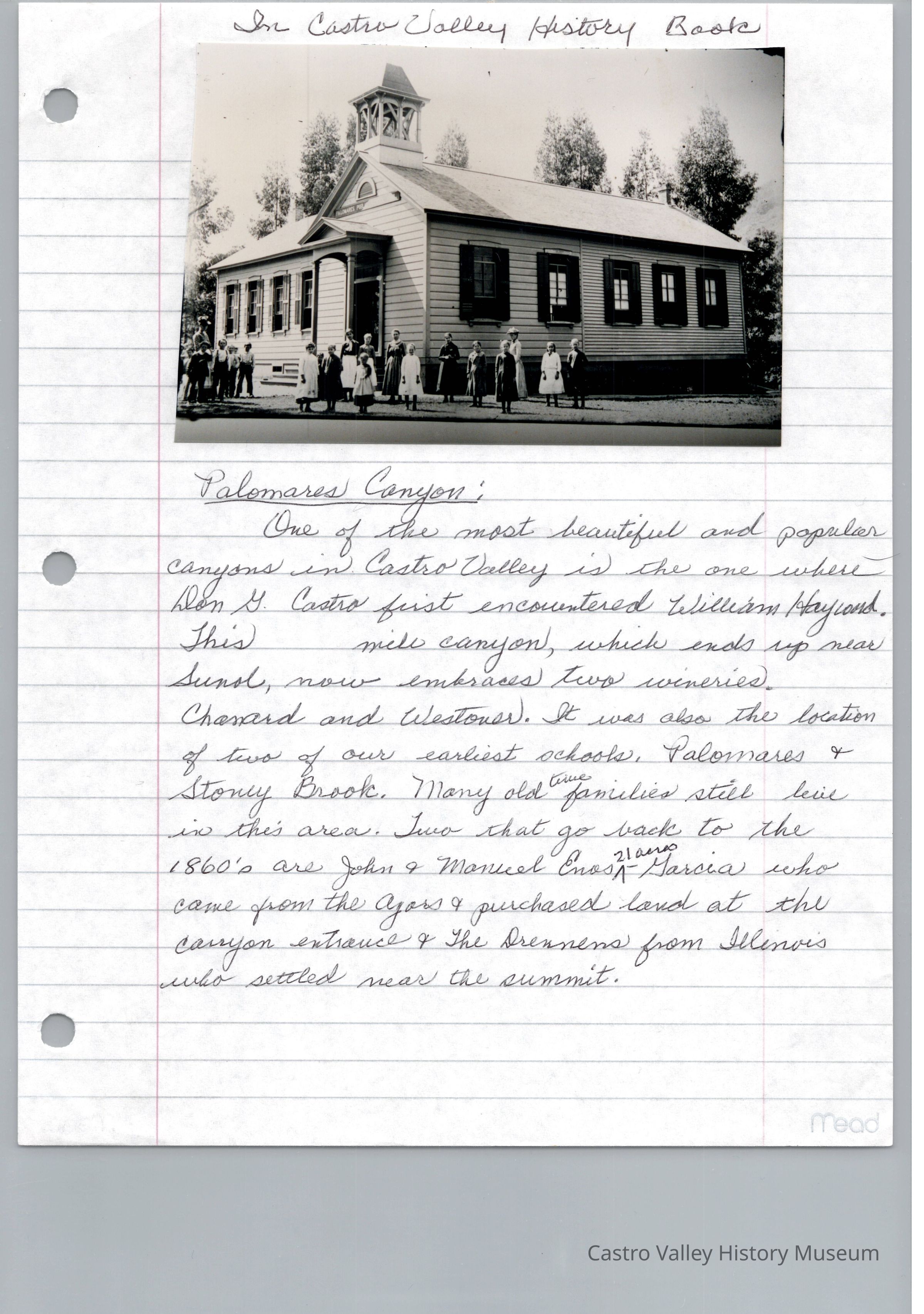 "In Castro Valley History Book" Photograph of Palmores school. Caption: Palomares Canyon. One of the most beautiful and popular canyons in Castro Valley is the one where Don G. Castro first encountered William Hayward...Collection