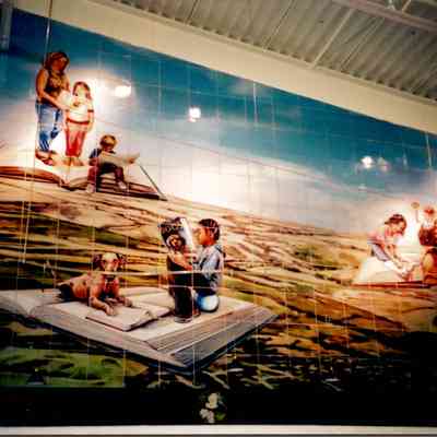 Two photographs of Lucille Lorge in the history area in the Castro Valley Library and one photograph of a mural in the library.Collection