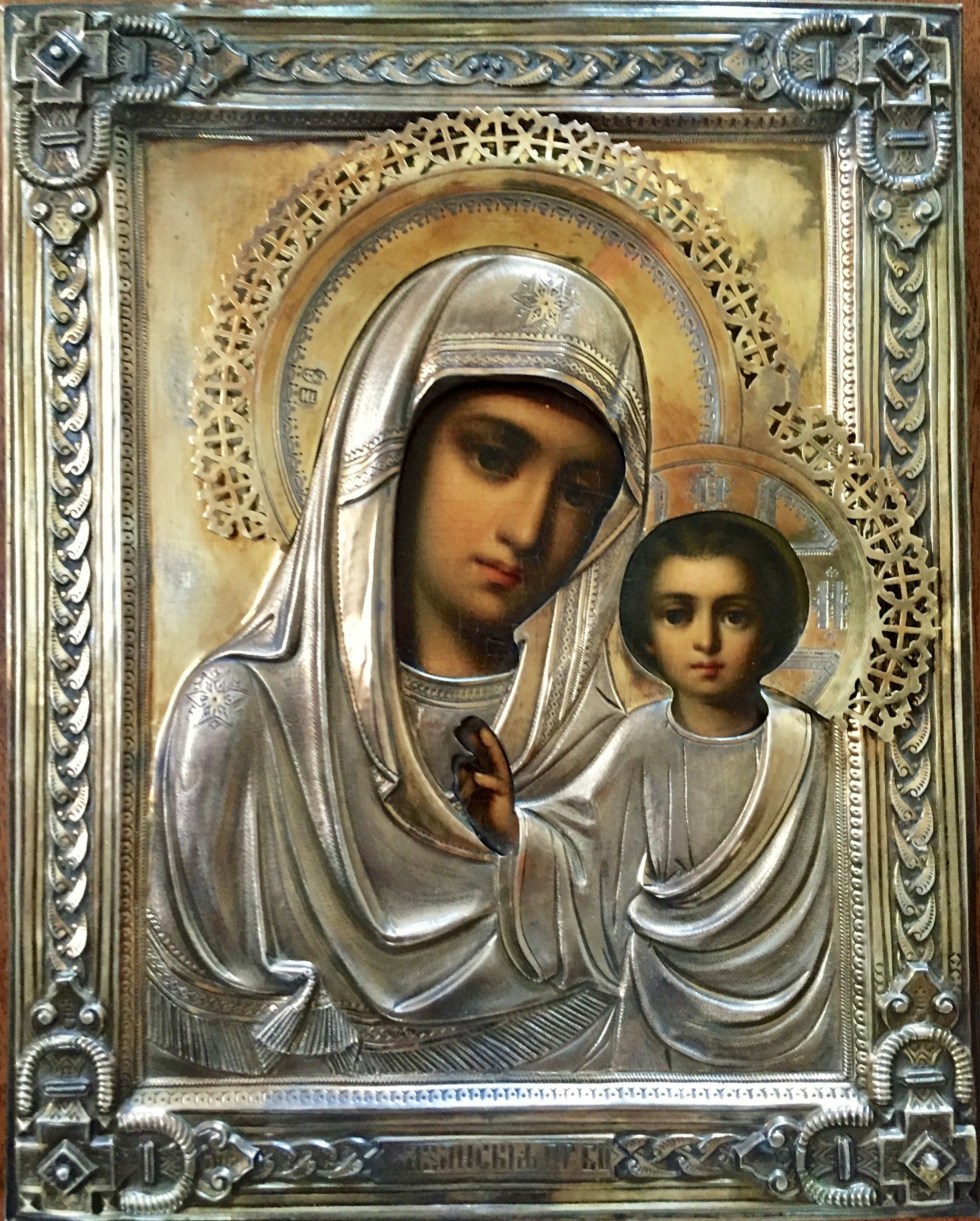 Tempera on gesso on wood board with velvet on back and silver oklad on front