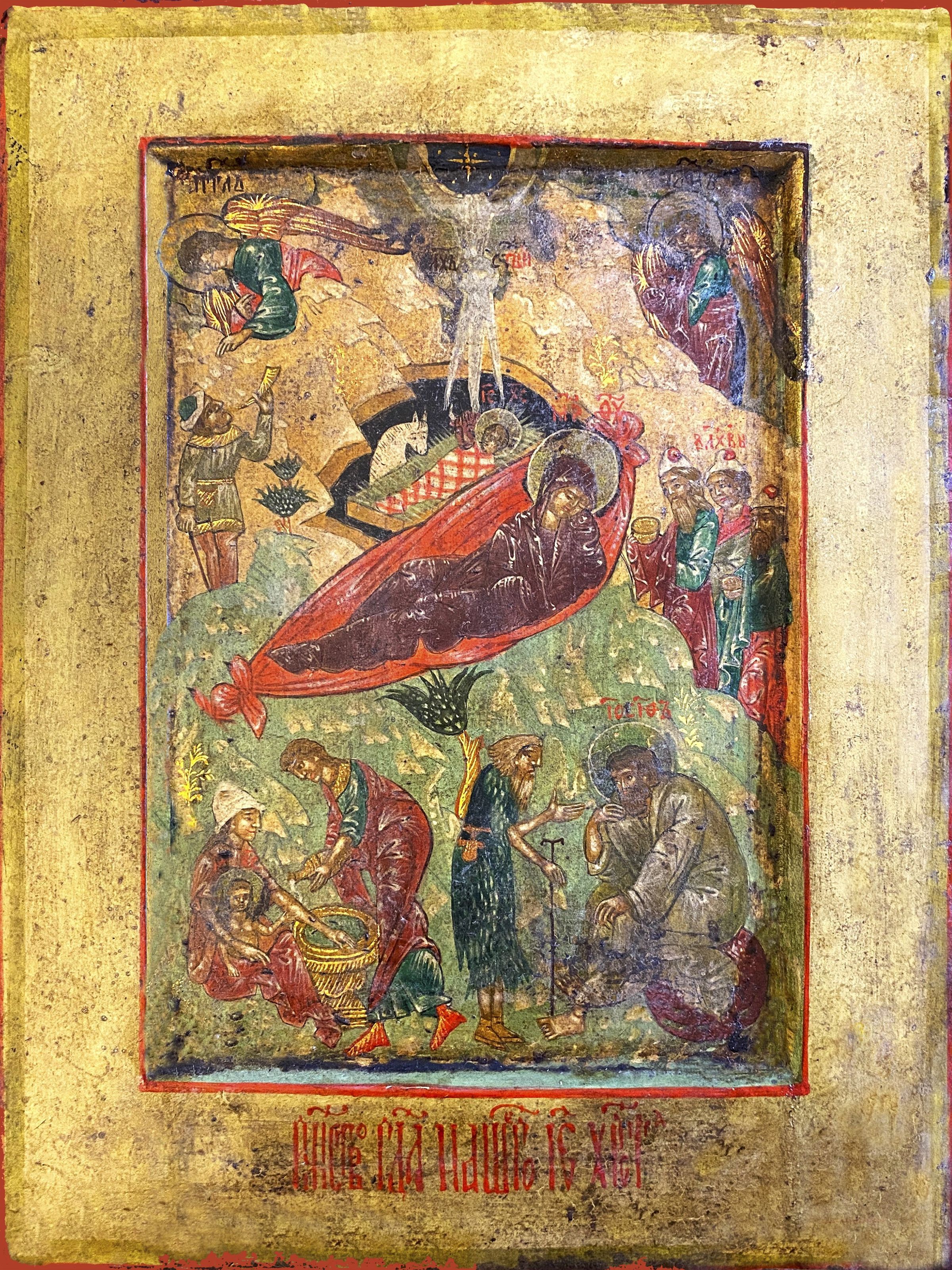 This icon showcases a Nativity scene. In the center, Mary reclines on a vibrant red bed. An angel at top left delivers a message to a shepherd, while Wise men enter from center right. Below, a midwife washes a baby while two old men discuss these events. Natural and celestial elements provide the backdrop; a golden frame enhances the sacred atmosphere. Cyrillic text says The Nativity of Our Lord Jesus Christ.