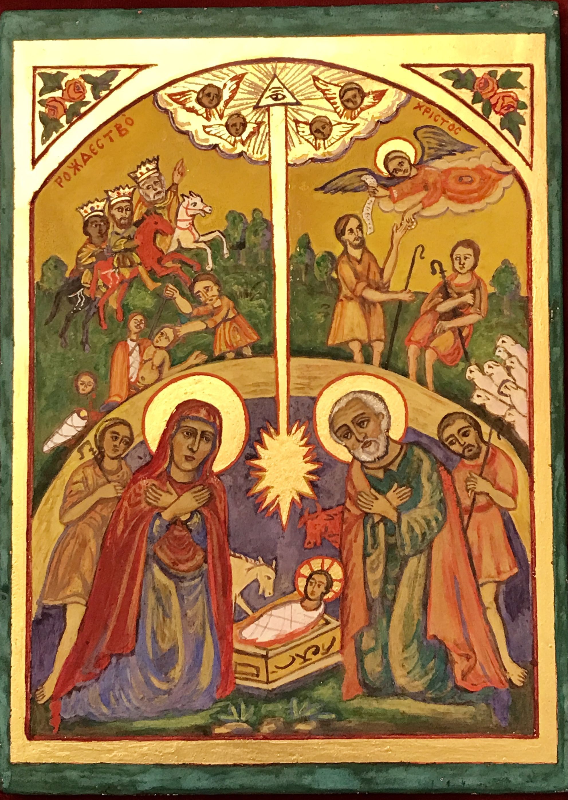 This vibrant modern Orthodox icon depicts the Nativity. The focus is upon baby Jesus in a manger beneath a star, flanked by Mary and Joseph in gestures of reverence, surrounded by shepherds and animals. Above, angels and the three wise men approach under divine light, symbolizing heavenly presence and blessing. Presented in rich colors and traditional style, with ornate details reflecting deep spiritual significance in the Christian tradition, it incorporates symbols like angels, an eye within a triangle, etc.