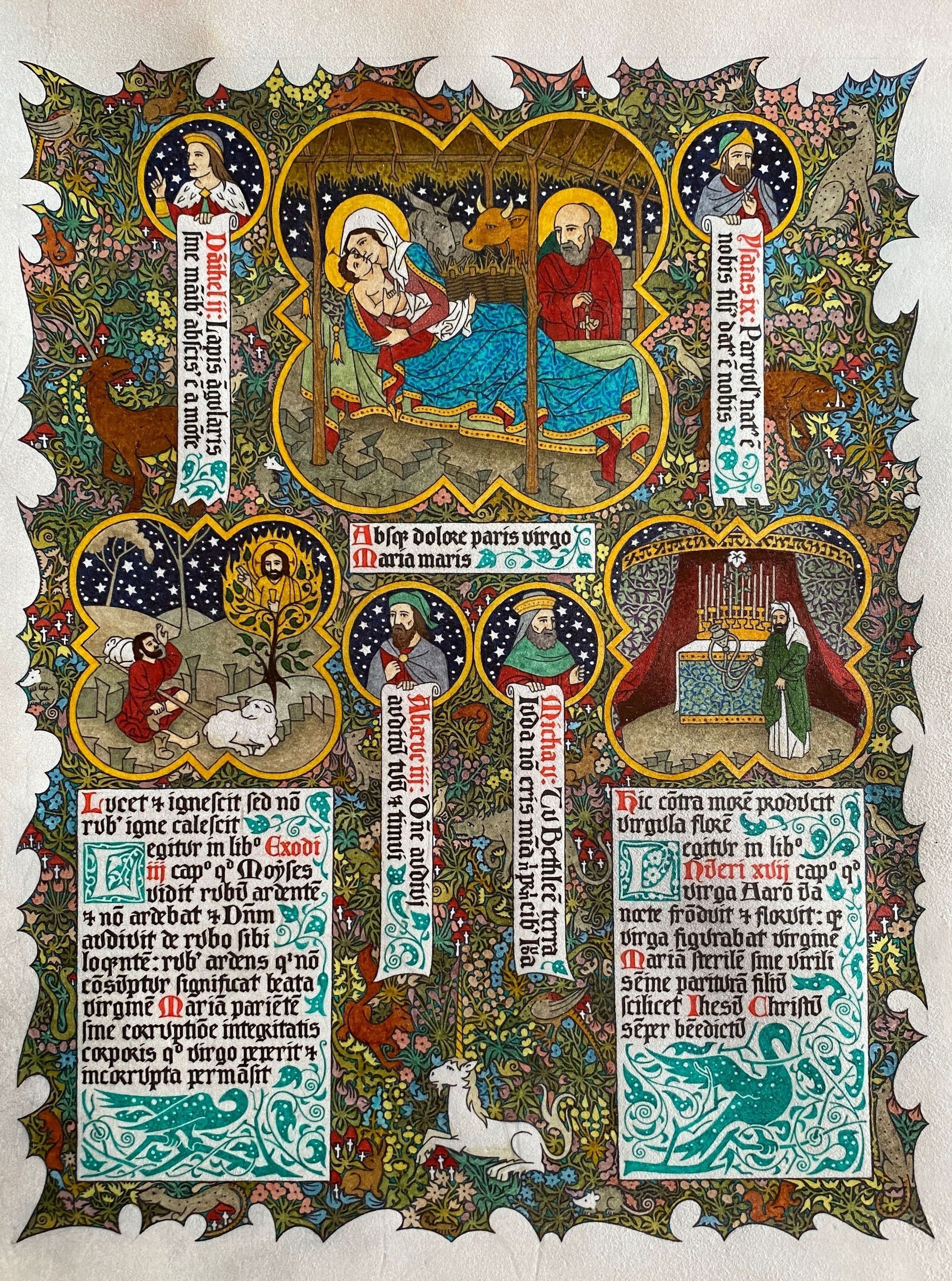 This illuminated manuscript image portrays a Nativity scene set within an intricately detailed and ornate border, where Mary and Joseph are depicted in rich colors, surrounded by animals in a stable under a starry sky, as various biblical figures and scenes are represented within smaller circular frames and elaborate floral patterns adorn the space, featuring Latin text in elegant script with decorative initial letters, seamlessly blending religious symbolism with artistic craftsmanship and reflecting the medieval devotion to religious storytelling through visual artistry and fine detail.