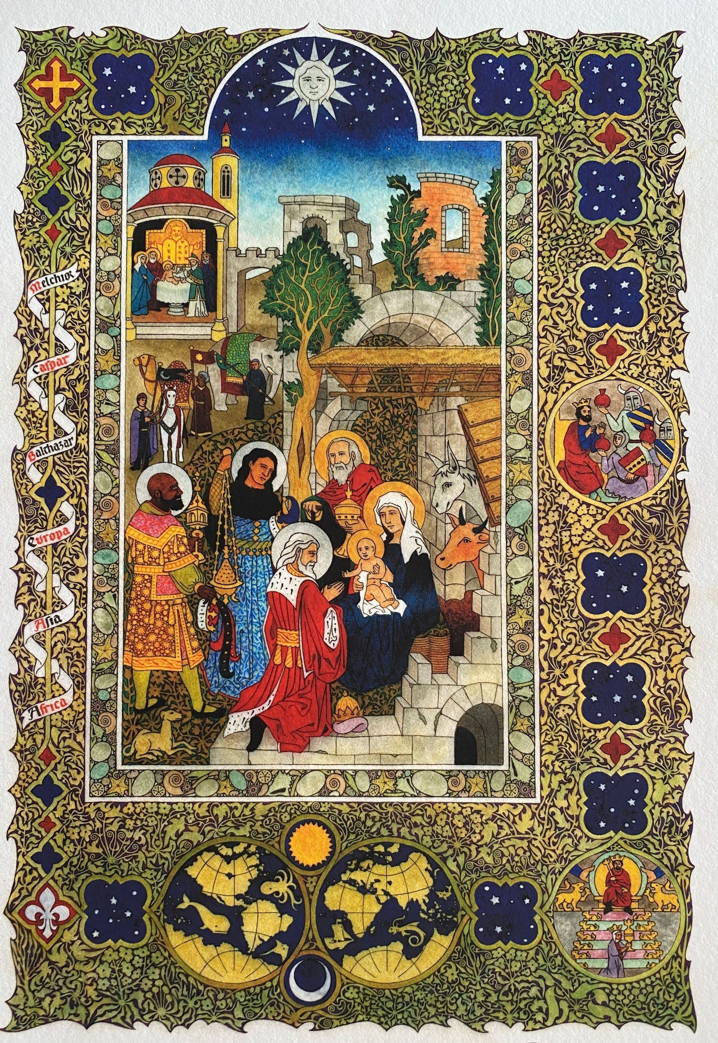 A richly detailed and ornate illustration of the Nativity scene, featuring Mary, Joseph, and the baby Jesus surrounded by the Three Wise Men, who present their gifts in a setting that combines elements of the medieval and the mystical, with vibrant colors and intricate patterns defining the borders adorned with celestial symbols, a sun-faced star, mini maps, and decorative motifs, inviting the viewer into a harmonious blend of historical art and religious storytelling; a tapestry on vellum.