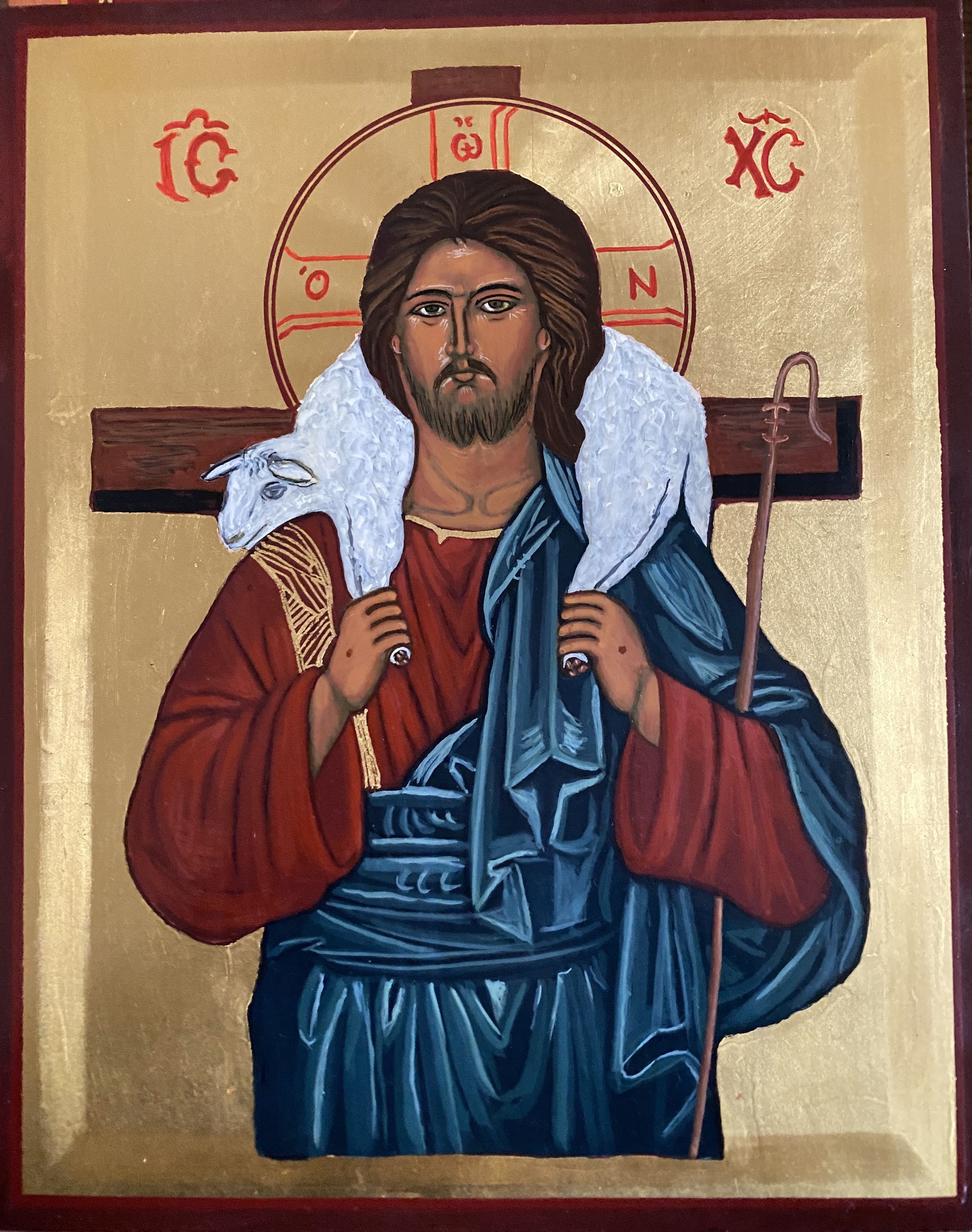 An iconographic painting depicting Jesus, with long brown hair, a beard and a staff, dressed in a red and blue robe, carrying a white lamb on his shoulders symbolizing his protection and guidance; in front of a wooden cross