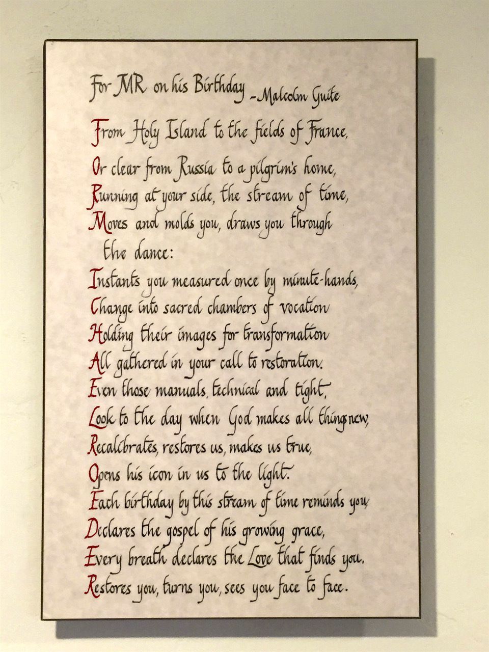 Sonnet written by Malcolm Guite to Michael Roeder, on the occasion of his 65th birthday, ink on vellum, mounted on a board