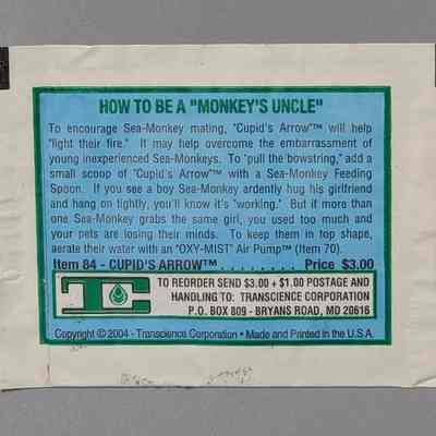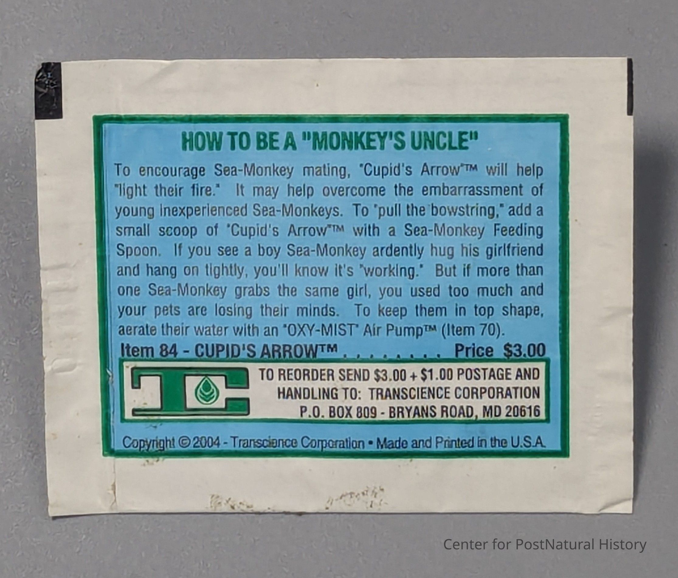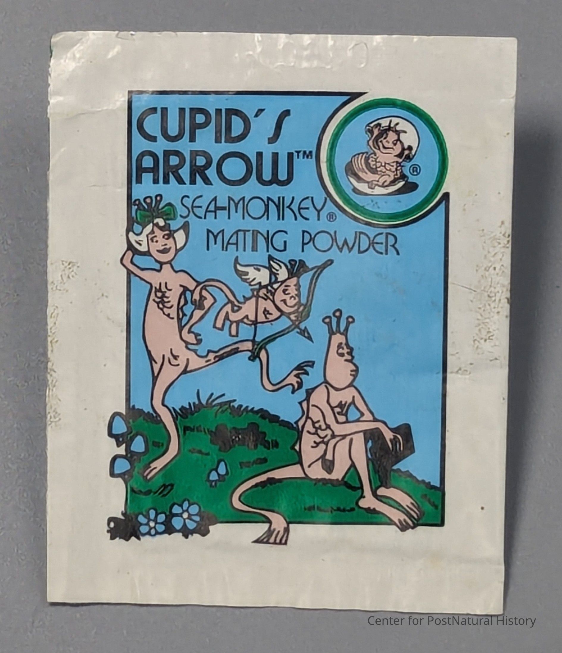 A single packet of "Cupid's Arrow", a sea monkey powder intended to induce mating in a sea monkey aquarium