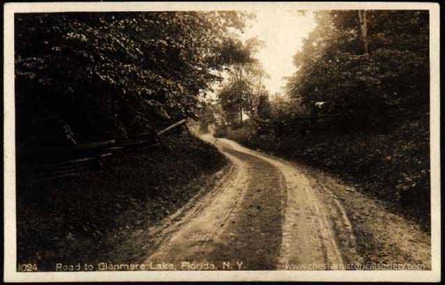 This monochrome photo postcard shows a tranquil, winding dirt road leading through a dense forest, identified as the road to Glenmere Lake, Florida, New York. Surrounded by lush trees and rustic wooden fences, this serene pathway invites viewers into a nostalgic journey through a natural landscape, reflecting the quiet beauty and simplicity of early 20th-century rural America.
