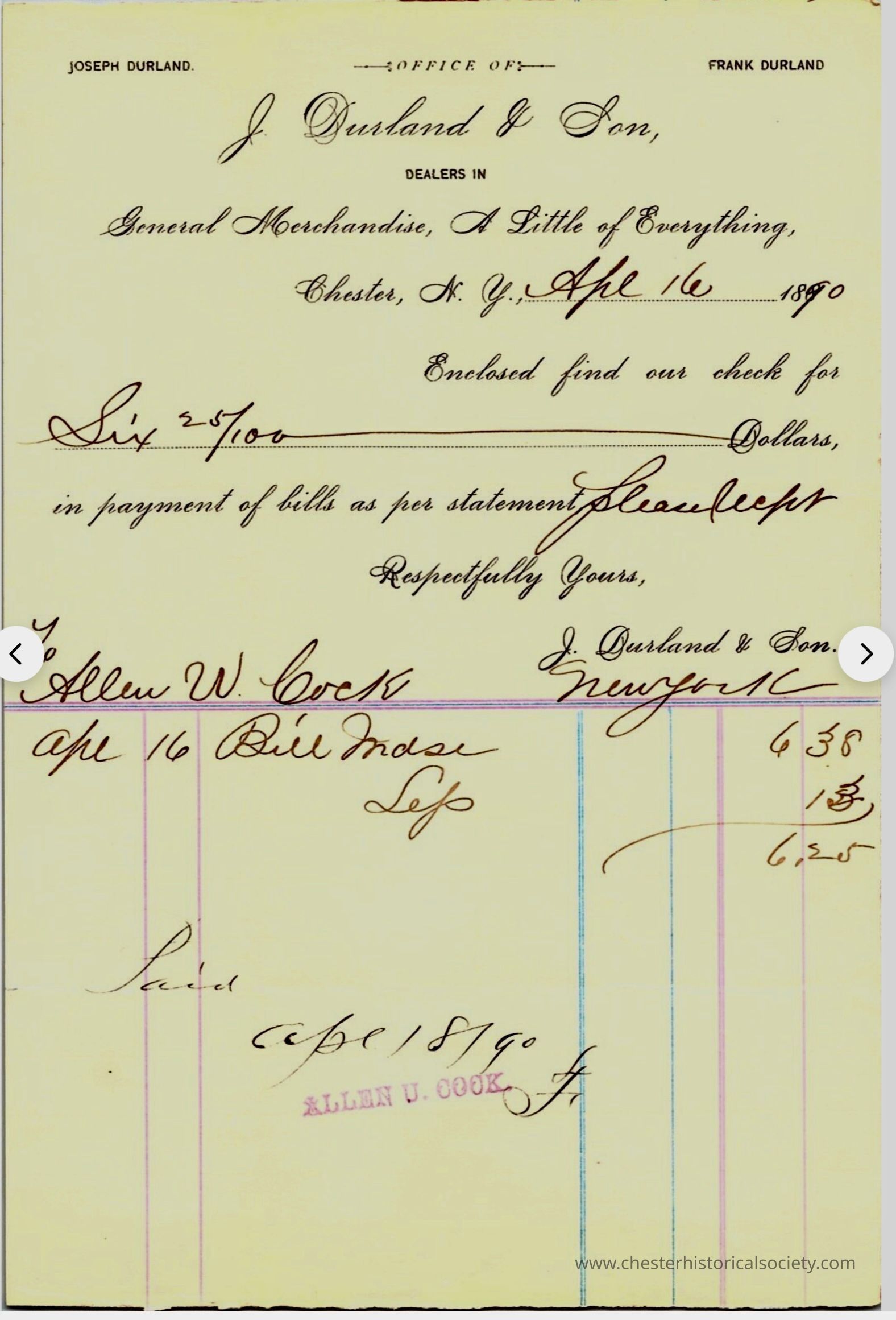 The image displays an old letterhead from the office of J. Durland & Son, dealers in general merchandise and described as having "A Little of Everything," located in Chester, N.Y. The date on the document is April 16, 1890. The letter indicates that a check for six dollars and 25/100 has been enclosed, intended for the payment of bills as per a statement. The recipient is asked to kindly accept it, and the letter is signed "Respectfully Yours," with reference to Allen U. Cook, whose signature is included. The bottom section contains handwritten figures and notes, with a calculation summing to 6.25 dollars. The document is marked as paid on April 16, 1890, and features the stamp of a person named Allen U. Cook.