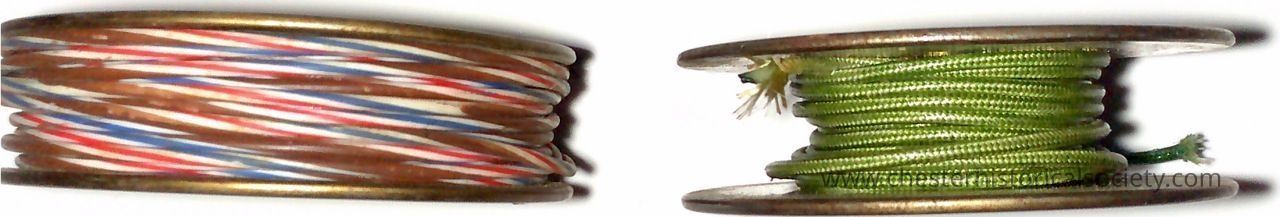 Two each Chester Cable Wire Spools, both 22 gauge: one sheathed green & cloth; the other sheathed in red-white-blue-white-brown-white Plasticote.Collection