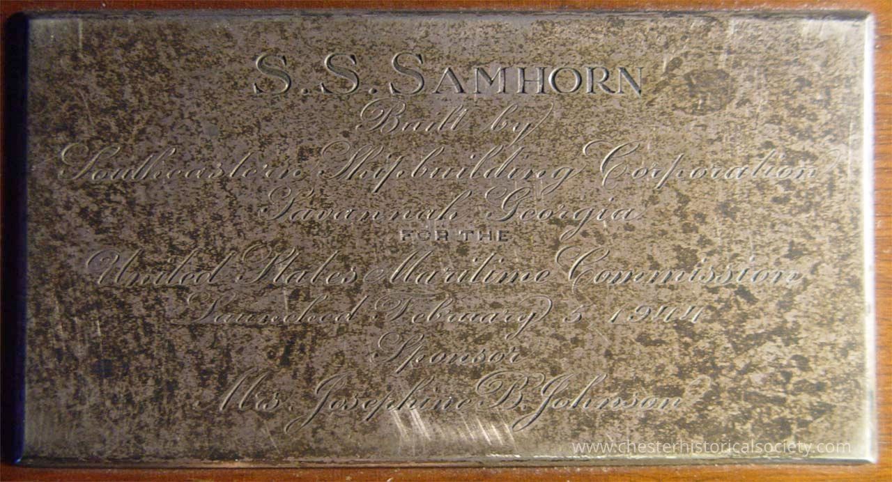 Josephine Board Johnson of Chester christened the Liberty Ship "SS Samhorn" on 5 February 1944 at the Southeastern Shipbuilding Corporation Shipyard in
