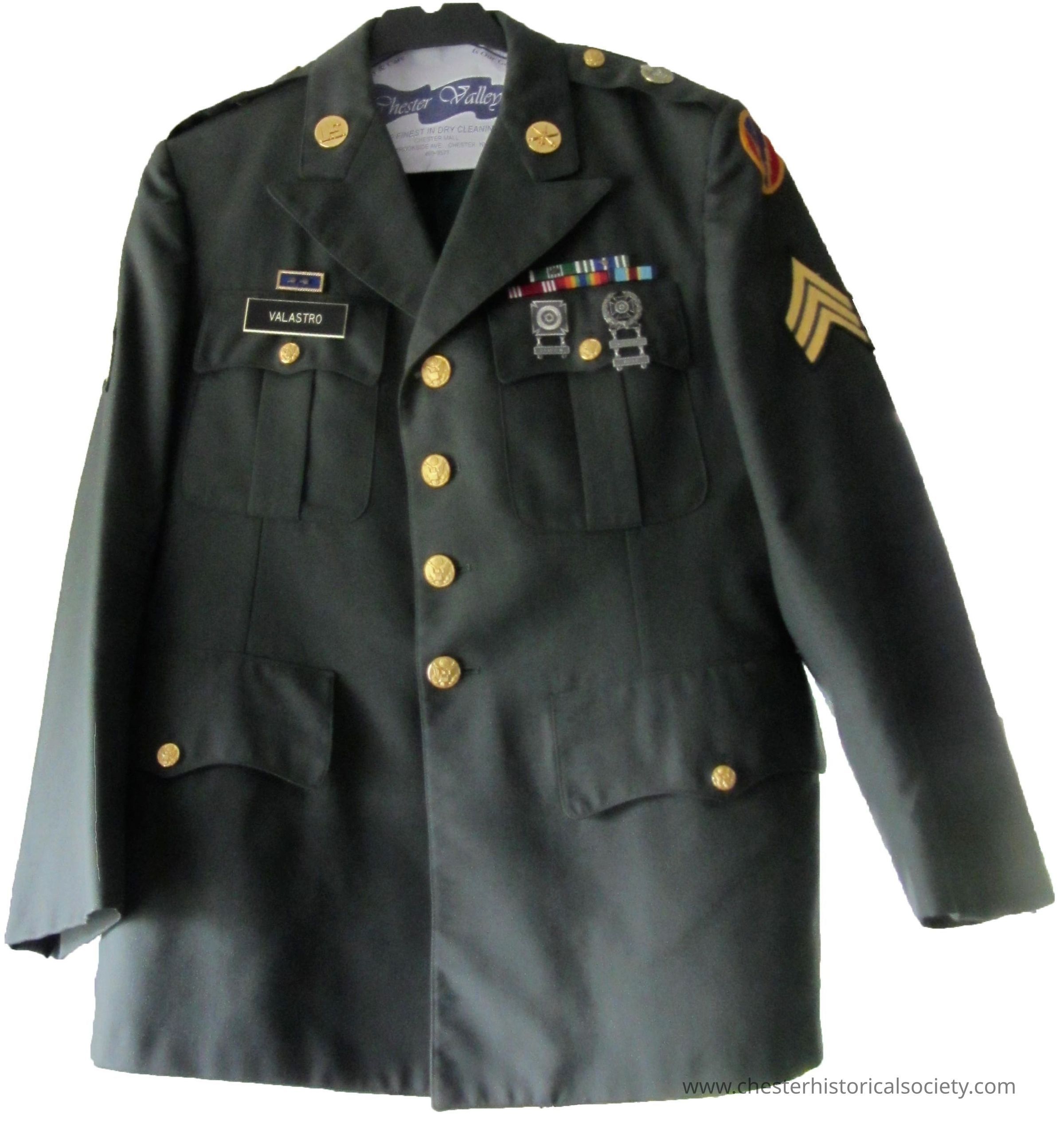 Phil Valastro's Army Uniform Class A uniform jacket, displaying a dark green color with gold buttons and various patches and insignia on the chest and sleeves, including a name tag labeled “Valastro," colorful ribbons, and sergeant stripes on the sleeve, all contributing to the formal appearance typical of ceremonial or official military attire, characteristic of armed forces presentation in solemn or official events, highlighting rank, achievements, and affiliations, serving as a representation of service and identity within the military framework.Context