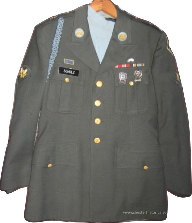 Gary Schultz's Army Uniform dress jacket on a hanger, adorned with patches and badges. Gary's 1960s period uniform was displayed in the 2013 "Those Who Served" Exhibit. (Background removed from image).Acquisition