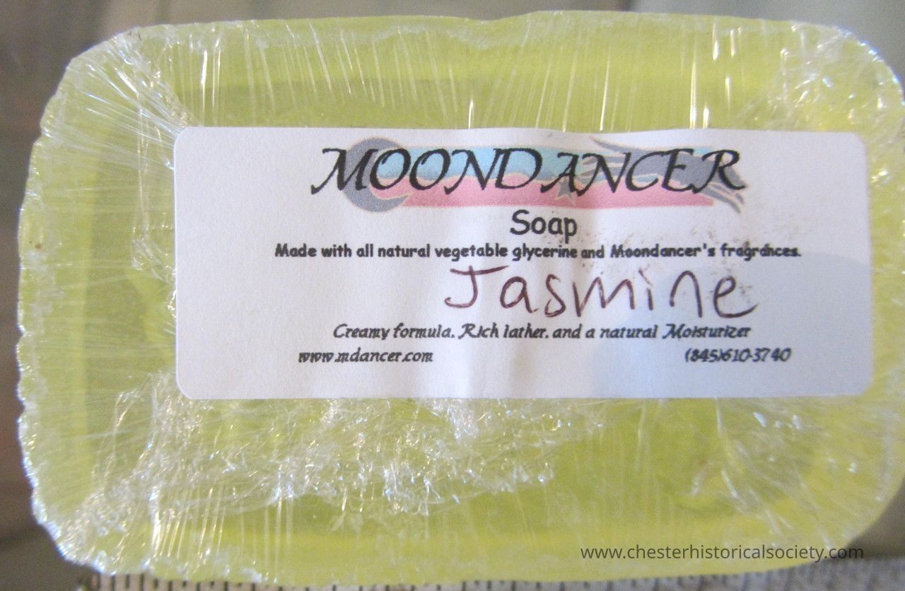 A rectangular bar of Jasmine Moondancer soap, labeled as jasmine-scented, wrapped in clear plastic packaging for protection.Acquisition