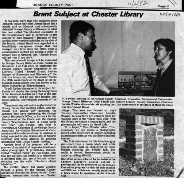 At a recent meeting of the Orange County American Revolution Bicentennial Commission, Orange County Historian Cohn Faulds and Chester Library History Committee Chairman Loretta Winkler discuss his talk marking the 175th anniversary of the death of Mohawk Indian war chief Joseph Brant.Transcriber