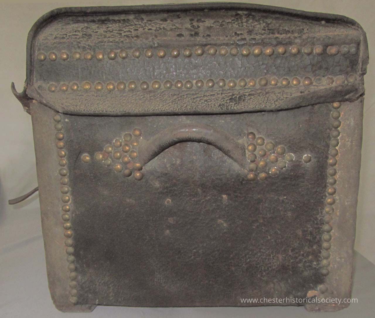Leather Covered Trunk for traveling found by Marcella K. Hopwood in the attic of Frank & Stella Muruski house when she was a child. Frank & Stella Muruski were Marcella's godparents. Local lore is that this was Thaddeus Seely's Leather Covered Travel Trunk. One Thaddeus Seely, born 1738 built the house, circa 1754. Note a number of other Thaddeus Seely's have lived in Chester: (birth & death dates) 1756-1832, 1765-1829, 1782-1841, 1822-1864, 1833-1861.