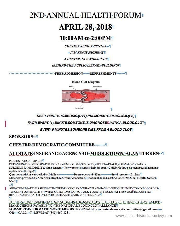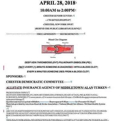 A flyer for the 2nd Annual Health Forum held on April 28, 2018, from 10:00 AM to 2:00 PM at Chester Senior Center in Chester, New York. The event offers free admission and refreshments and features a discussion on topics like deep vein thrombosis, pulmonary embolism, strokes, heart attacks, surgeries, and immobility. Sponsored by the Chester Democratic Committee and Allstate Insurance Agency of Middletown/Alan Turken.Category
