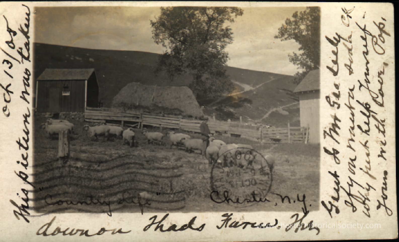 This monochrome photo postcard depicts a rural scene with Mr. George Seely tending sheep near several structures, including barns, against a backdrop of distinct verdant hills on Thad's Farm (Likely Thaddieus Seely Durland's Mountain View Daity Farm near the Seely Cemetery overlooking the Seely Creek.). The foreground shows penned sheep and sections of handwritten text superimposed on the landscape, suggesting annotations like a postcard or correspondence. The vintage aesthetic and composition capture a tranquil pastoral life, dated 1905. The address side features a green one-cent stamp depicting Benjamin Franklin with a postmark from Chester, New York, dated 1907. The address is scribbled in elegant cursive, addressed to Miss Hazel Dell Masterson at an address in New York City.Subject Person/Organization