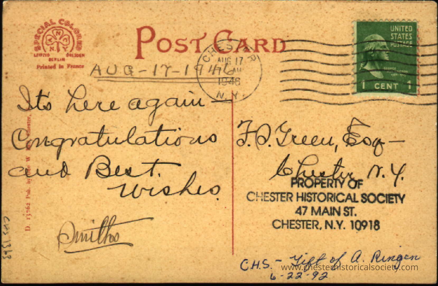 This colorized photo postcard depicts a serene, tree-lined South Main Street in Chester, New York, captured in a vintage postcard style; an old-fashioned automobile drives down the dirt road, flanked by lush foliage and periodic residential structures. The image shows an old postcard mailed August 17, 1946, featuring a handwritten message of congratulations and best wishes. The postcard has a one-cent stamp and is addressed to J.D. Green, Esq. in Chester, New York. It also includes a note indicating that the card is the property of the Chester Historical Society in Chester, New York. The location appears to be looking north up Main Street towards "Durland Square" from East Chester.Subject Person/Organization