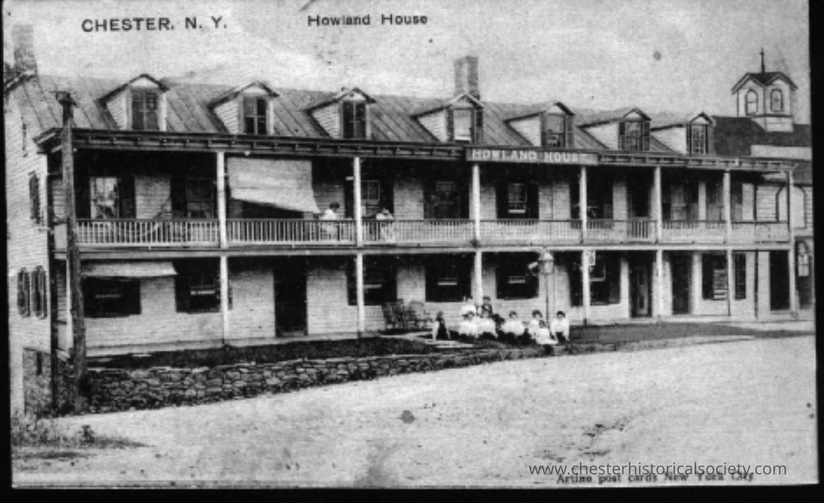 Undivided back real photo post card of Howland House, Chester, Orange County, New York. A sign saying "HOWLAND HOUSE" is clearly visible above the second story porch. A second sign can also be seen on the roof at the far right just below the cupola, reading "LIVERY SALE BOARDING". The white-shirted group of people sitting on the lawn in front of the hotel appears to be the staff posing for the camera. The Howland House is shown on the 1903 Orange County Atlas as being situated across from the Erie Railroad Station at Chester. It was owned at that time by Hinchcliffe Bros., and C.G. Baldwin is noted as the Proprietor.